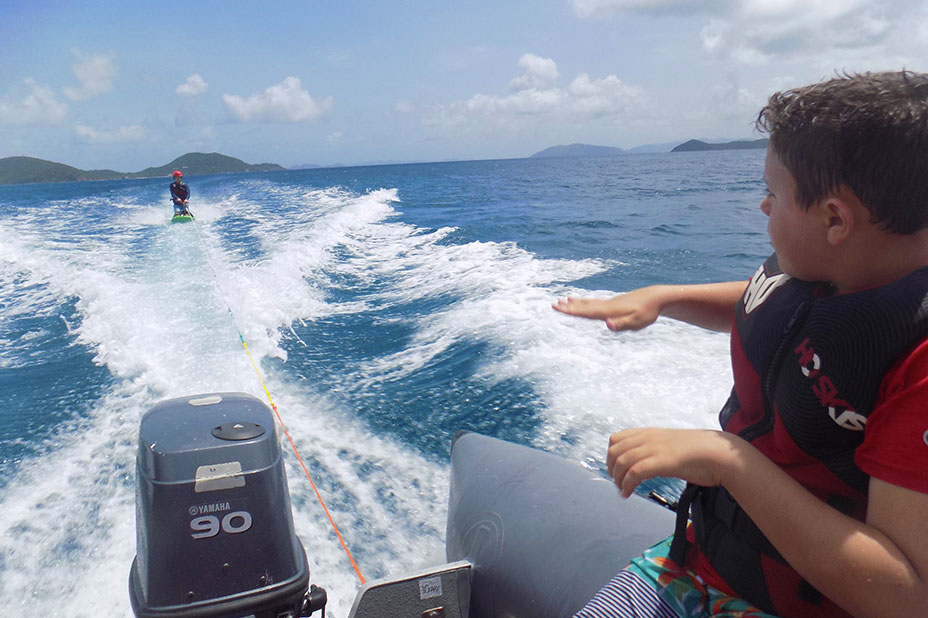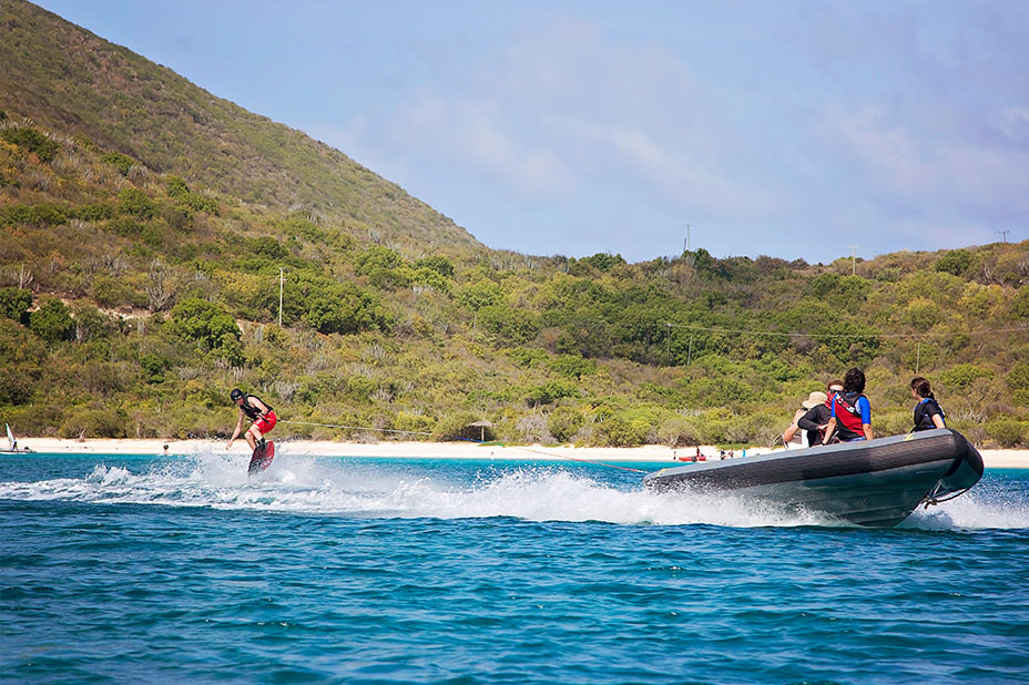 Here in the BVI we travel with a full set of watersports equipment. We have six rib dinghies that are perfect for skiing so everyone gets to try wakeboarding and water skiing for the first time or master a few tricks and learn to slalom! Over the last 30 years, we have taught thousands to ski, wakeboard and kneeboard on our outdoor adventure camp.