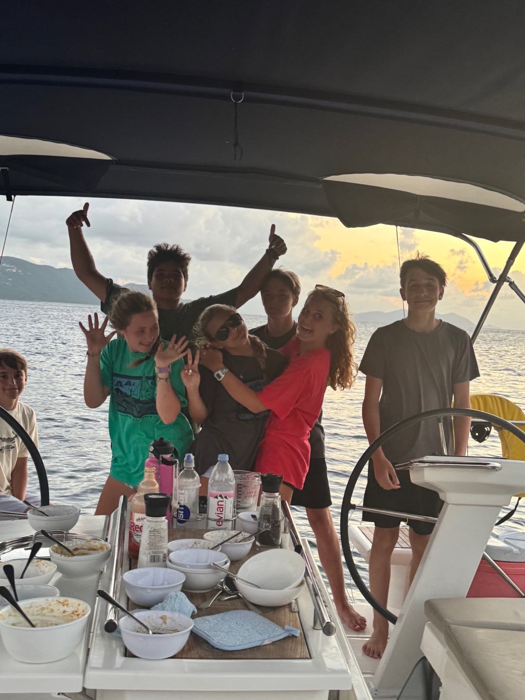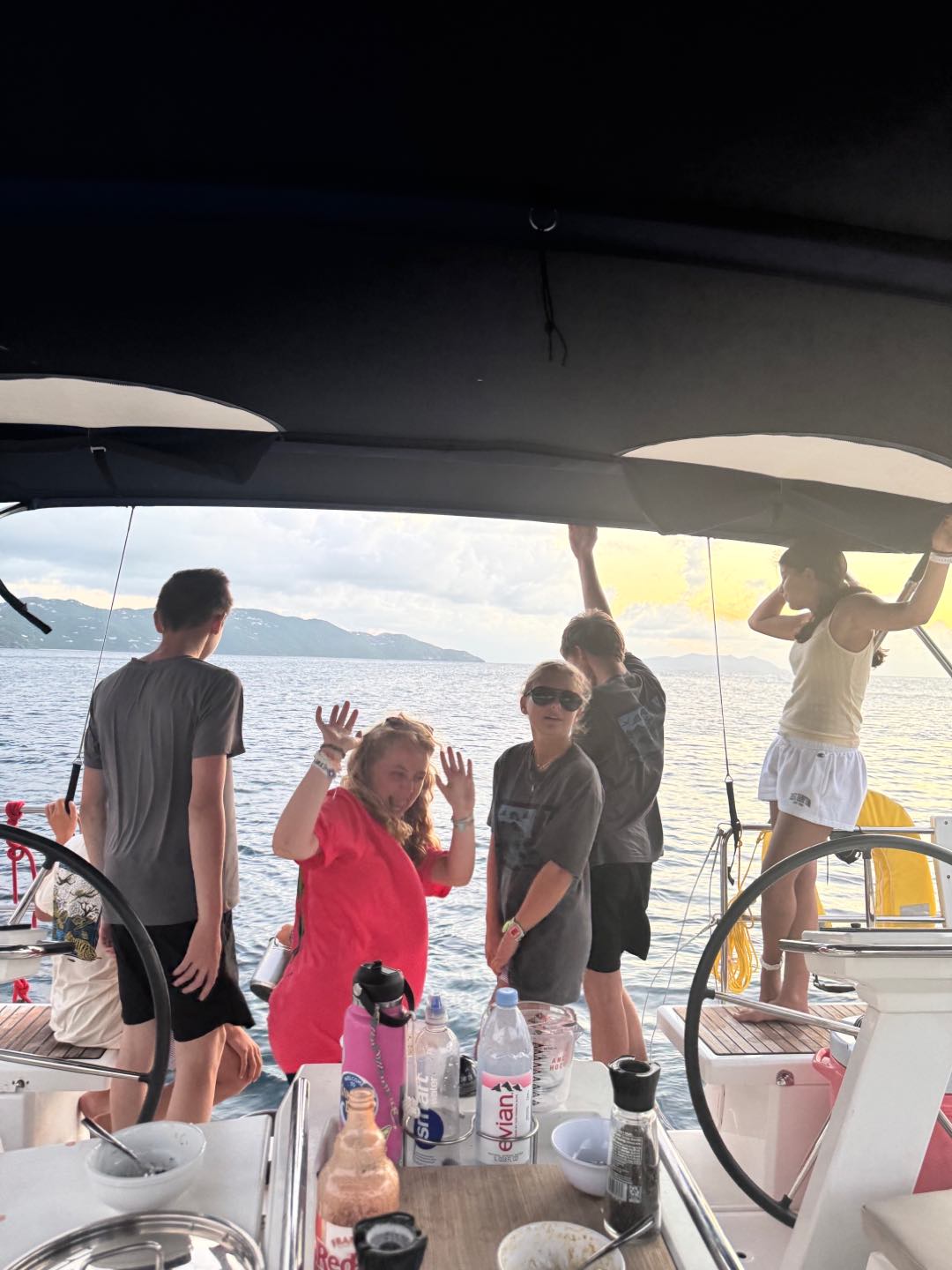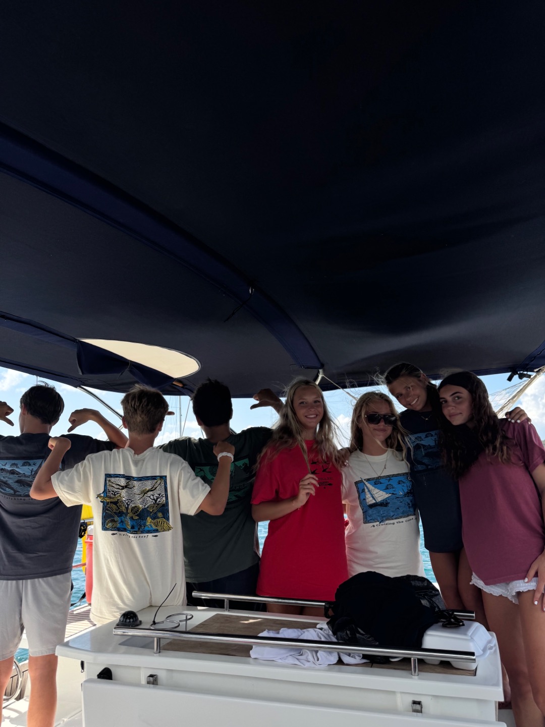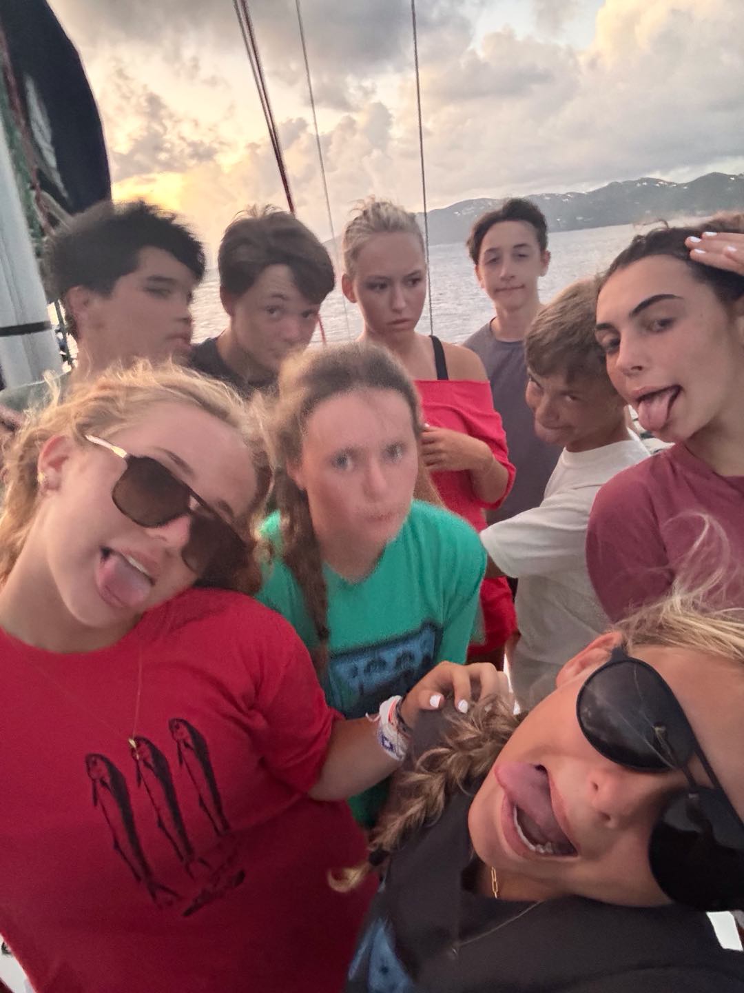 Once back, we all did hauls of our shopping to each other and put on our matching tees. We proceeded to sail again, while Jorge helped around. Poppy and I were inside having deep conversations with Max and Xavi. Once we got there, we took ocean showers, which was funny. Then Siena put on Disney music while Toby sang while cooking us food. Then we had a tikamasala for dinner. We did squeeze, and the question was if you had to give the person next to you a nickname, what would it be? Los extraño ya casi regreso y soy la unica q no le a picado un jellyfish deseame suerte.Dice Xavi que los quiere y extraña a Luca . Aliya says she misses Mia and is excited to talk to y’all soon