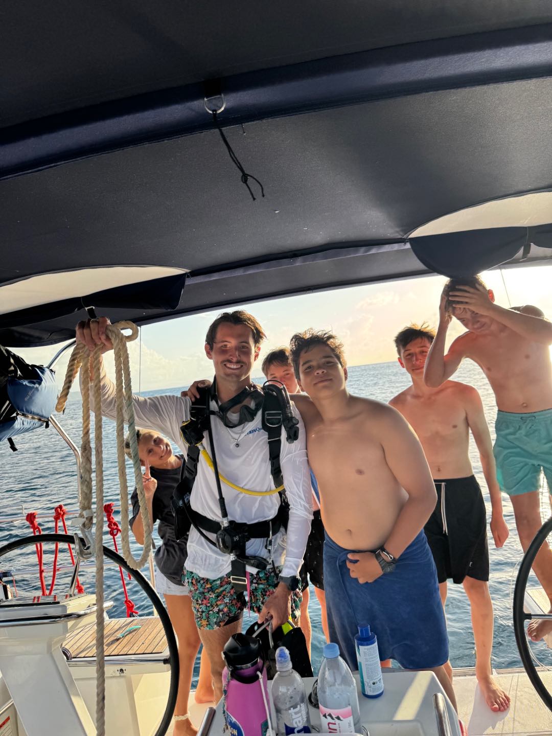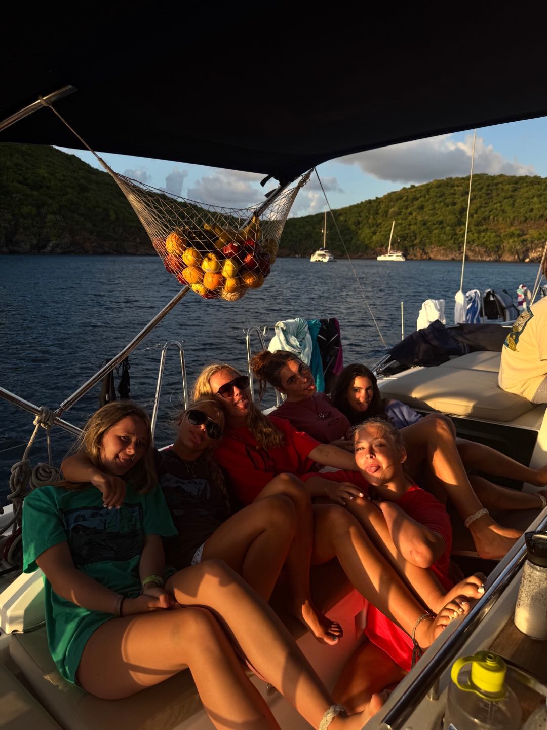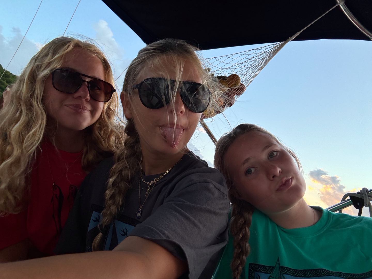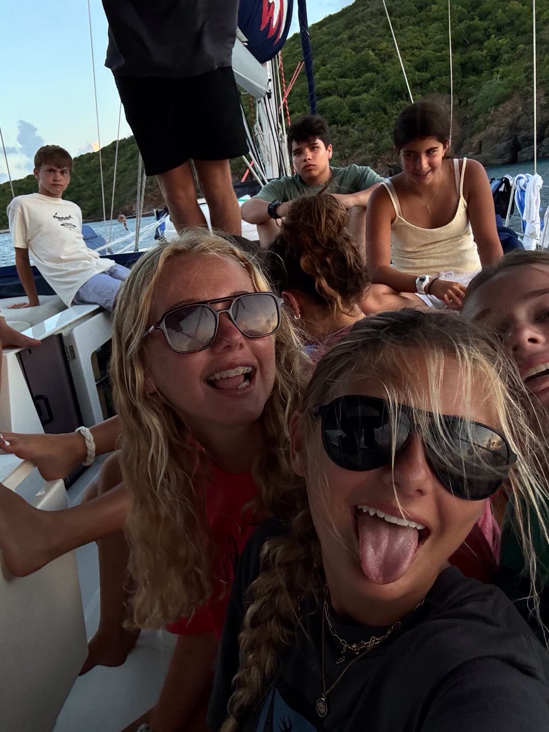 Once back, we all did hauls of our shopping to each other and put on our matching tees. We proceeded to sail again, while Jorge helped around. Poppy and I were inside having deep conversations with Max and Xavi. Once we got there, we took ocean showers, which was funny. Then Siena put on Disney music while Toby sang while cooking us food. Then we had a tikamasala for dinner. We did squeeze, and the question was if you had to give the person next to you a nickname, what would it be? Los extraño ya casi regreso y soy la unica q no le a picado un jellyfish deseame suerte.Dice Xavi que los quiere y extraña a Luca . Aliya says she misses Mia and is excited to talk to y’all soon