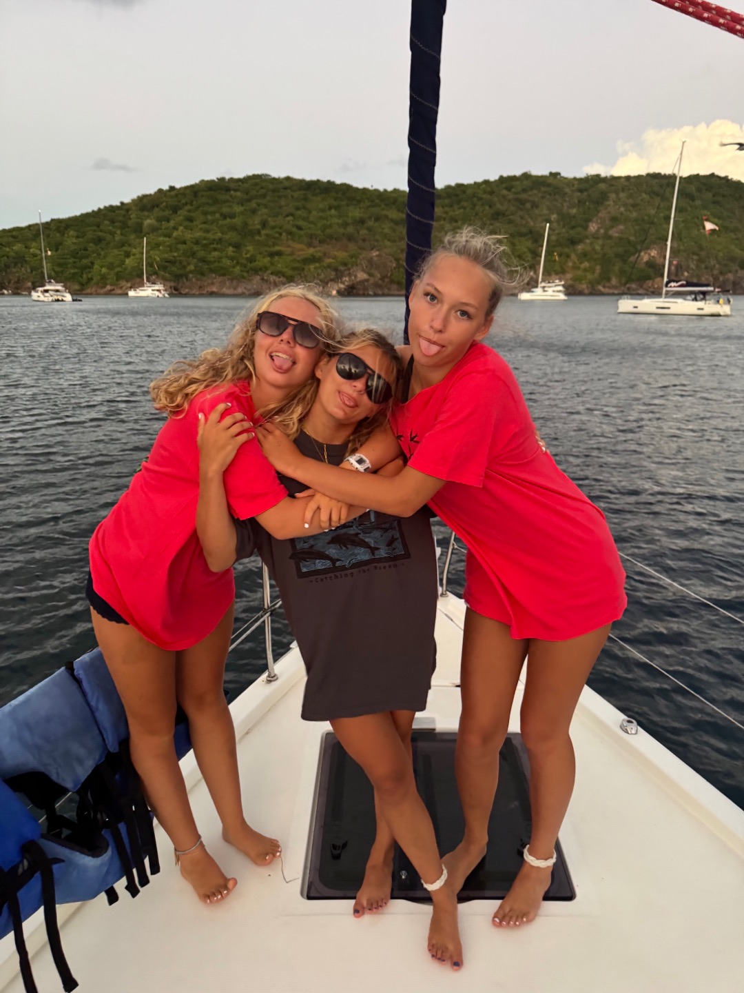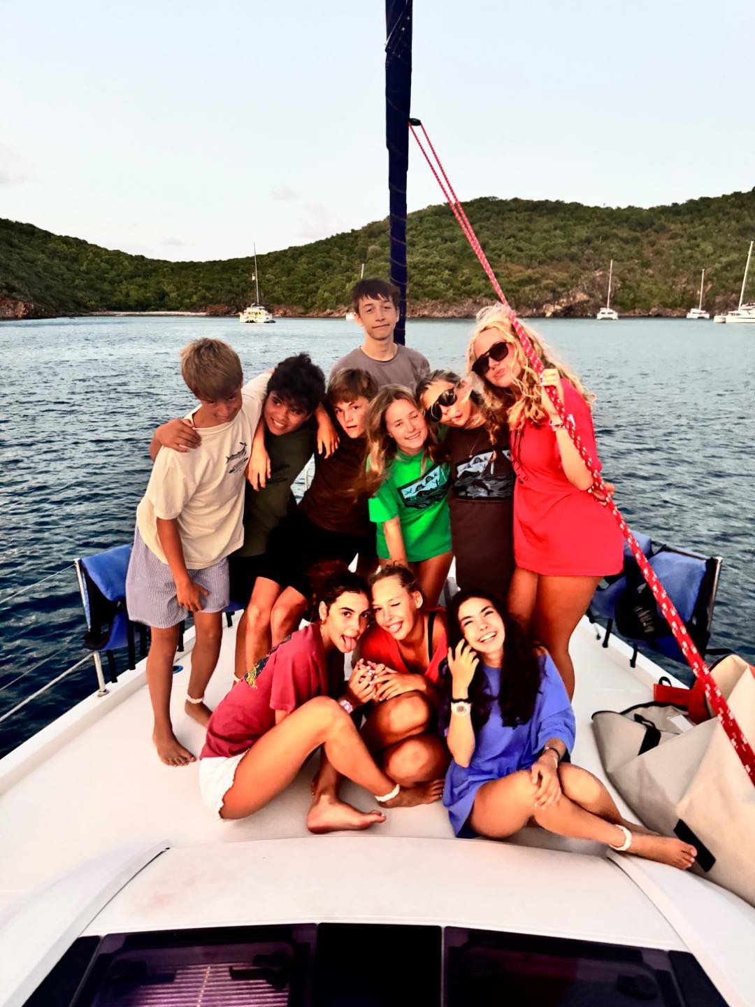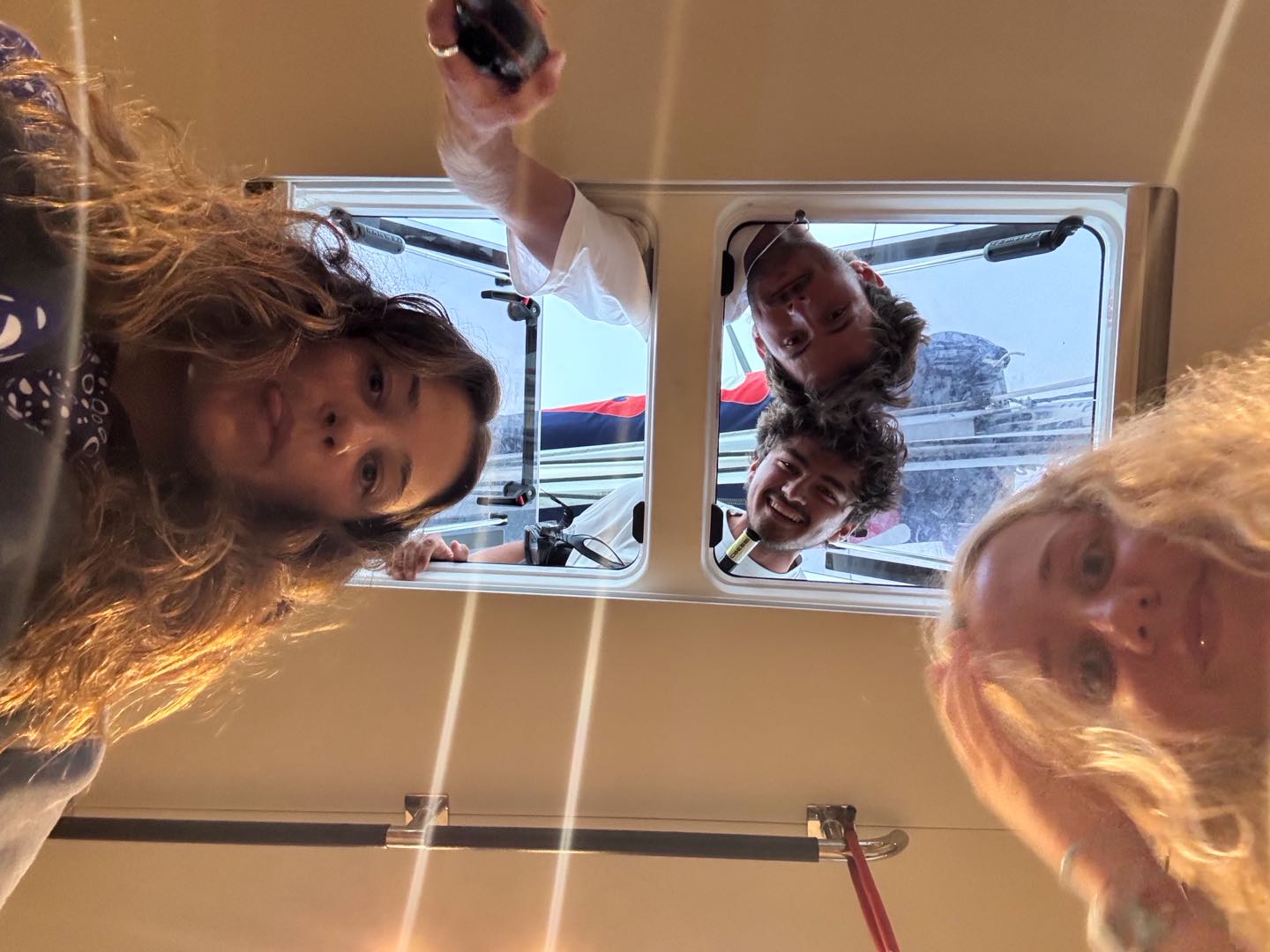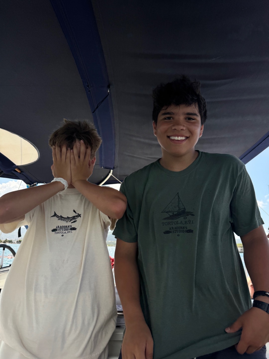 Once back, we all did hauls of our shopping to each other and put on our matching tees. We proceeded to sail again, while Jorge helped around. Poppy and I were inside having deep conversations with Max and Xavi. Once we got there, we took ocean showers, which was funny. Then Siena put on Disney music while Toby sang while cooking us food. Then we had a tikamasala for dinner. We did squeeze, and the question was if you had to give the person next to you a nickname, what would it be? Los extraño ya casi regreso y soy la unica q no le a picado un jellyfish deseame suerte.Dice Xavi que los quiere y extraña a Luca . Aliya says she misses Mia and is excited to talk to y’all soon