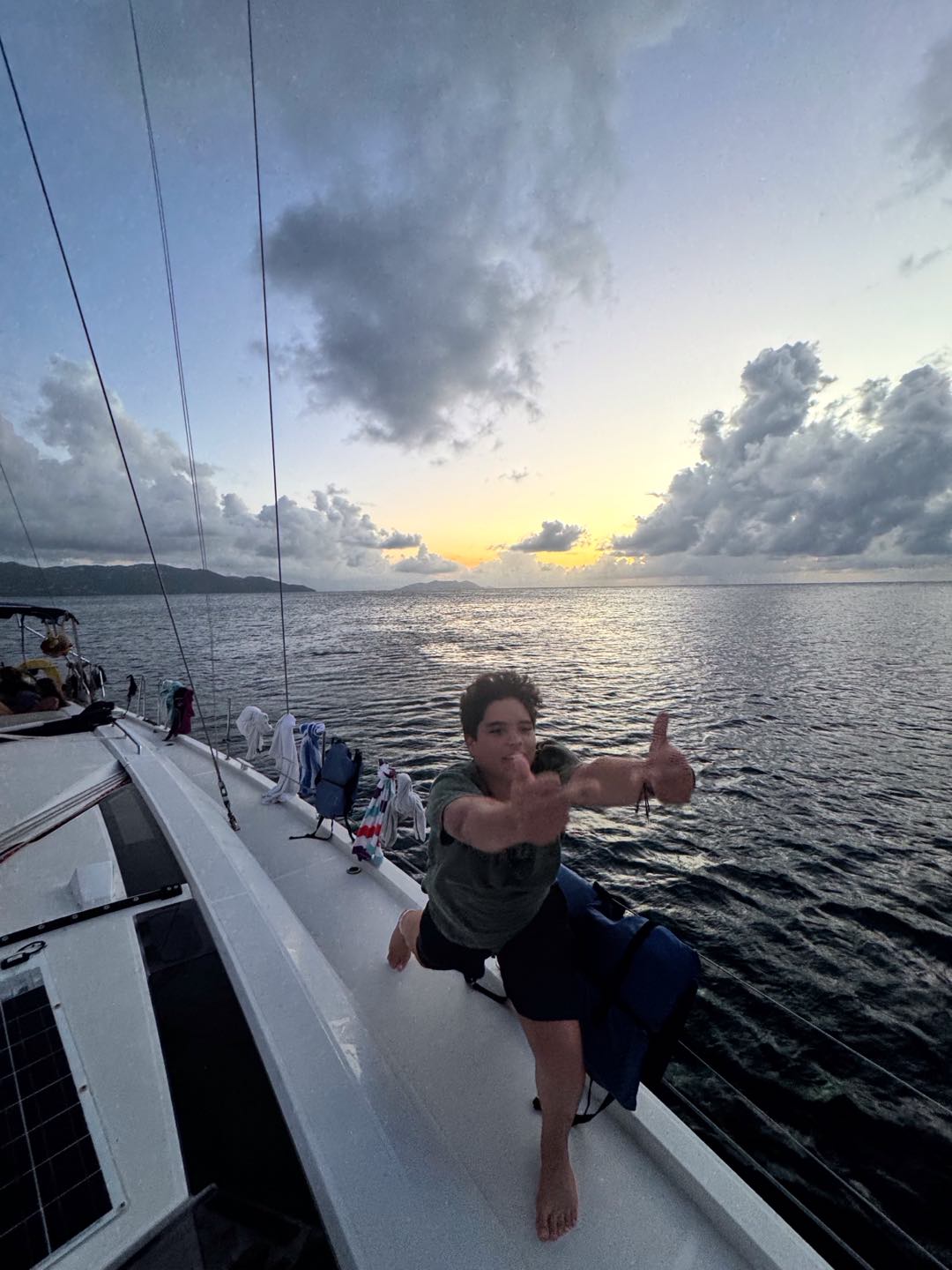 Hello parents, today was a very good, relaxing, chill day. First, we woke up almost everybody sleeping in the living room, and they woke us up with a Rio song. Bea and Lulu made us pancakes and cut up food for us. While Aliya, Jorge, Lulu, Max, and Xavi played card games, Lulu won. After that, we sailed to get water, and while sailing for the first time, it was great. Zach was deckie and cleaned the deck. Then, we finally got to the land for the first time in many days, which was very fun because we were with the boats from all of sail side.