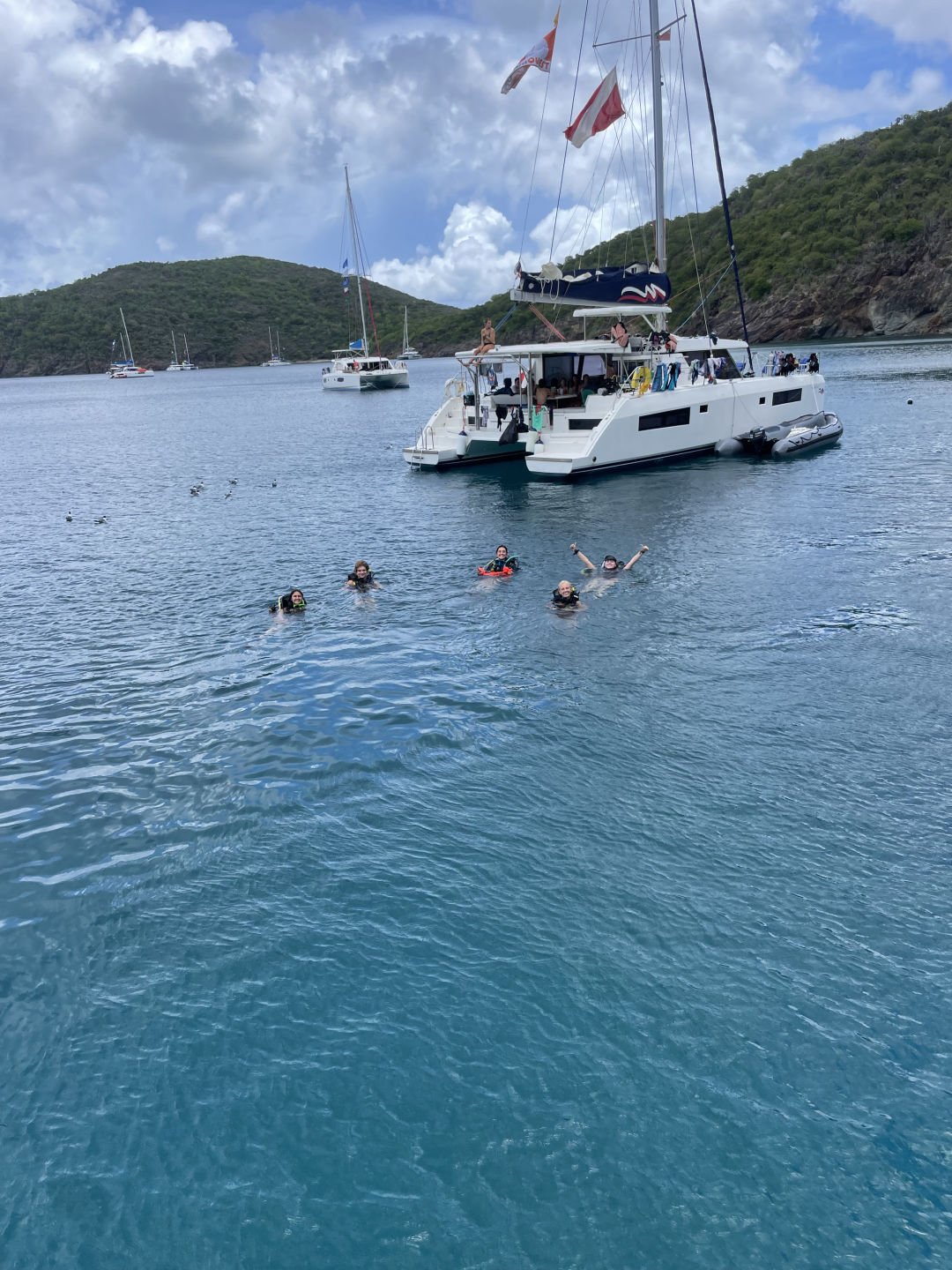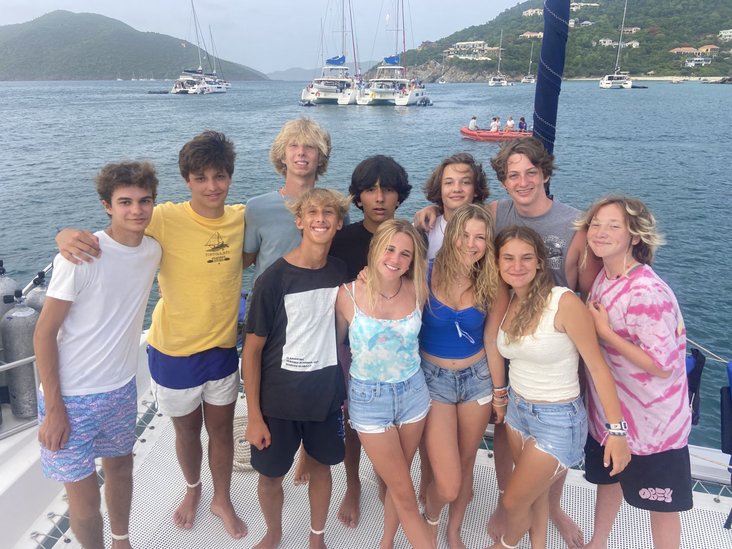 Today we woke up to the Circle of Life from The Lion King and started our day off well, except for me, because I found gum in my hair after sleeping on the bench outside. To deal with that, I went to Anya, who helped me get it out with peanut butter which surprisingly worked. On top of that, we found out that one of the other boats on Sail Side A had pranked us by putting all of our PFDs on the mast of our catamaran, which we all laughed about. Gary made us an amazing bacon and egg breakfast to give us energy for the day. After breakfast, Scarlett, Micah, and I were in a group for the deep dive which is a dive we had to complete for our advanced scuba certification. We went down to 80 feet, which is 20 feet deeper than we used to be certified to dive to. On our way down, the watercolor began to change from a light blue near the top and dark green as we got closer to the bottom. At the bottom, all the group’s dive instructors cracked an egg so that we could see how it behaved at different pressure levels—because we were so deep, the pressure kept the eggs yolk together even after being cracked. Once we finished our deep dive, our boat made our way over to Avizia and wished Max (Avizias skipper) a happy birthday before he gave us a ship systems chat that explained what different parts of our catamarans do. After we finished up on Avizia, we made our way over to Beso (another boat on our sail side) to paddle board, swim and just hang out by the water. Louella saw a tarpon swimming near her while she was on the paddle board. Evan and I took a nap for the majority of the rotation in the frock pit while Scarlett read her book. Most of the other people on our boat paddle-boarded and swam around.