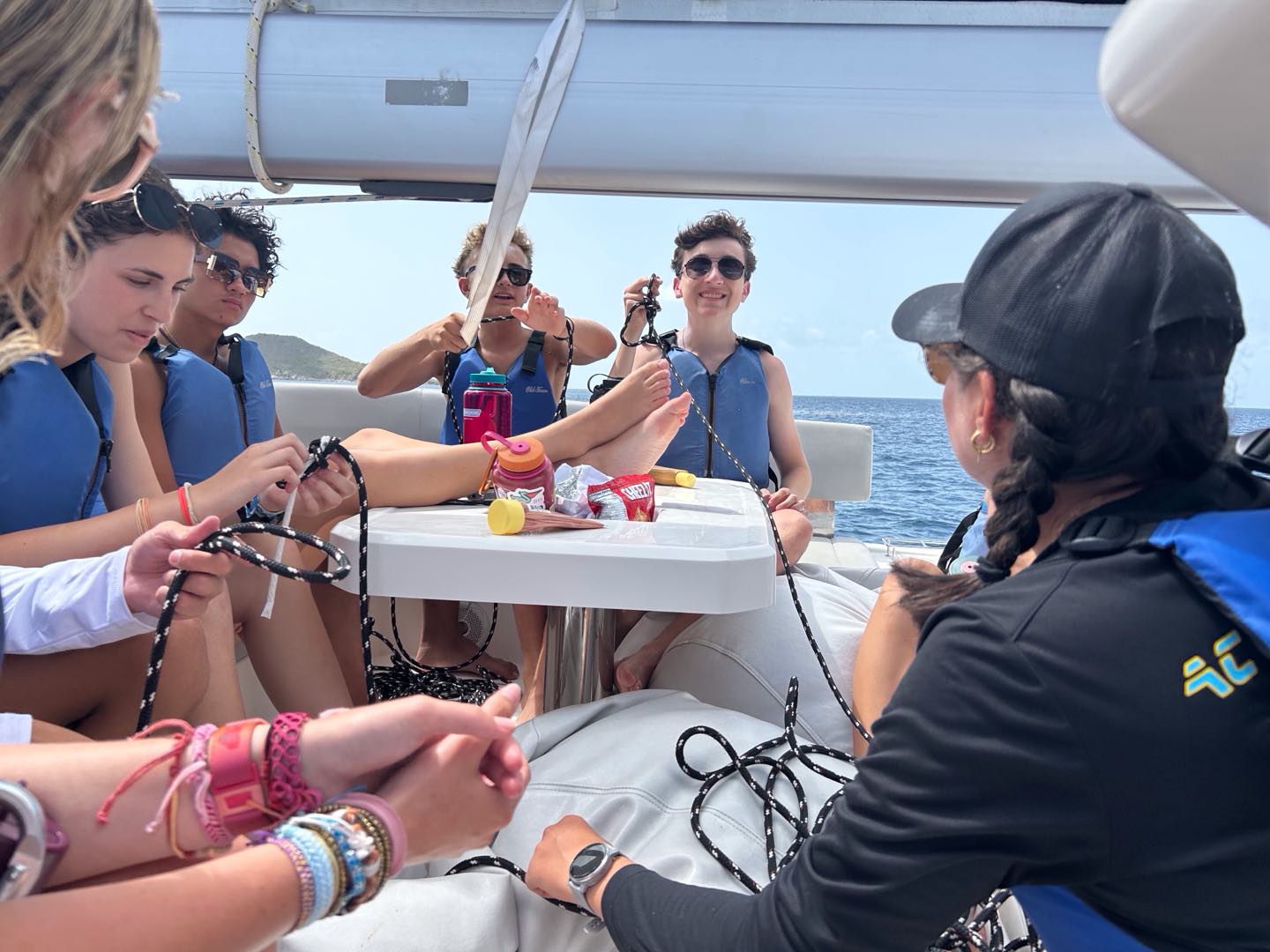 Crickets chirping, water swaying, and hushed conversations. A calm way to start the morning until Bruno Mars’ radio starts vibrating the speakers, as we could hear the bass. Today was an especially quick morning thanks to our great gopher Evan and chefs Redden and Declan getting out the cereal and milk. Our rush didn’t stop there, as we had to get back out at sea to our first dive at The Chimneys at 9 am. Everyone enthusiastically rushed to put their gear together and jump into the water to see the attraction our consulars hyped it up to be “a super cool pass through”. As we descended, not all the fish were up, so it was a calm swim. Most people still had the Bruno Mars concert on their mind and were jamming in the water. We swam through an underwater cavern until we came upon this slit to get back to the reef. This was called “The Chimney”, and Dawson and Redden confidently went through it as they love adventure. When ending the dive, everyone remained in the water to look at the waking reef until our time was cut as oxygen started to dwindle. When everyone was on the boat, it was time to book it to another dive site, which took an hour. During our sail, Ruby enjoyed one of her many naps of the day. When approaching our second dive site at Shark planes, where there is a net like you would see at a kids’ park, people climbed on and old planes converted to look like sharks. It was time to set up gear underway; this was the second navigation dive for one of our many certifications. When beginning this dive, we saw a barracuda lurking under our boat, which was frightening for some. When almost descending, Declan’s second respirator began to free flow, canceling his dive as all of his oxygen was spent, and we needed to get a new one. Scarlett, Ruby, Rachel, Madison, and Lucy were having girl talk underwater, somehow signing it when Evan swayed in and joined to talk about the new tea. A truly fun dive as we made a flag in water for navigation and most eyes were locked on to the shark art.