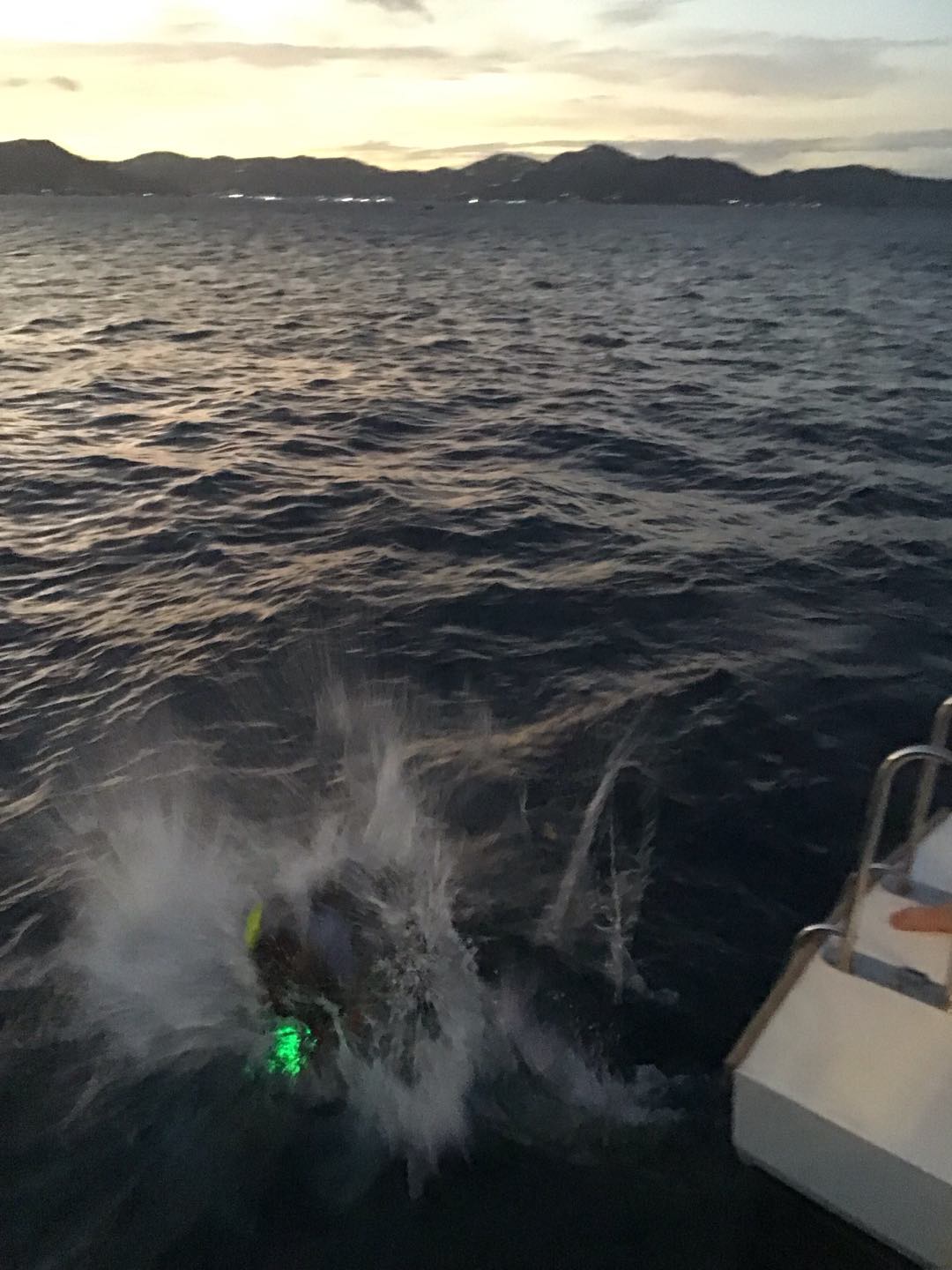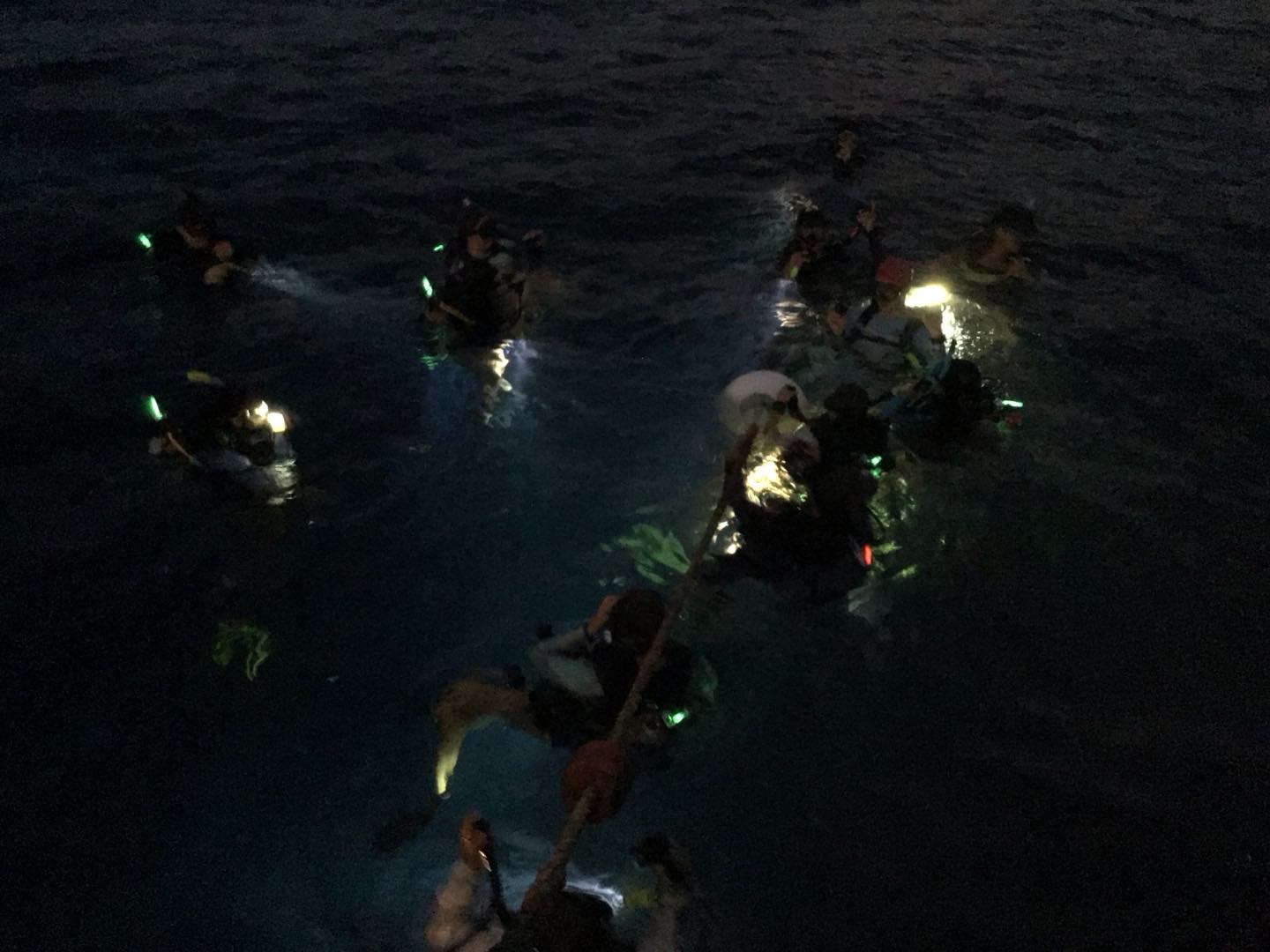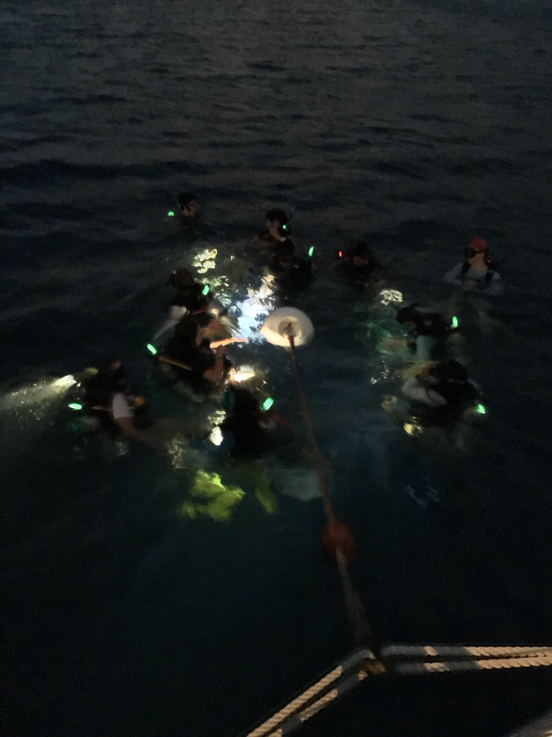 Once clean-up ended, Kyler gave us a great dive briefing with a compass skill to complete. Then, everyone came to the bow to get their gear on. Then we headed to the stern of the boat to do buddy checks and splash in. Shortly after, the descent began into the pitch-black water, with our dive lights lighting up the ocean floor. During the dive, everyone completed their compass skills flawlessly! The fun part of the dive then started! Everyone saw some huge tarpons with glowing yellow eyes in the dark, and when some of us shone our dive lights on them, their scales would shine in an orderly fashion.