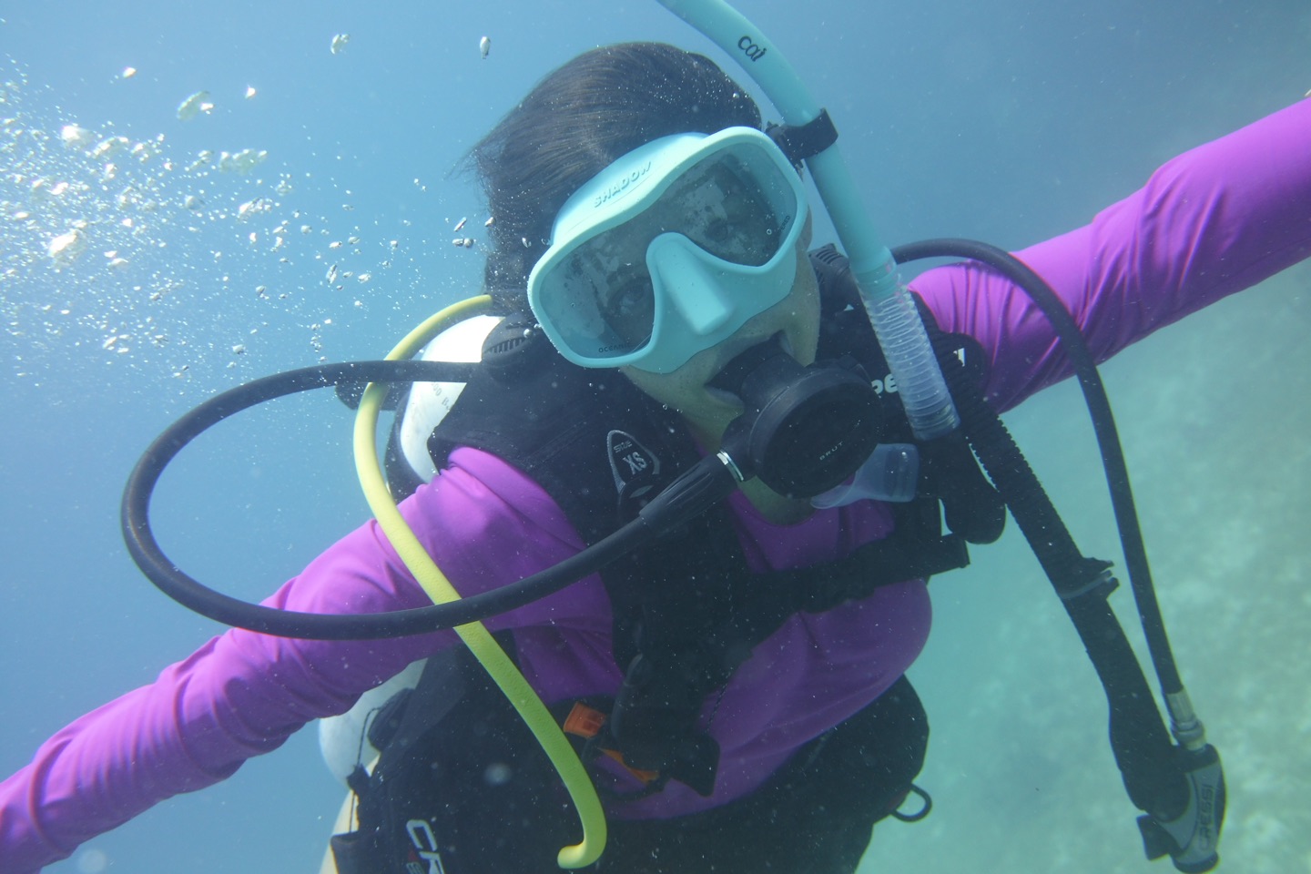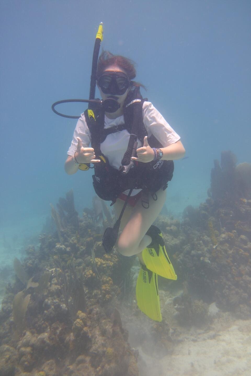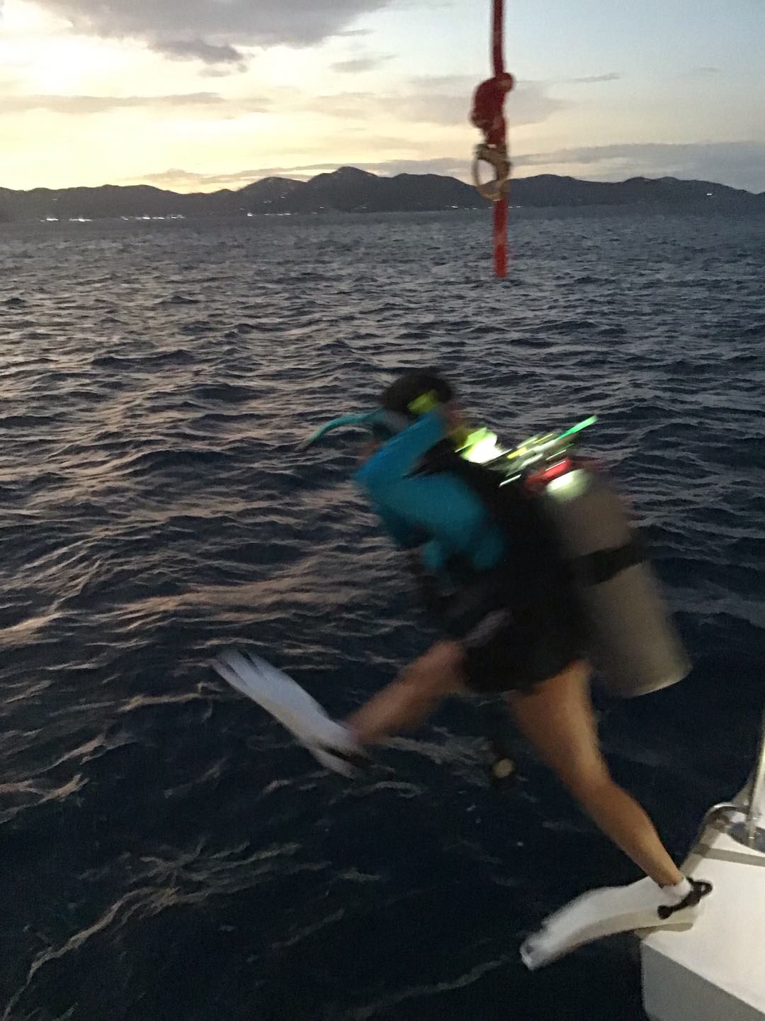 Once clean-up ended, Kyler gave us a great dive briefing with a compass skill to complete. Then, everyone came to the bow to get their gear on. Then we headed to the stern of the boat to do buddy checks and splash in. Shortly after, the descent began into the pitch-black water, with our dive lights lighting up the ocean floor. During the dive, everyone completed their compass skills flawlessly! The fun part of the dive then started! Everyone saw some huge tarpons with glowing yellow eyes in the dark, and when some of us shone our dive lights on them, their scales would shine in an orderly fashion.