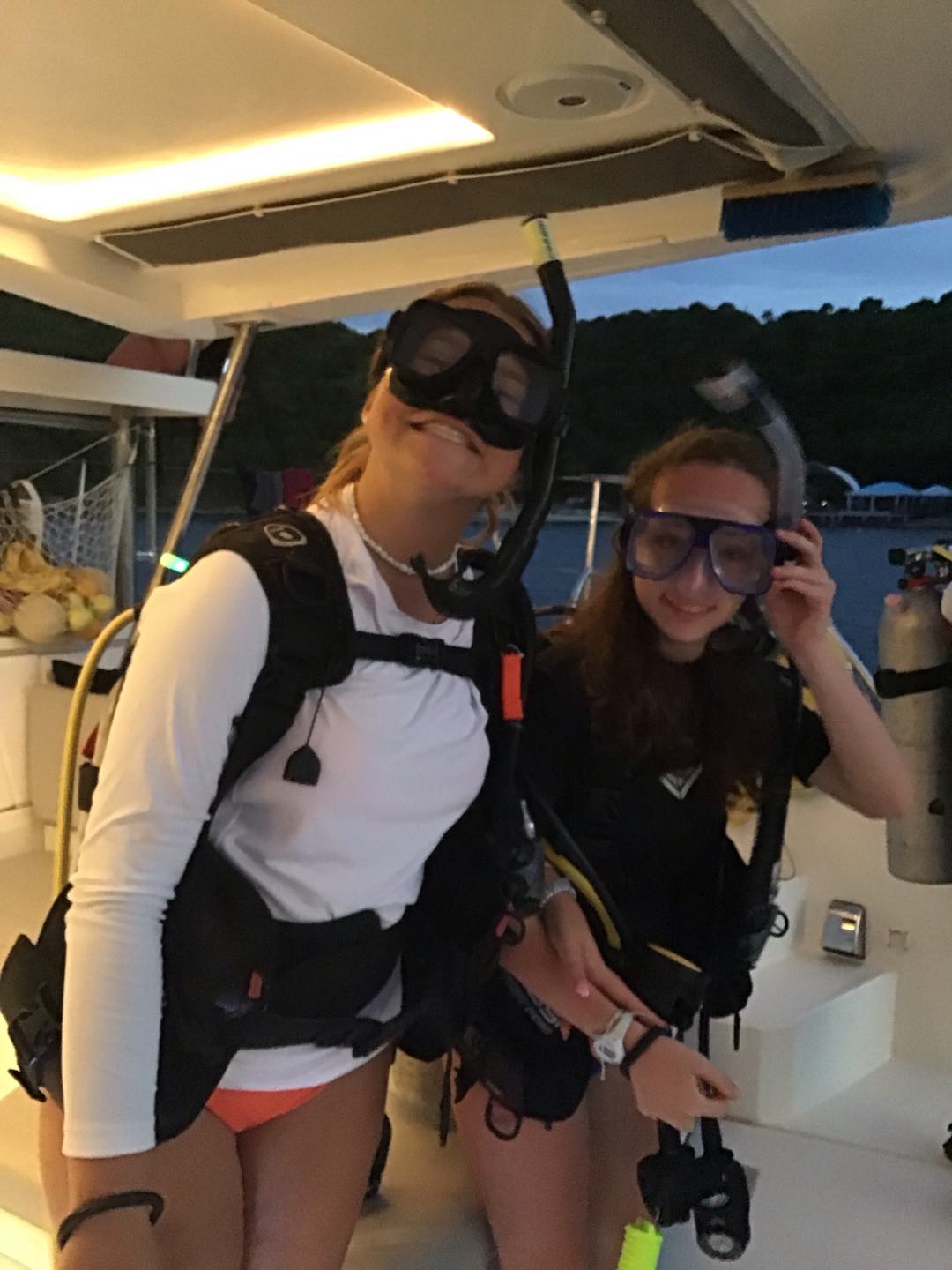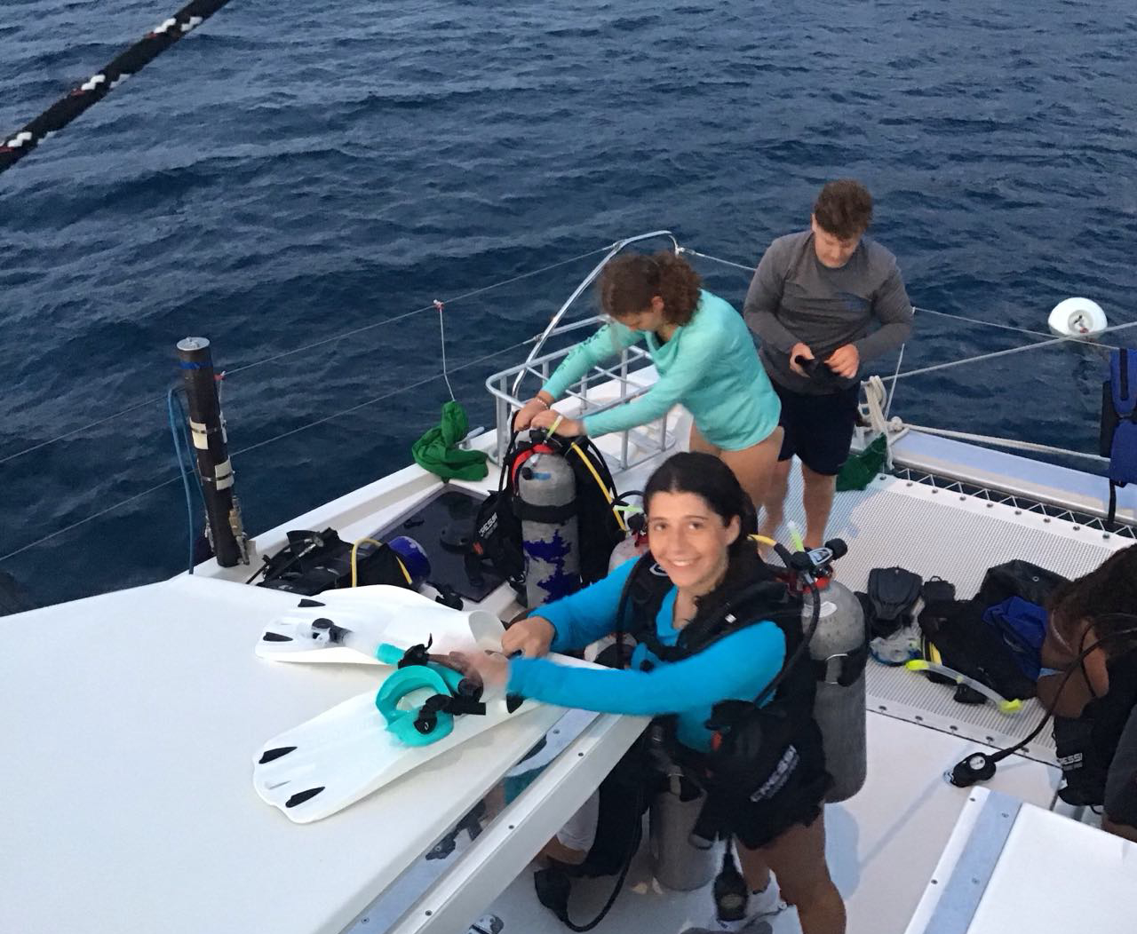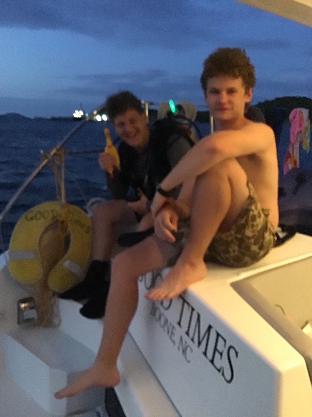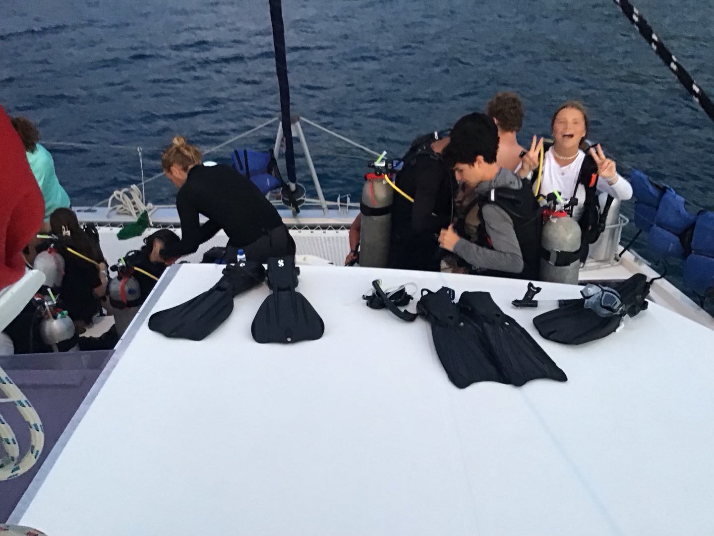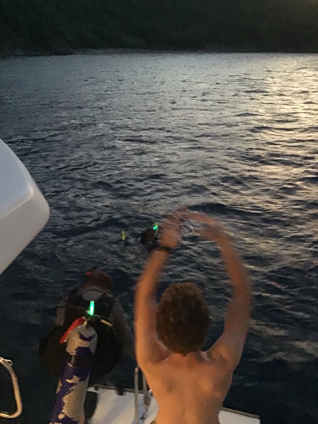 We all splashed in, and then, descending down the line, we saw some pretty cool things like feather dusters and gobies. Coming up from the dive, we put our gear away and relaxed around the boat. Some of us rested, and some of us had some fun in the water. As the afternoon came to an end, Antonio and I set up our scuba gear or “kits.” Soon after, other people did the same. We then had dinner made by our fantastic chefs, Alex and Nina. Dinner was a great risotto, some corn, and Caesar salad. At the end of dinner, the sun dipped below the horizon, and the light faded, giving us the perfect environment for a night dive!