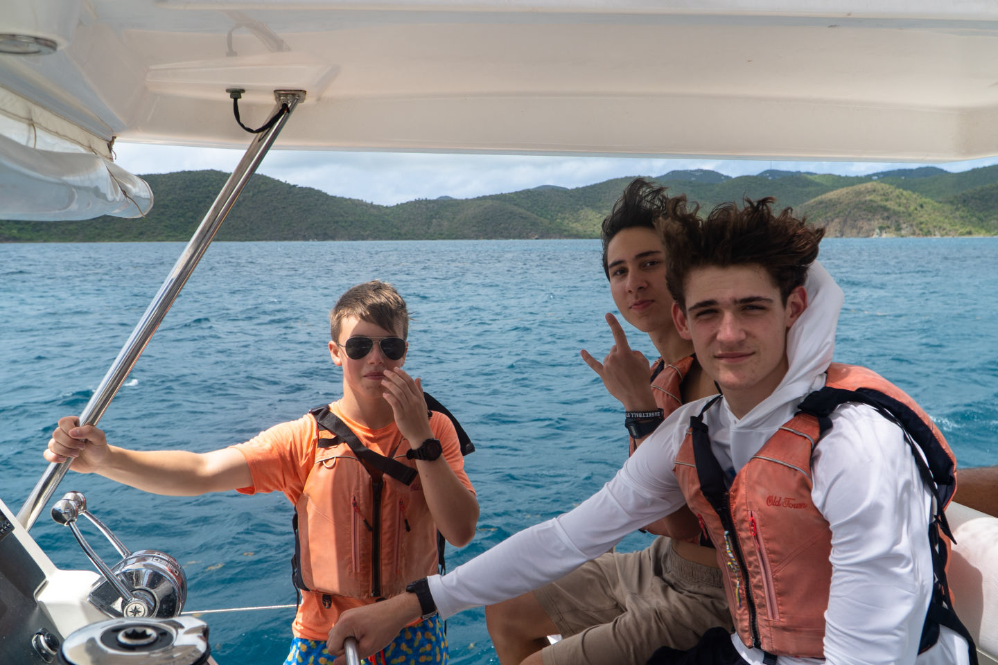 After we had our group together, we and the rest of the other Minerva crew from the second boat (Meow) entered the first small cave, which had many small and large fish alike darting around in the dim light. We moved on to the second cave, which was certainly the most exciting. The cave was dark and was headed far enough into the cliff to see nothing but black in certain places. Looking out, you could see the bright and vibrant light of the outside on either end of the cave. We Got back on the dinghy and headed back to the Mary Lee to depart to our final anchoring. On the way to the final anchorage for the night, Margaux and Davis taught us how to raise the main sail and tack the boat. When we got to Great Harbor, Peter Island, we showered, ate dinner, and I came to write this Blog. We are ending the night with our first sail chat and some time to bond with each other.