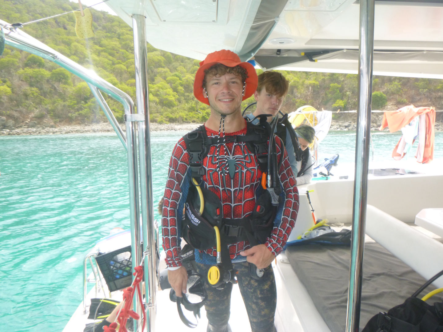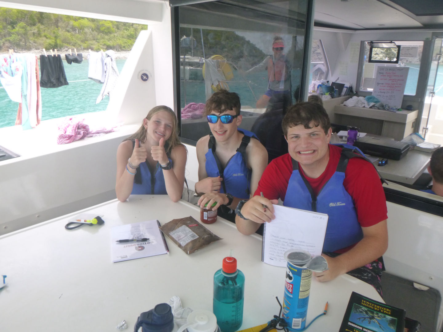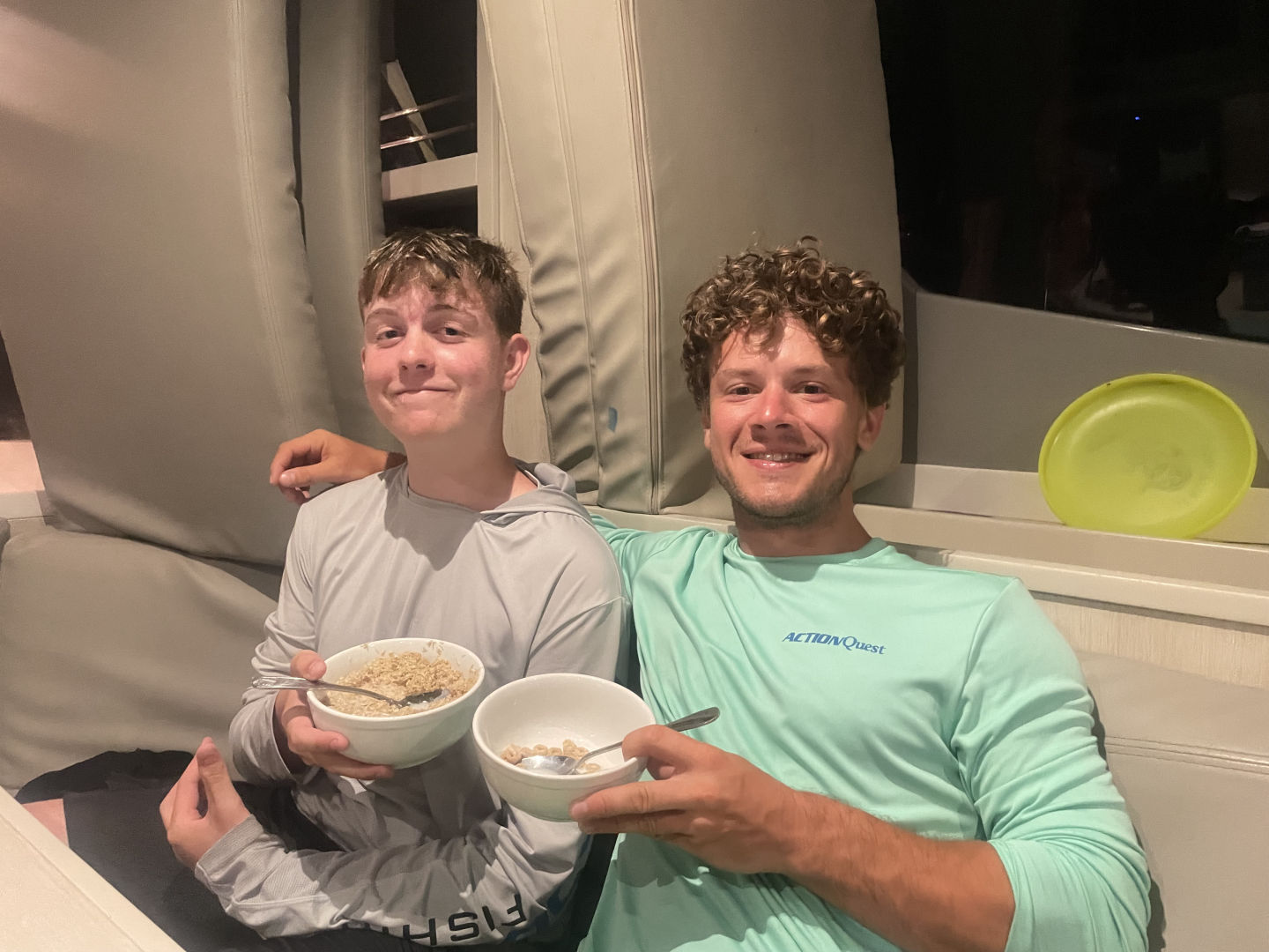 We started the day with scrambled eggs and muffins made by Caleb and Moorea. We then sailed from Muskmelon to Monkey Point. Straight after we arrived, the Neptunes (Caleb, Dylan, Brian) did our second underwater naturalist dive, and the dolphins (Tyler, Tyler, Kyler, Zack, Moorea, Alli, Scarlet, Alexis, and Jack) did a research dive. We then filled the tanks, and the Neptunes did a specialist equipment course while the dolphins worked on their fish ID and their research projects. After all of this, Caleb and I (Brian) had a nap to skip the journey to Sommer’s Beach. Shortly after arriving in Sommers Beach, the heavens opened up and drenched the majority of us. Most people hated it, whereas I loved it, as it was a reminder of the weather back in England. While it was raining, a pod of dolphins appeared! After a long day, it was time for a beach bbq with all the other boats, but we had to do a wet entrance on the beach to avoid getting the dingy stuck on the sand, so once again, we were wet, but it didn’t ruin our fun. After about one hour and a half, we headed back to our boat and chilled out while the Brits (Brian and Joe) chowed down some cereal. Now I’m going to sleep and can’t wait for tomorrow.