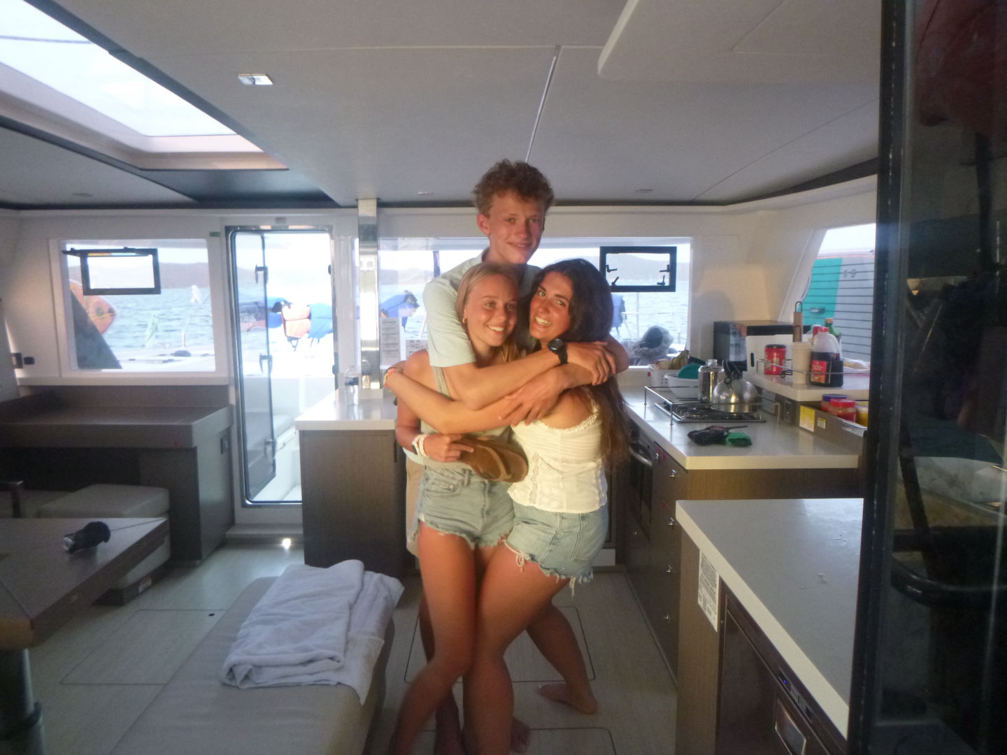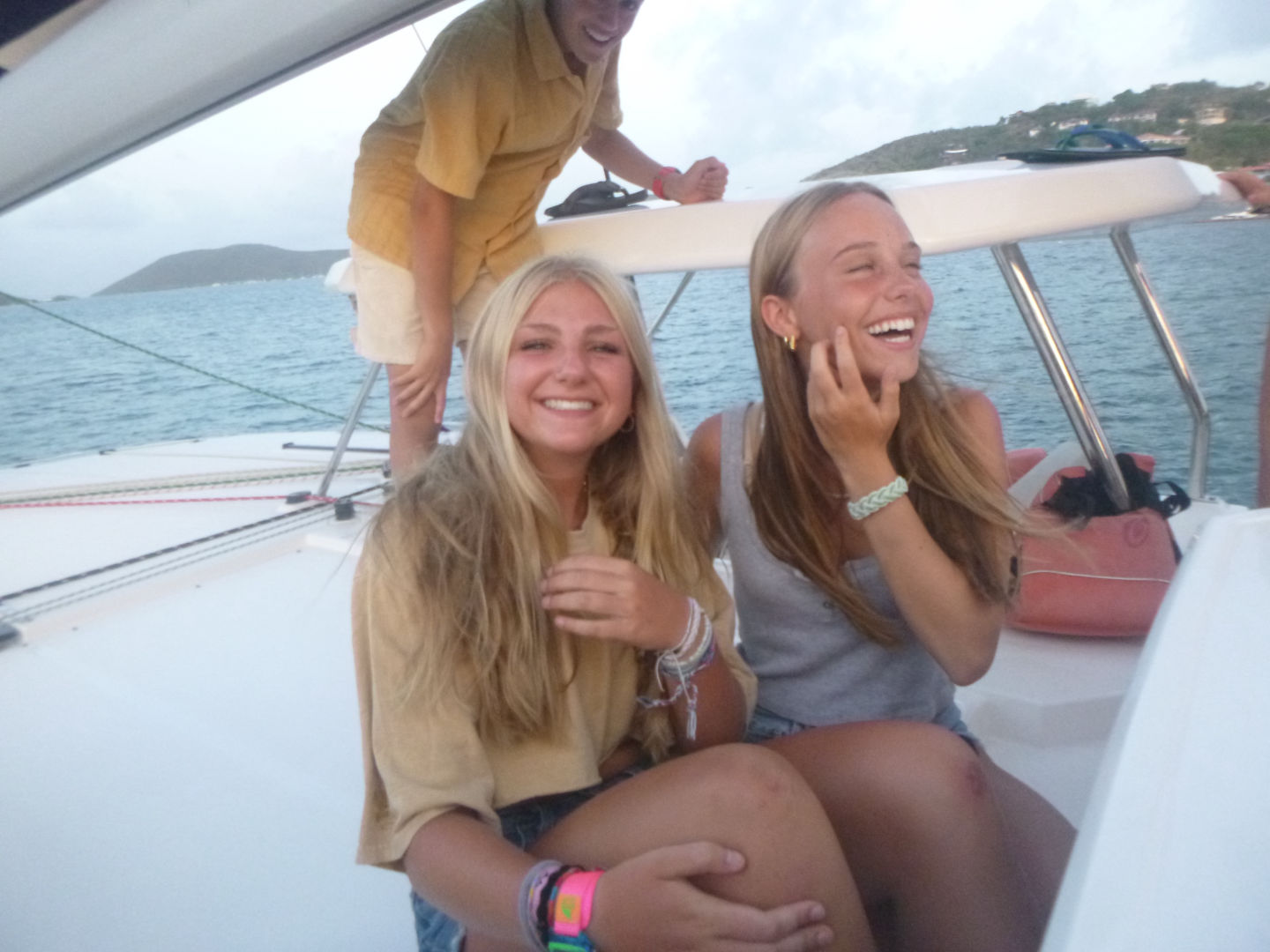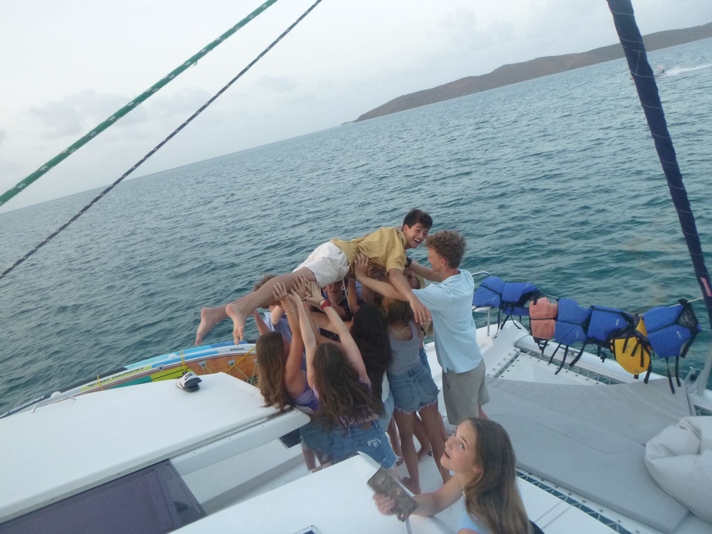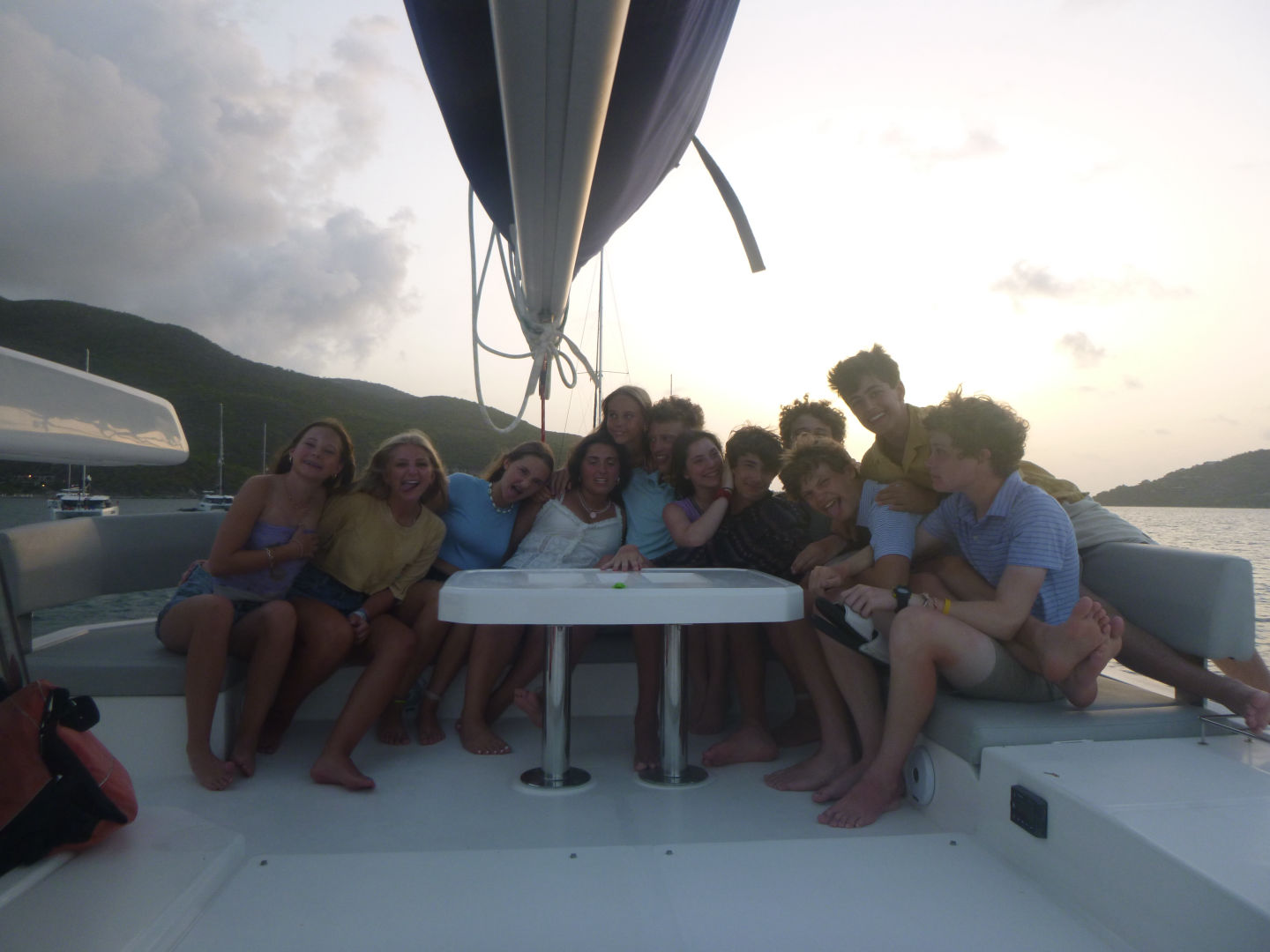 Today was a very interesting day! It started off bright and early with a breakfast of cereal at 7 am brought out by Zander and Peyton, the amazing chefs of the day! We went on our dinghy over to Odyssey and Friendship, two boats that were rafted together. We had the option to either paddle board, zest, or do water sports, but a lot of us decided to make friendship bracelets and eat the other boat food. Finn, Zander, Oscar, and Teddy all tried to fit onto one zest, which surprisingly worked. And Bear, Georgina, and Tatum made it all the way to the beach on a paddle board! Then, William, Ellery, Payton, and I went wakeboarding and kneeboarding, and William got up on the wakeboard for the first time! For lunch, we munched on carrots, melon, and Nutella sandwiches. We all went to the beach after lunch for a lesson on navigation using our compasses. Then, Peyton, Zander, Eres, and I made a discovery, fresh coconuts growing on trees on the beach! After, we motored over to Leverick Bay, where we got to go on shore, go shopping, and get our phones! Our day ended with a fun and eventful BBQ.