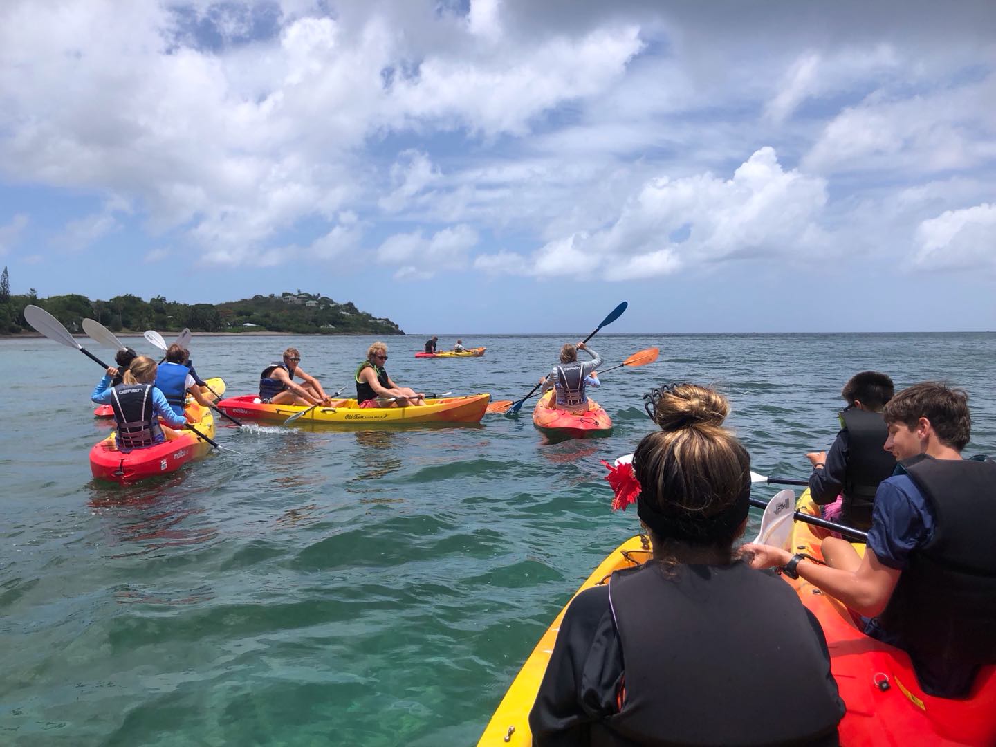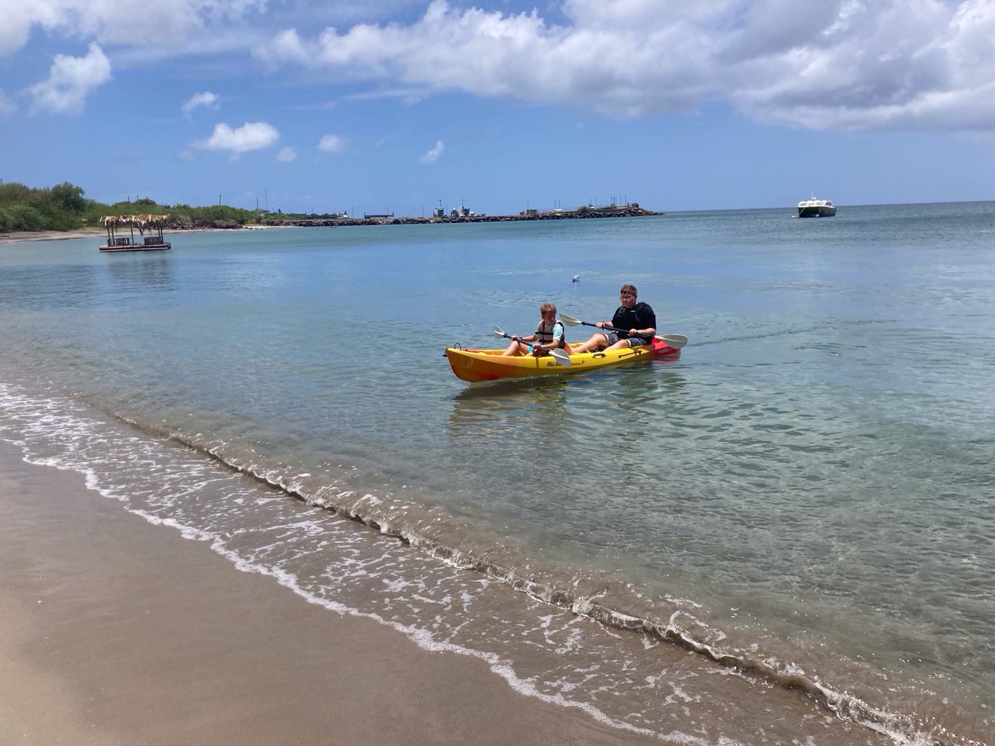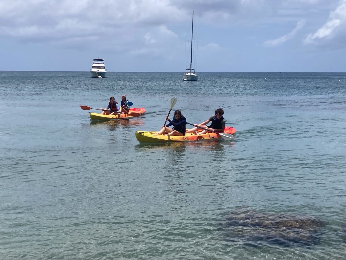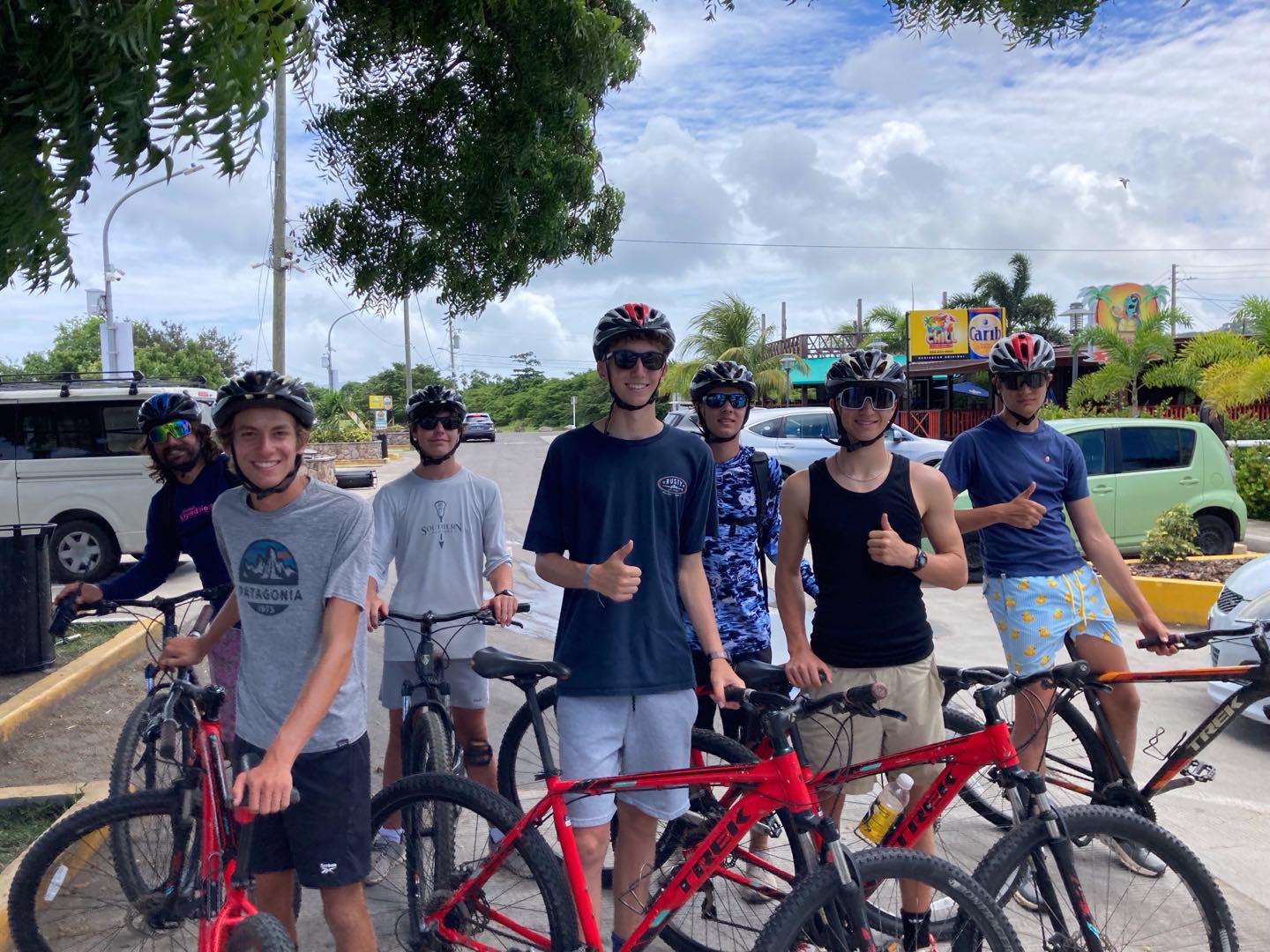 Today we woke up to a late start at 8:30. Evan and Walker woke up a tad bit earlier to make pancakes. Walker used his special artistic gifts and made silly shapes with the batter. Jackson, Juni, and I scarfed some special pancakes because we had to go to shore to go for a bike ride. A guy named Reggie owned a mountain bike company and told us to take the road around the island. This bike ride was very challenging and had many hills. Jackson and Junis’ favorite part was seeing all the small towns and stopping for food like ice cream. Towards the end of the long mountain, we rode very fast down the hill, and it was so much fun. At the very end, after 20 miles of biking, we got smoothies and fancy food. The rest of the group was participating in a fun kayak adventure in a cove. Mia and Im Im were stuck behind because of the wind and had to paddle extra hard to get back with the group. JJ, Tati, Evan, Ellery, and Walker all had fun chill kayak rides. After a long day in the sun, we went to the Hamilton museum and had a fun beach BBQ with good native Caribbean food, and took photos together. JJ, Tati, and Ellery had a fun conversation. Mia and Im Im enjoyed our food. Now JJ Walker and Jackson are sharing stories and bonding.