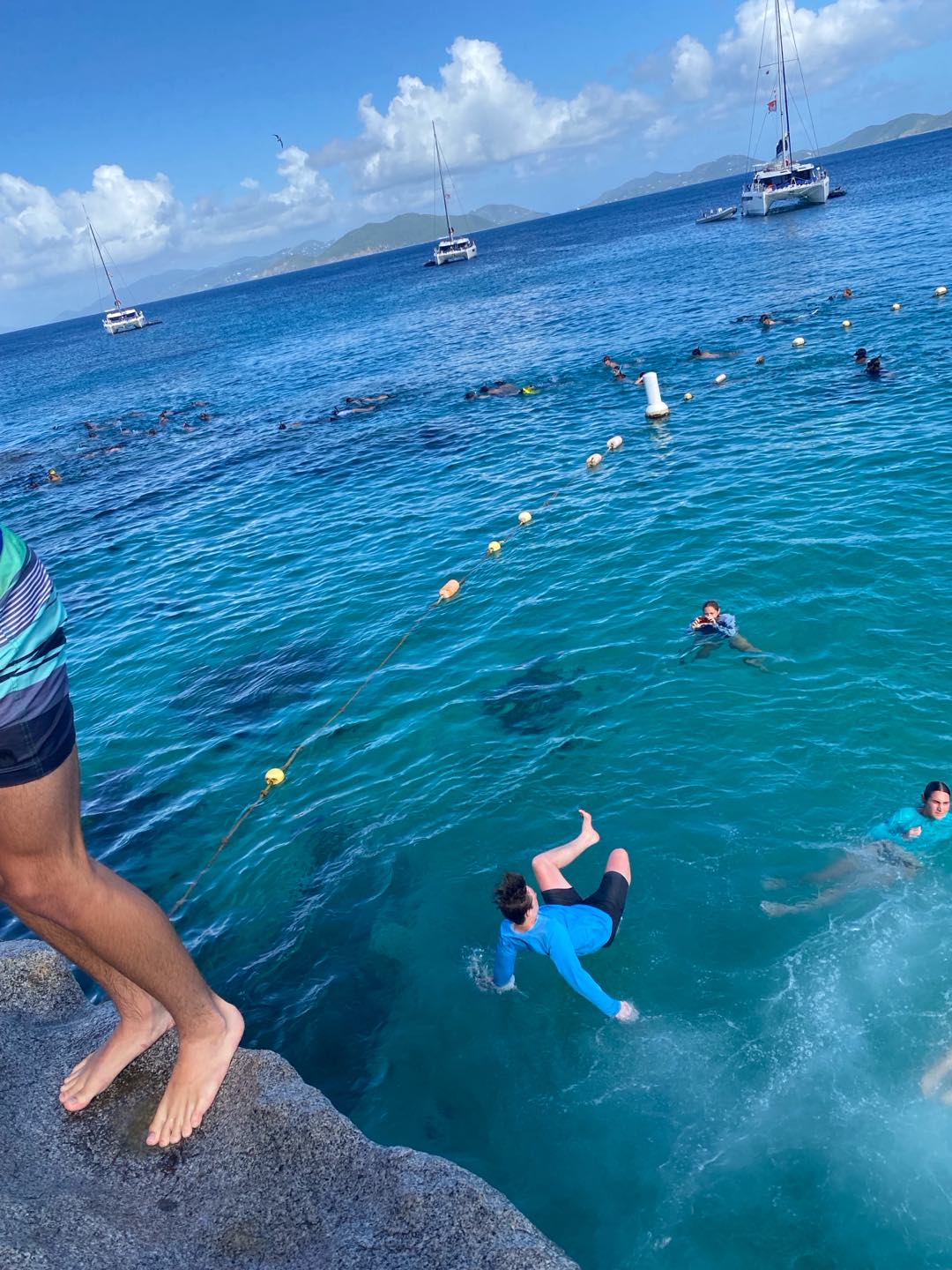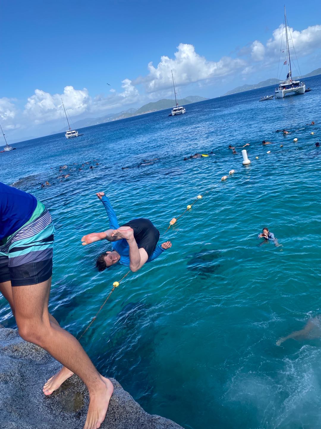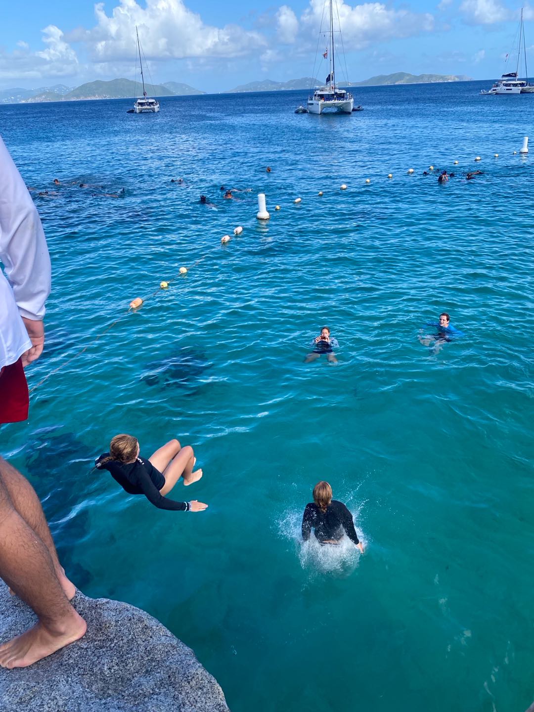 The day started for me at the early time of 6 am in my hammock. As Mike started up the boat and headed us to our new destination, I headed back to bed in the cabins. We woke up to the beautiful view of our new destination, the baths (A beach full of rocks, cliffs, caves, etc.). After a nutritious breakfast consisting of Frosted Flakes and milk, we hitched a ride on a dingy to embark on our first adventure of the day. Once we arrived at our destination, we were instructed to fall back off the dinghy like we would on a dive. Once I fell back into the water, my head collided with my fellow shipmate Nora, to which I thought I had died. We were both completely fine!