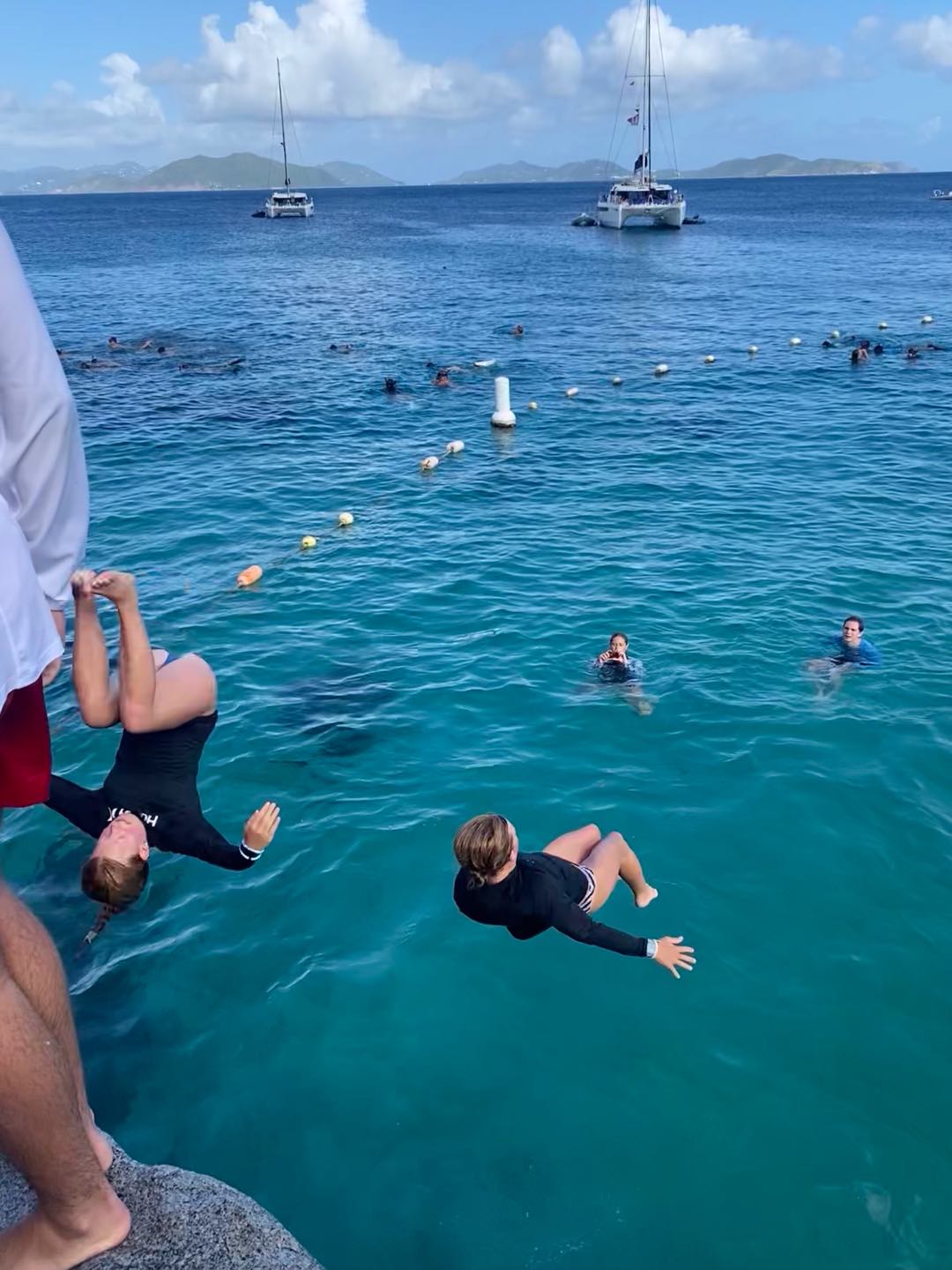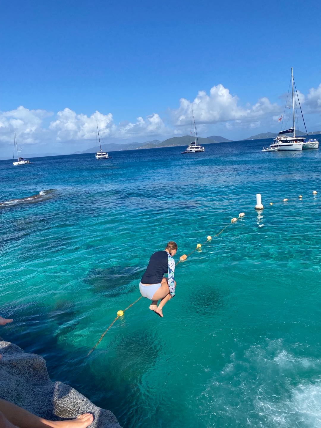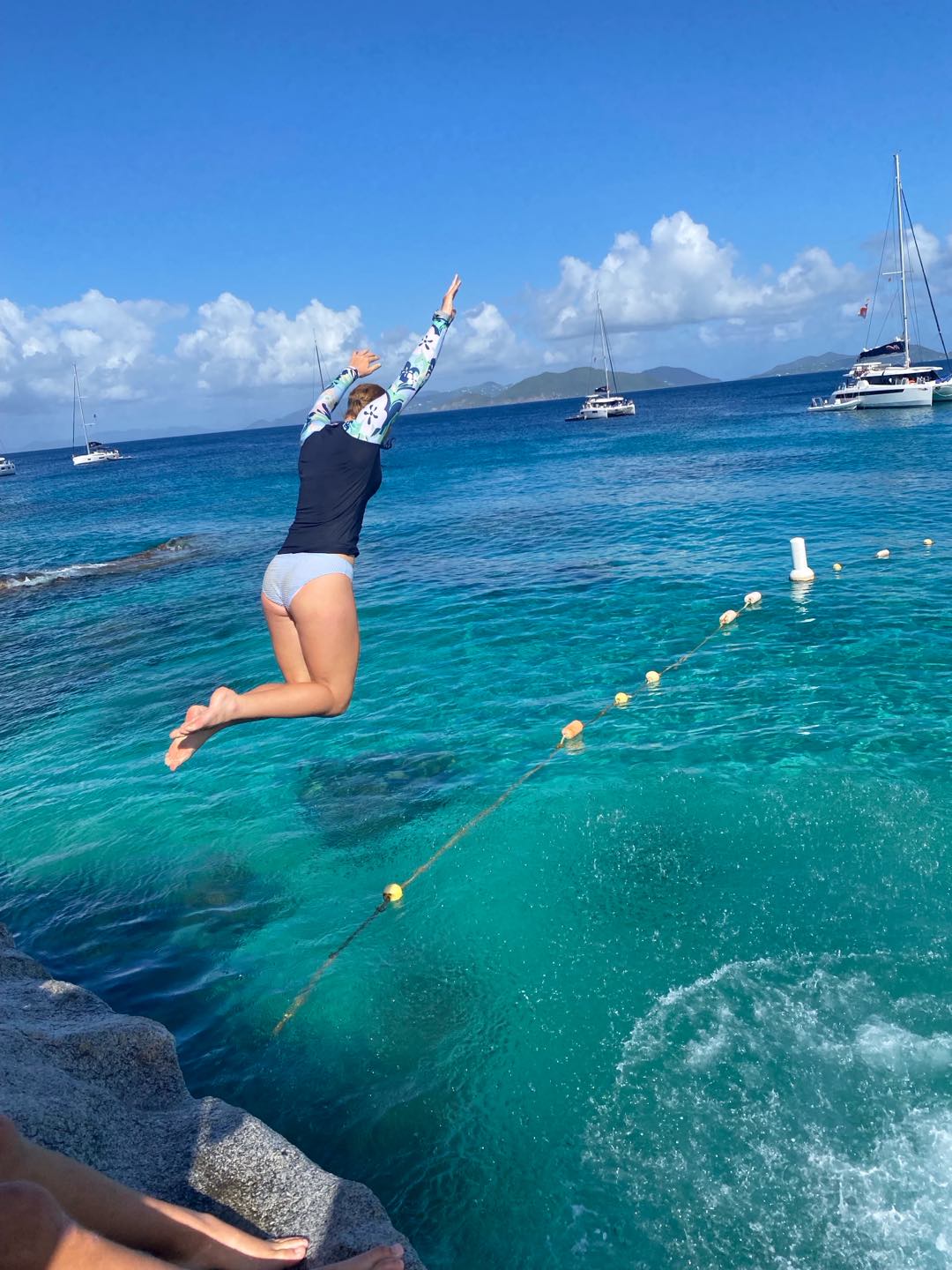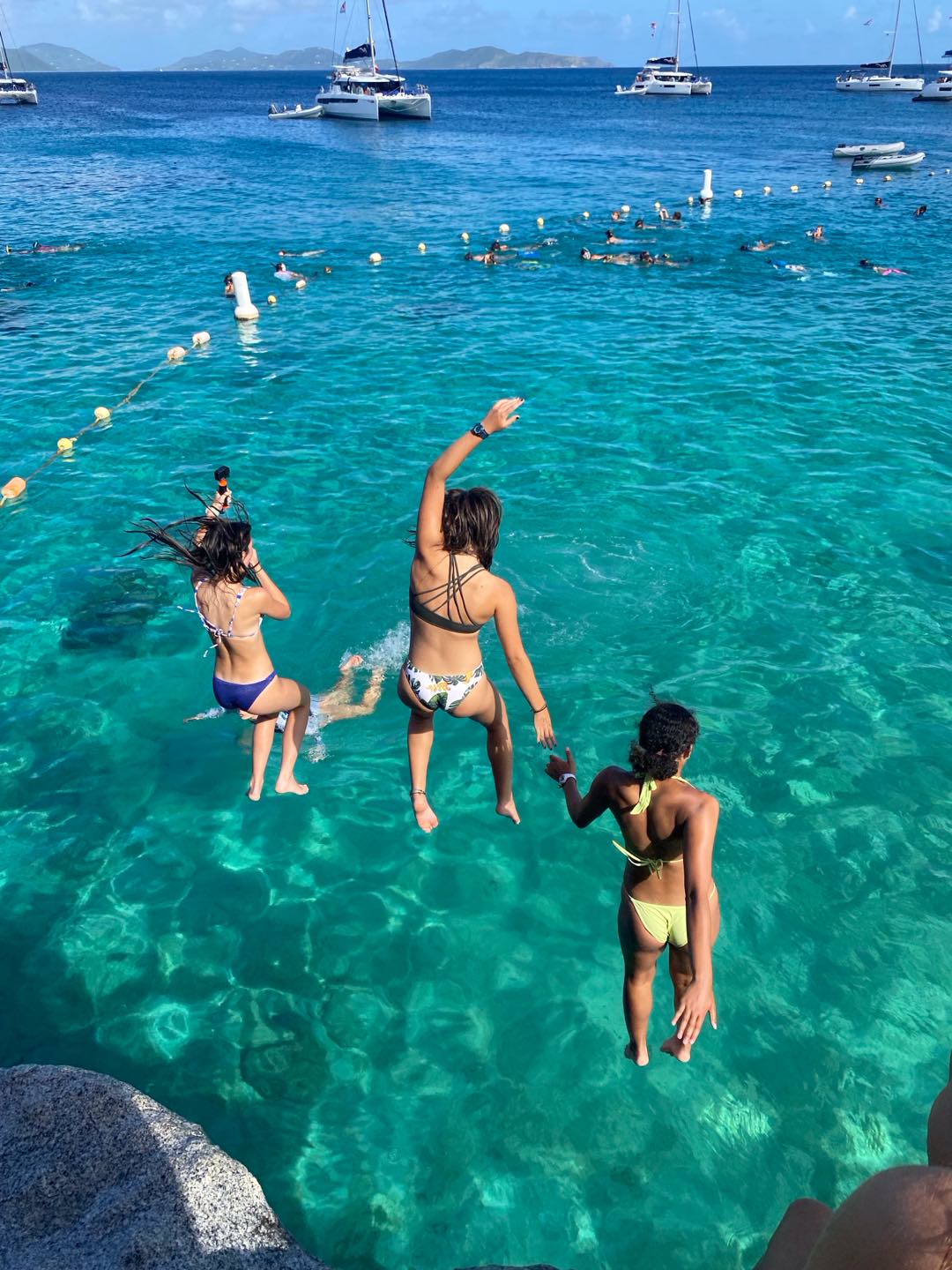 The day started for me at the early time of 6 am in my hammock. As Mike started up the boat and headed us to our new destination, I headed back to bed in the cabins. We woke up to the beautiful view of our new destination, the baths (A beach full of rocks, cliffs, caves, etc.). After a nutritious breakfast consisting of Frosted Flakes and milk, we hitched a ride on a dingy to embark on our first adventure of the day. Once we arrived at our destination, we were instructed to fall back off the dinghy like we would on a dive. Once I fell back into the water, my head collided with my fellow shipmate Nora, to which I thought I had died. We were both completely fine!