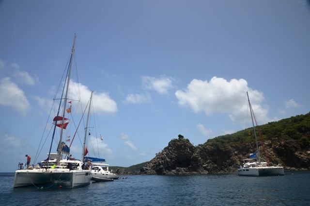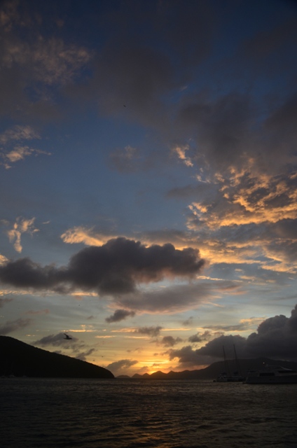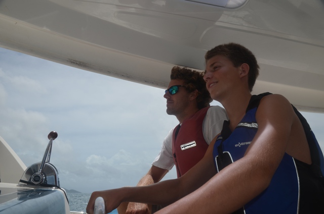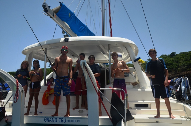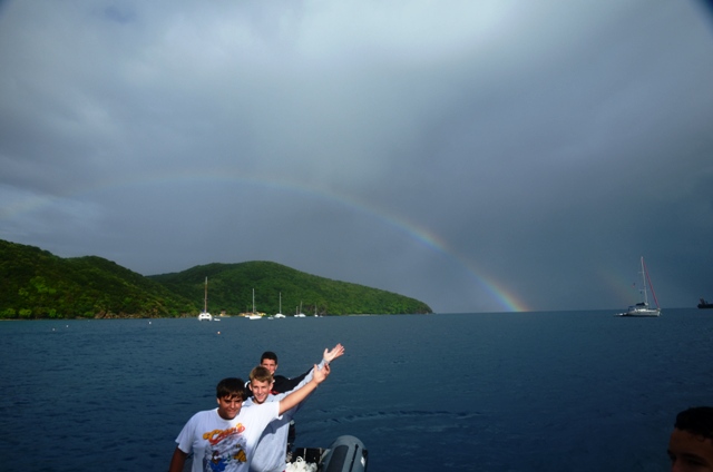 To Road Town: 336 degrees for 4 nm. To GHP (Great Harbor, Peter Island): 161 degrees for 4 nm. Today we began with breakfast in the small hammock village of our boat. Breakfast was followed by a storm and eventually our first deep dive where some of us even became supermen. After we sailed having 25 knots of wind to Road Town. We shopped and ate great food on the exotic island of the Caribbean for the first time. Then a breathtaking sail back to GHP where we pulled off around 9.2 knots, our current record. We anchored and swam off the stern of the boat. Dinner was cooked. What was left became the artillery for our food fight. We await our wreck and photography lectures tonight. It was another great day in paradise.