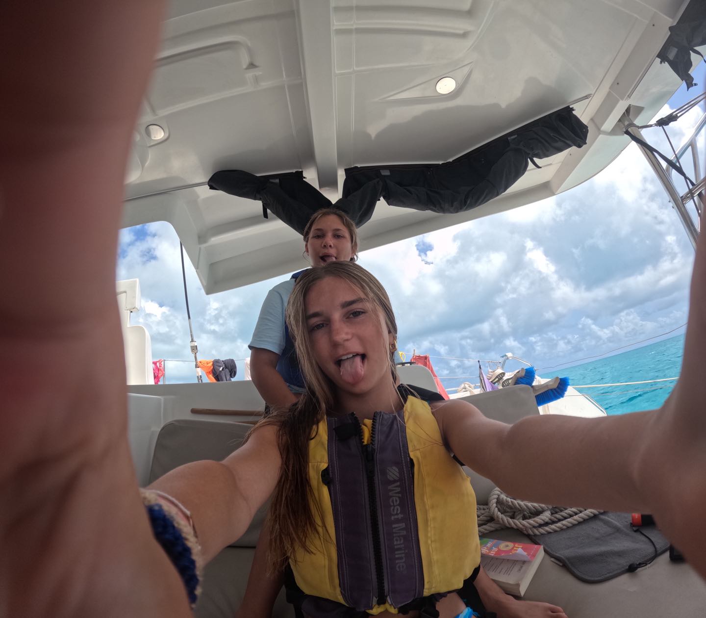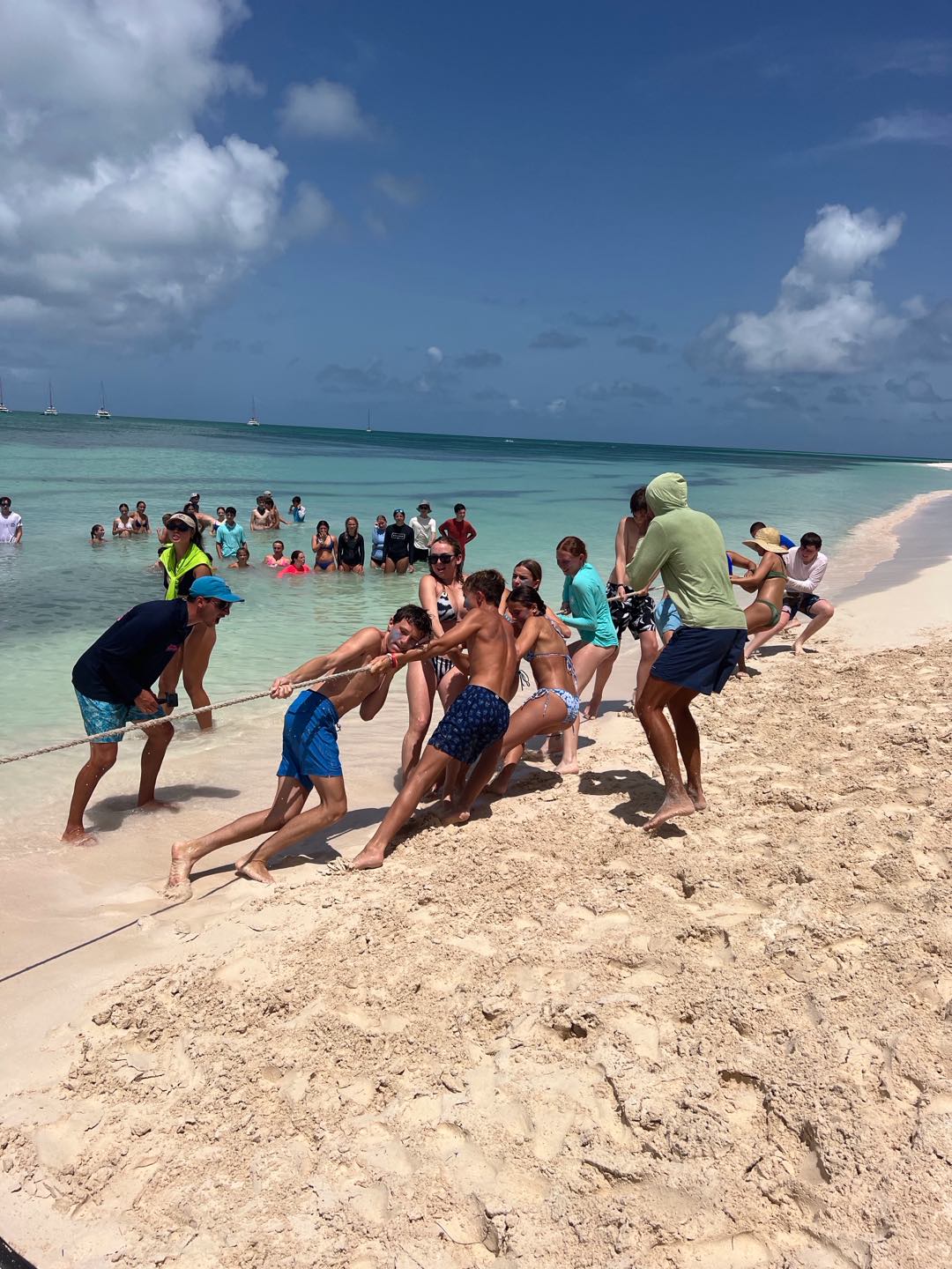 This morning, I woke up to the breeze blowing straight into my face. We were rocking back and forth for what felt like forever. I lifted up my head, looked out the window, and saw a perfect purple and pink sunrise right in front of my eyes. I glazed out of the hatch above Kennedy, Pearl, and me and saw Whitney, one of our scuba instructors, staring right at me. And the first thing I heard this morning was, “ACTIONQUEST OLYMPIC DAY GET HYPE.” I sighed and woke up Pearl and Kennedy. After brushing our hair and our teeth we came upstairs to a fresh pan of french toast and very unevenly cut pieces of cantaloupe. Props to Suki and Andrew!!!!! But it ended up being so good. I ran downstairs, grabbed my bright blue zinc, and started to put it under everyone’s eyes. I asked Amanda, our other scuba instructor, if I could put zinc on her face and she said no. 5 minutes later I came into the galley and she turned around and had zinc on her face. I was so offended. Anyway, I started writing Avizia, our boat name, on Holden, Dawson, and Cam on their backs and wrote the same on Pearl, Kennedy, Amaya, and Lilliana’s stomachs. We jumped onto the dinghy to head over to the beach. There, we competed in tug of war, a three-legged relay race, and a fender rodeo. We won none of the rodeo or tug of war. But in the three-legged relay, Pearl and I worked together and ended up winning. Jovian saw some people he knew from our land day and was hanging out with them in the water for a while. So we also got to meet new people! Everyone from our boat and other boats in our fleet started to play chicken fight where everyone goes on each other’s shoulders and fights. Gavin was the big winner! We jumped into the ocean, took some photos, and out of nowhere, it started to POUR rain. That is when we realized that we left our cabin hatch open. So we came back to the boat to our bed, and a few of our things were wet. For lunch, we had PB and J sandwiches. We took a quick ocean shower before we set sail for 3 hours. During the sail, we finally got a good shower with Hibiclens. Today was the first day in a while that we all felt super clean. Holden was super nice and decided to grab our life jackets from the bow for all of us. Thanks, Holden! I went up to the power tower and tried to make friendship bracelets, but they were actually horrible. I laid my head down and took an hour-long nap. When I woke up, we were in a new place. We stopped on a dock to refill our water tanks, which, by the way, empties SO FAST. Suki and Andrew made us some veggie burgers and mashed potatoes for dinner. Everyone took all the buns before me so I had to have it on bread, but it was still pretty good! That was pretty much our day so far. Right now, I am writing this blog for everyone’s parents to see, so hiiiii! After this, we have a dive chat for an hour, and I hope to have a good sleep tonight. Today was one of the most fun by far.