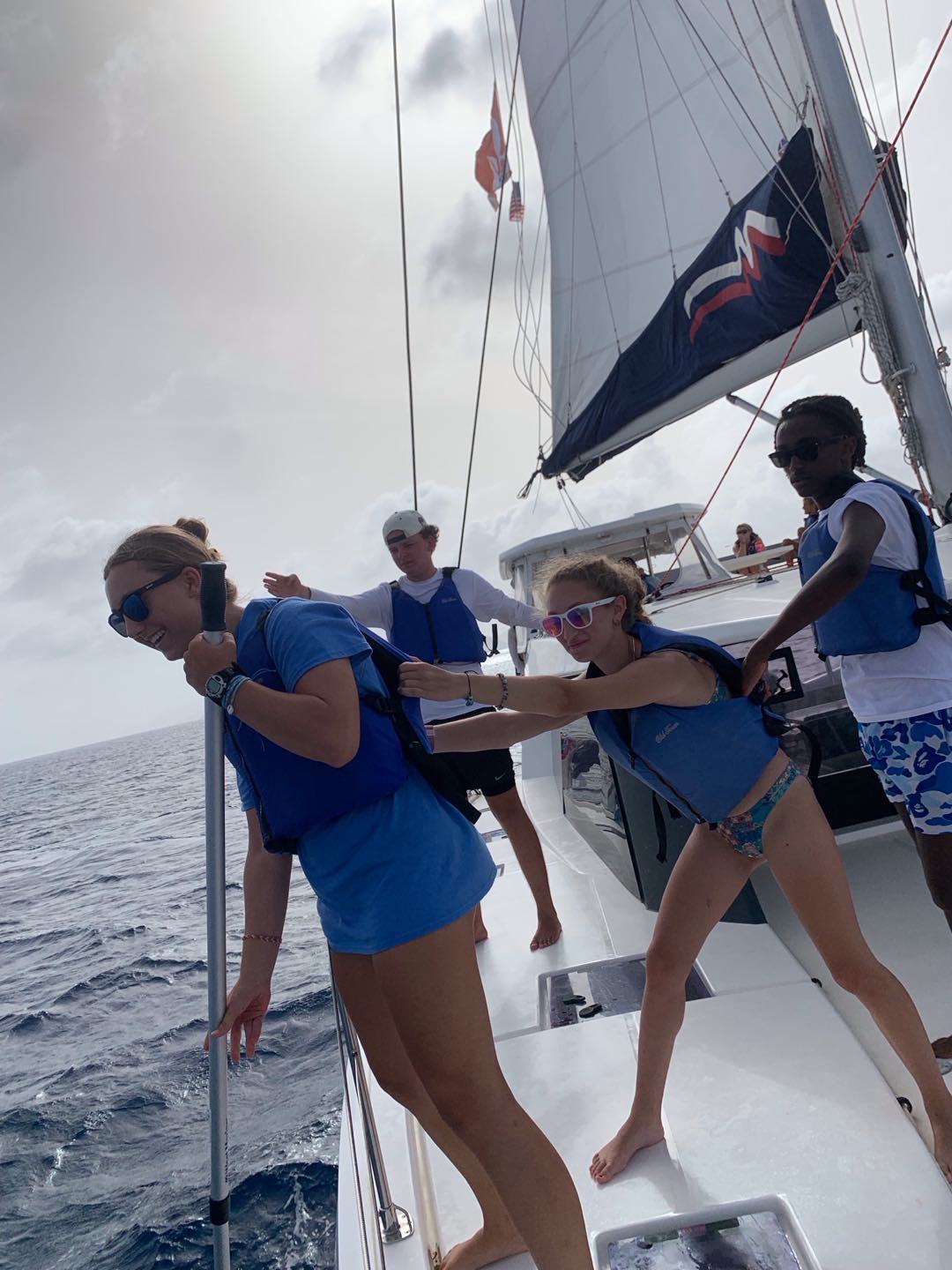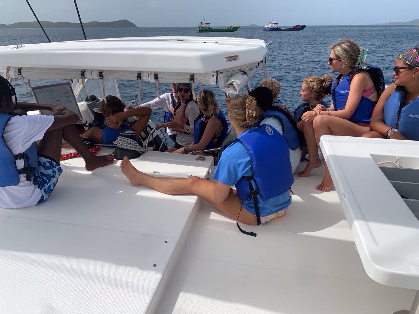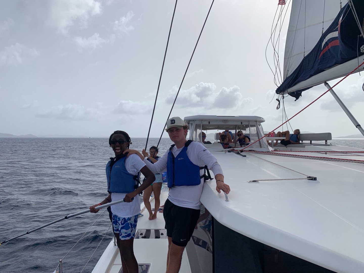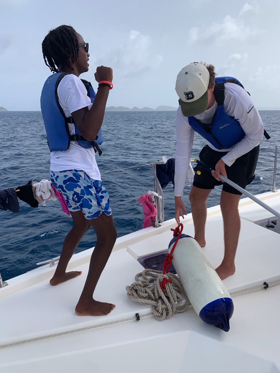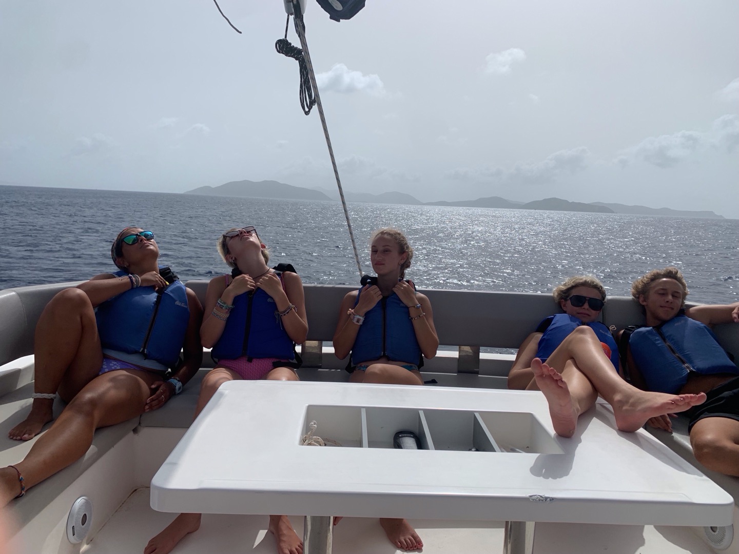 Today felt like a full week, with some of us starting the day with a 12 am wake-up for our night sail. We sailed throughout the night, with Scarlett, Roman, and Celeste taking the unfortunate 3-6 am shift. Peyton, Orly, and Evan sailed us home to the BVI’s around 9 am, ending the 18-hour sail. After a late breakfast of oatmeal, we hung out and got ready for Spanish town. We spent ages waiting for Frenchie but finally decided to ditch them. As soon as we got to Spanish town, we all ran to the alleged best chicken place in the BVIs, according to Scarlett. We waited on the sketchy green patio for 2 hours and began to doubt we would ever eat. Just as all hope was lost, the waitress brought out a platter of delicious, fresh fryer fried chicken. In typical Different Drummer fashion, we scarfed down all the food in about 5 minutes. Scarlett then snuck off and bought a little bunny jellycat we named Lil Bongo after our dinghy. Back on the boat, we prepared to do some sail training. We started with some man overboard drills using a fender we named Mighty Mike Meighan. It was pretty fun, actually, with most of us taking the helm. After we finished with that, we sailed back to Great Harbor Peter to join the rest of the Action Quest Fleet. We ended the day with a delicious feast of breakfast for dinner prepared by the whole boat while we had a dance party.
