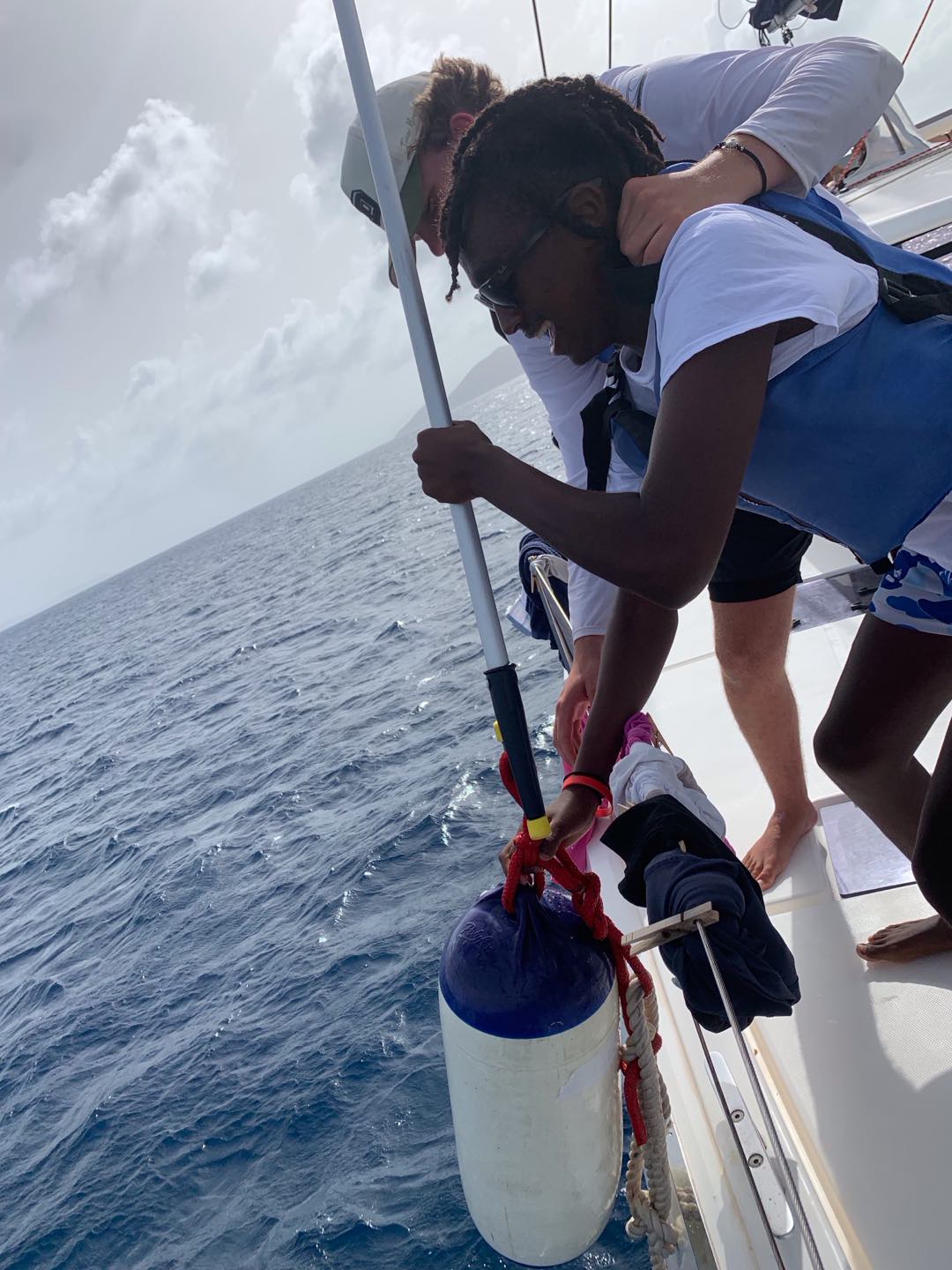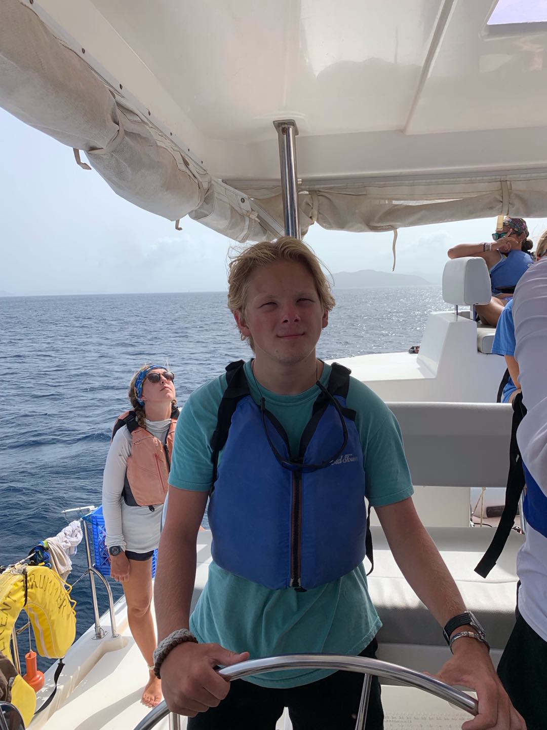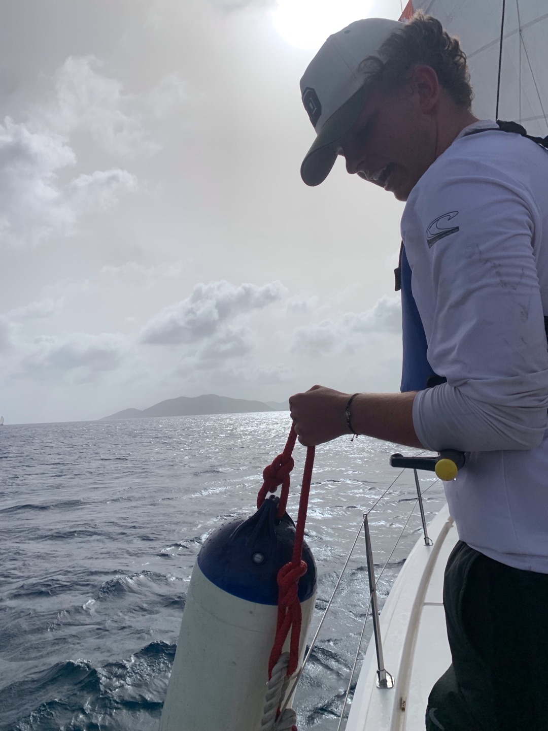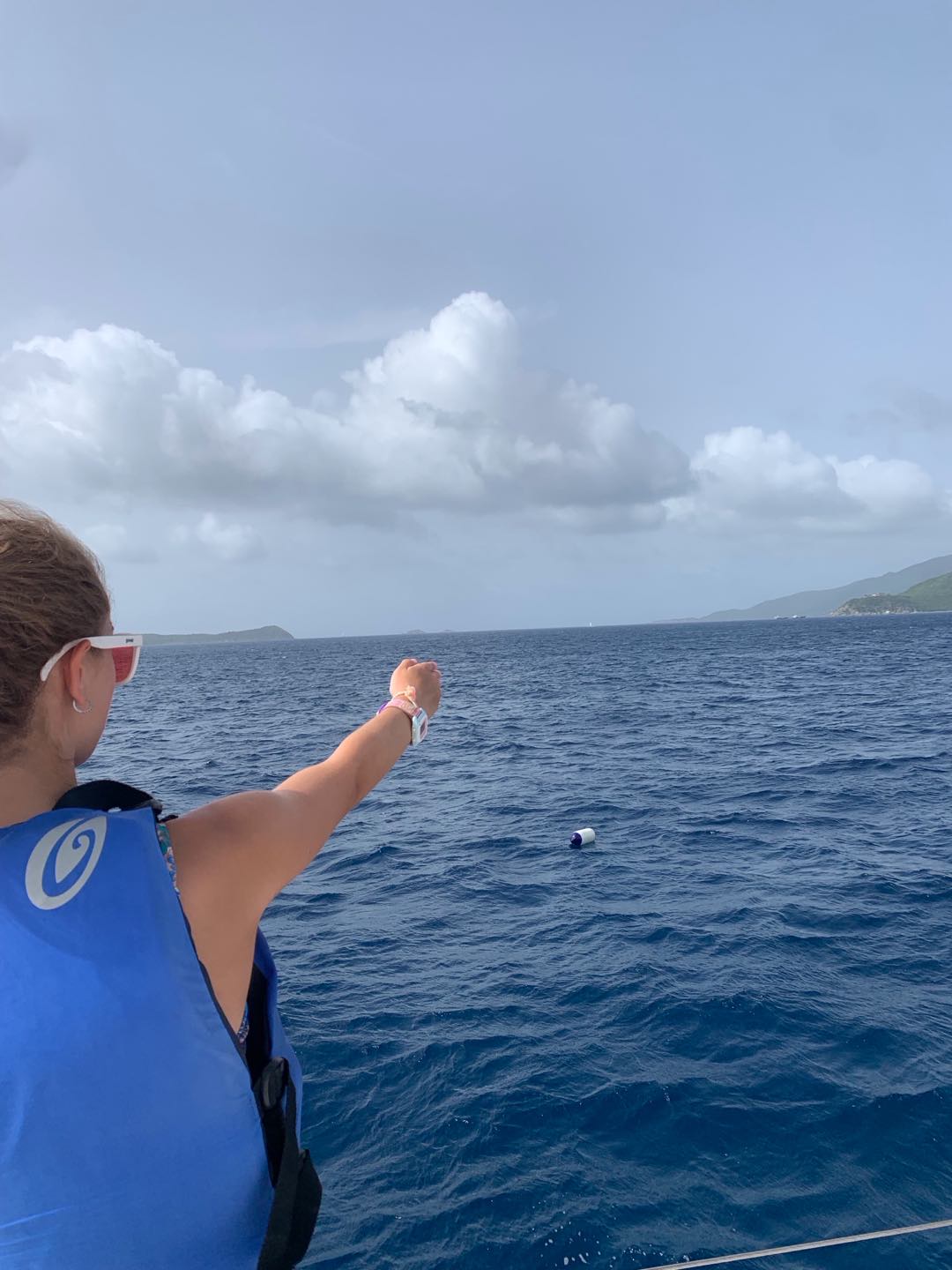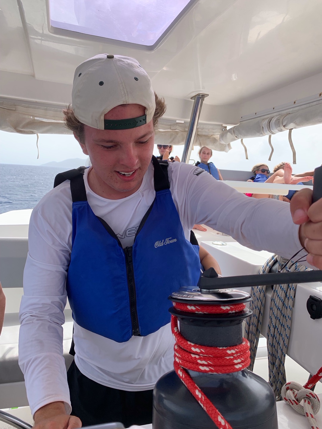 Today felt like a full week, with some of us starting the day with a 12 am wake-up for our night sail. We sailed throughout the night, with Scarlett, Roman, and Celeste taking the unfortunate 3-6 am shift. Peyton, Orly, and Evan sailed us home to the BVI’s around 9 am, ending the 18-hour sail. After a late breakfast of oatmeal, we hung out and got ready for Spanish town. We spent ages waiting for Frenchie but finally decided to ditch them. As soon as we got to Spanish town, we all ran to the alleged best chicken place in the BVIs, according to Scarlett. We waited on the sketchy green patio for 2 hours and began to doubt we would ever eat. Just as all hope was lost, the waitress brought out a platter of delicious, fresh fryer fried chicken. In typical Different Drummer fashion, we scarfed down all the food in about 5 minutes. Scarlett then snuck off and bought a little bunny jellycat we named Lil Bongo after our dinghy. Back on the boat, we prepared to do some sail training. We started with some man overboard drills using a fender we named Mighty Mike Meighan. It was pretty fun, actually, with most of us taking the helm. After we finished with that, we sailed back to Great Harbor Peter to join the rest of the Action Quest Fleet. We ended the day with a delicious feast of breakfast for dinner prepared by the whole boat while we had a dance party.