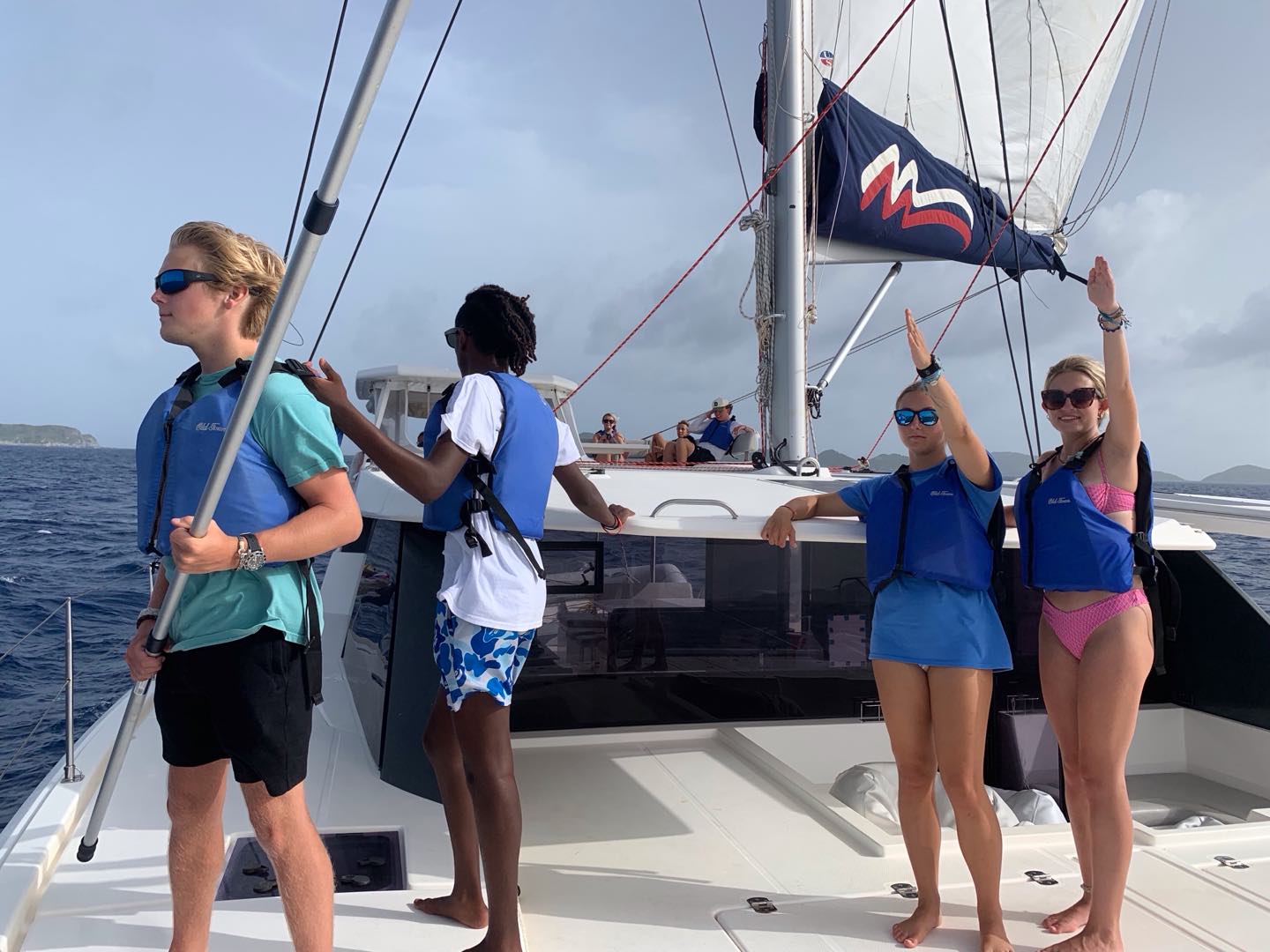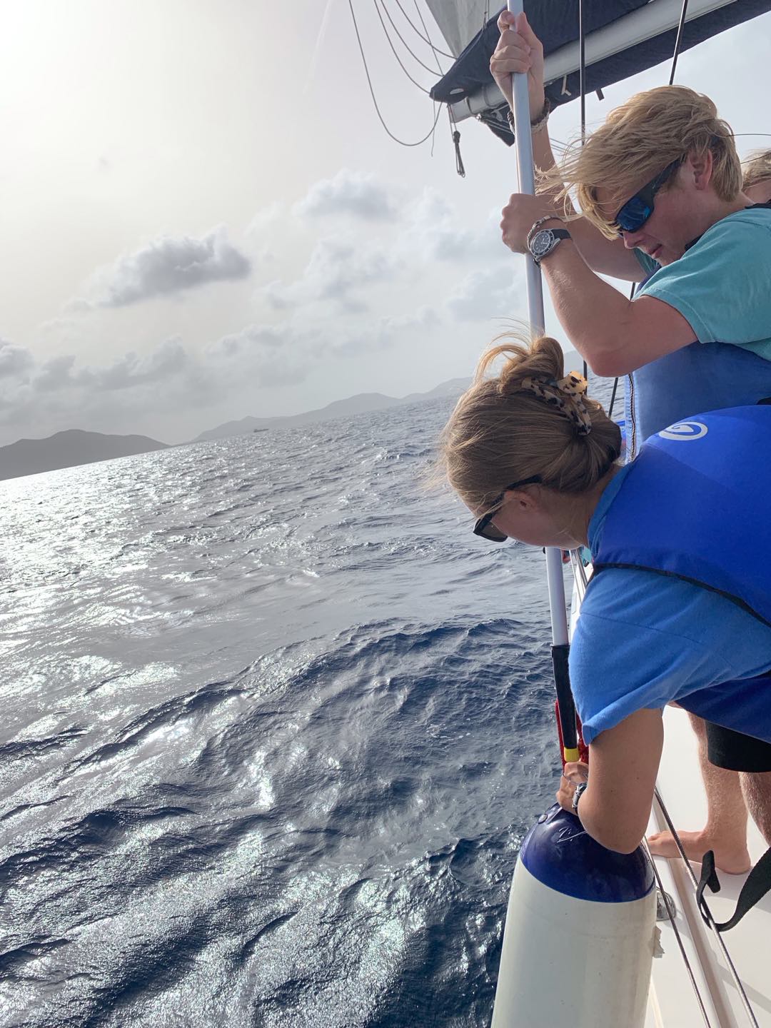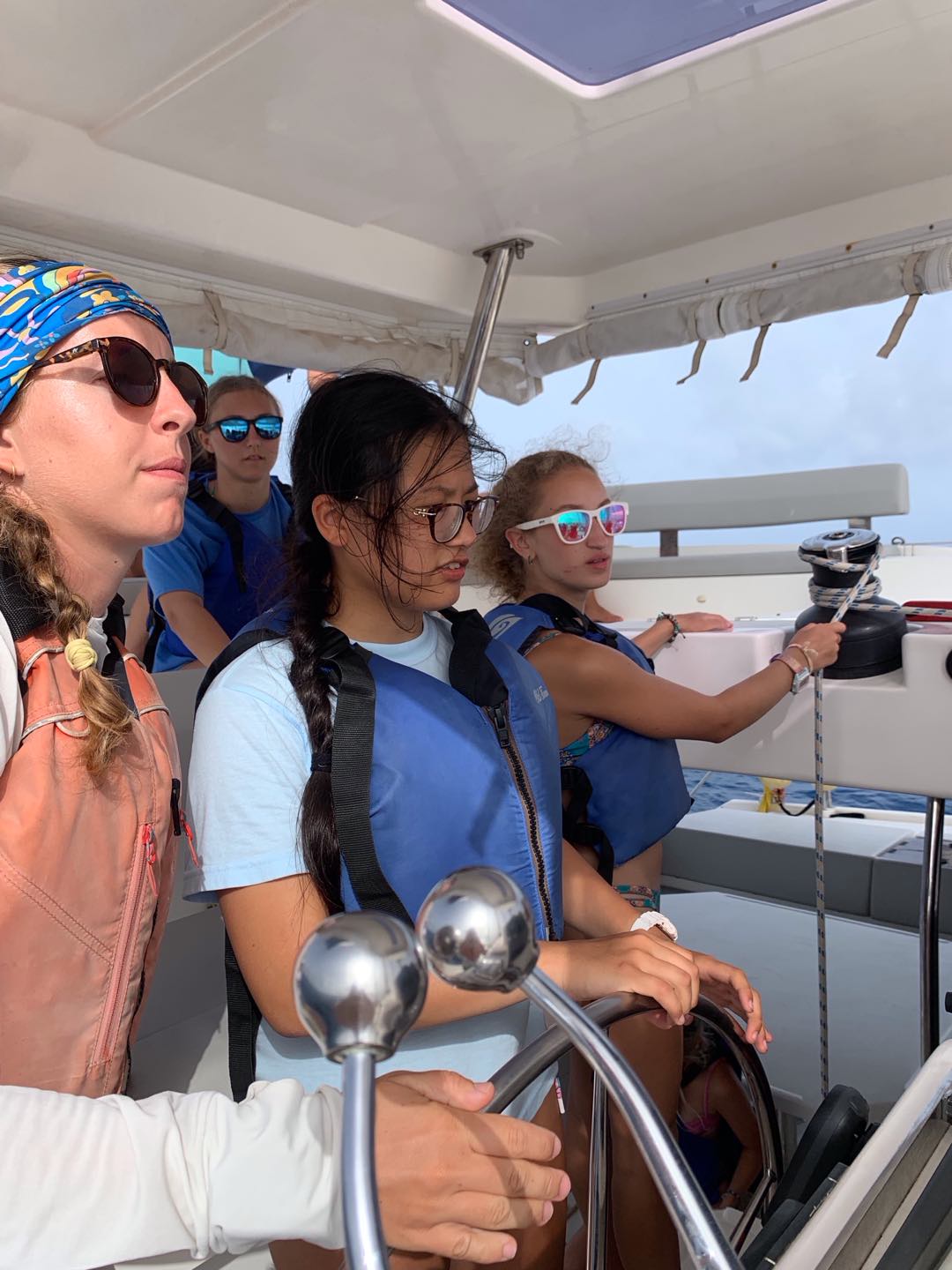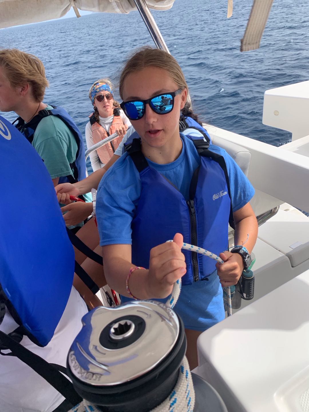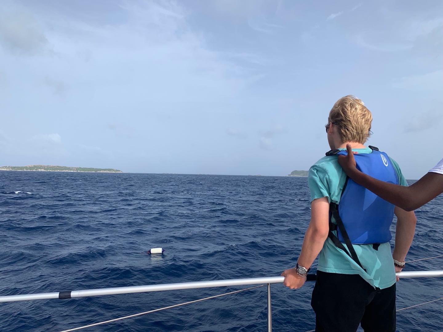 Today felt like a full week, with some of us starting the day with a 12 am wake-up for our night sail. We sailed throughout the night, with Scarlett, Roman, and Celeste taking the unfortunate 3-6 am shift. Peyton, Orly, and Evan sailed us home to the BVI’s around 9 am, ending the 18-hour sail. After a late breakfast of oatmeal, we hung out and got ready for Spanish town. We spent ages waiting for Frenchie but finally decided to ditch them. As soon as we got to Spanish town, we all ran to the alleged best chicken place in the BVIs, according to Scarlett. We waited on the sketchy green patio for 2 hours and began to doubt we would ever eat. Just as all hope was lost, the waitress brought out a platter of delicious, fresh fryer fried chicken. In typical Different Drummer fashion, we scarfed down all the food in about 5 minutes. Scarlett then snuck off and bought a little bunny jellycat we named Lil Bongo after our dinghy. Back on the boat, we prepared to do some sail training. We started with some man overboard drills using a fender we named Mighty Mike Meighan. It was pretty fun, actually, with most of us taking the helm. After we finished with that, we sailed back to Great Harbor Peter to join the rest of the Action Quest Fleet. We ended the day with a delicious feast of breakfast for dinner prepared by the whole boat while we had a dance party.