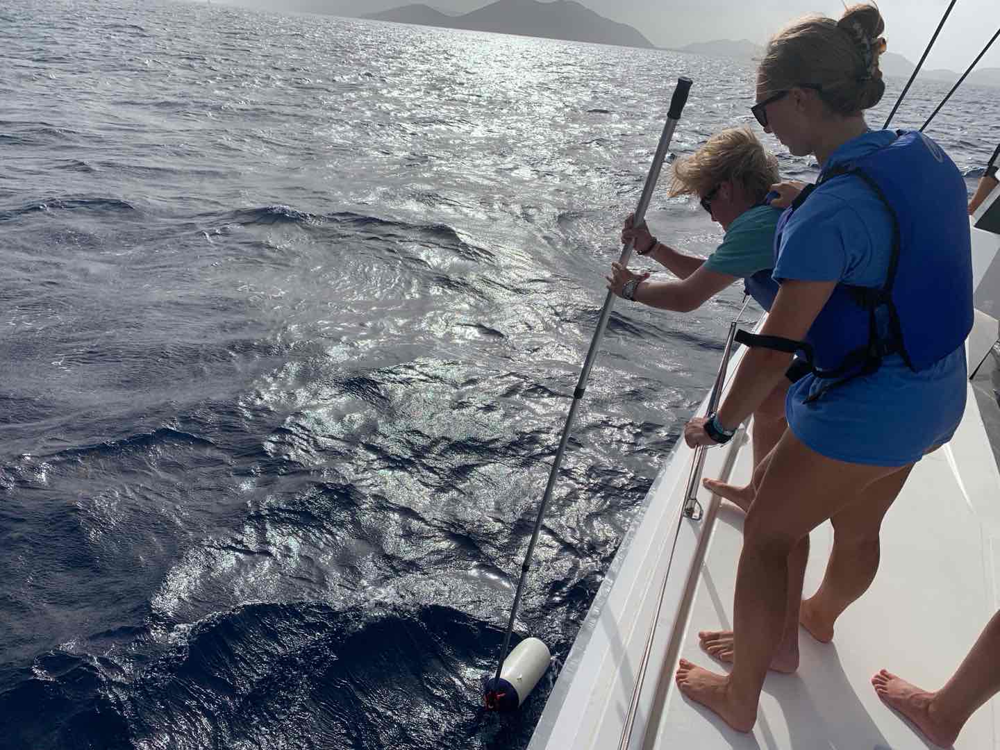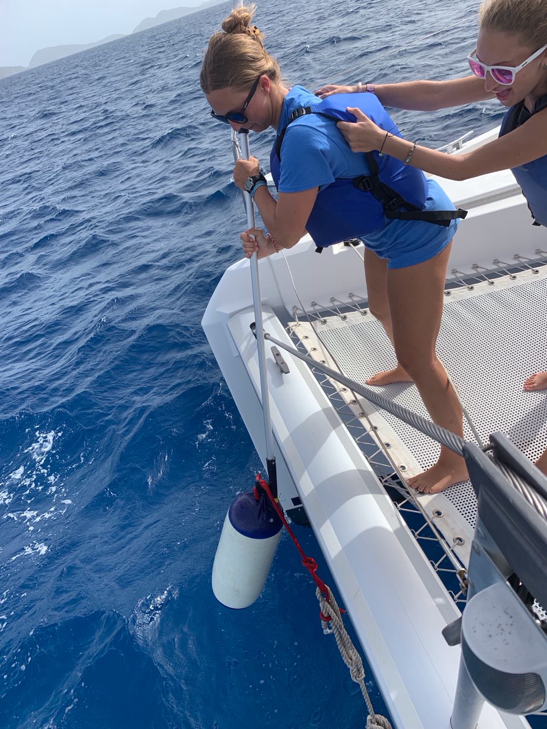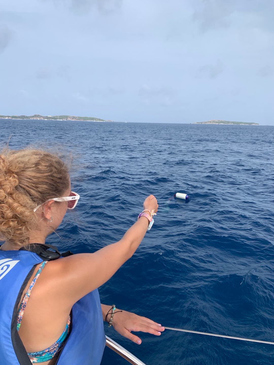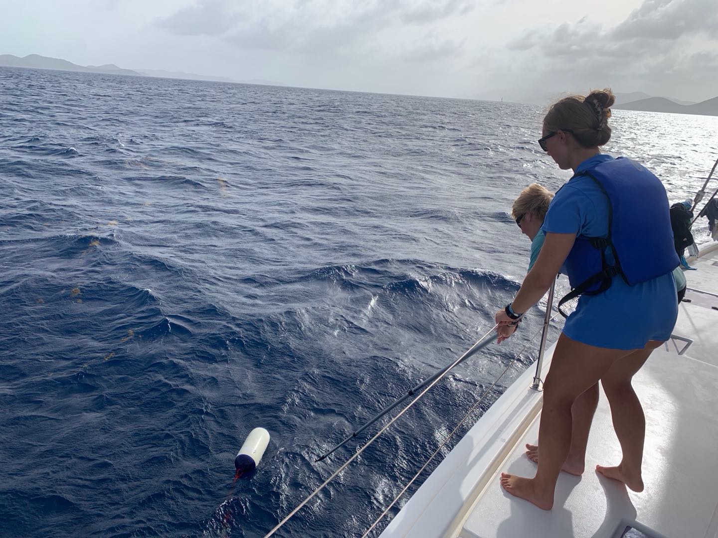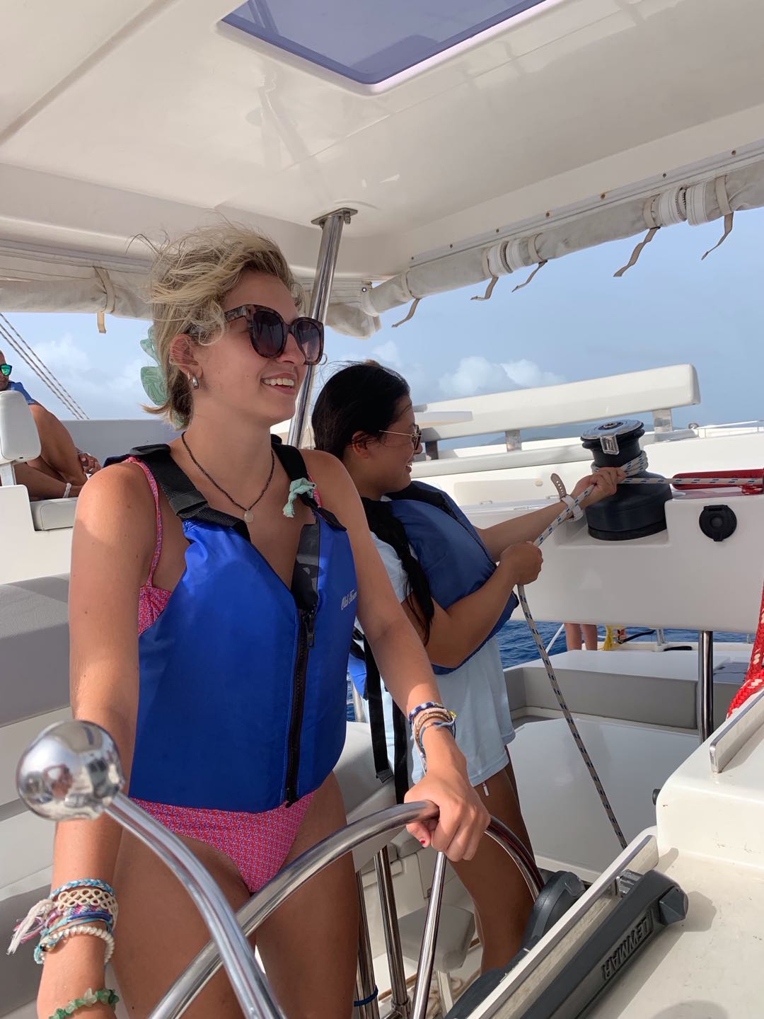Today felt like a full week, with some of us starting the day with a 12 am wake-up for our night sail. We sailed throughout the night, with Scarlett, Roman, and Celeste taking the unfortunate 3-6 am shift. Peyton, Orly, and Evan sailed us home to the BVI’s around 9 am, ending the 18-hour sail. After a late breakfast of oatmeal, we hung out and got ready for Spanish town. We spent ages waiting for Frenchie but finally decided to ditch them. As soon as we got to Spanish town, we all ran to the alleged best chicken place in the BVIs, according to Scarlett. We waited on the sketchy green patio for 2 hours and began to doubt we would ever eat. Just as all hope was lost, the waitress brought out a platter of delicious, fresh fryer fried chicken. In typical Different Drummer fashion, we scarfed down all the food in about 5 minutes. Scarlett then snuck off and bought a little bunny jellycat we named Lil Bongo after our dinghy. Back on the boat, we prepared to do some sail training. We started with some man overboard drills using a fender we named Mighty Mike Meighan. It was pretty fun, actually, with most of us taking the helm. After we finished with that, we sailed back to Great Harbor Peter to join the rest of the Action Quest Fleet. We ended the day with a delicious feast of breakfast for dinner prepared by the whole boat while we had a dance party.