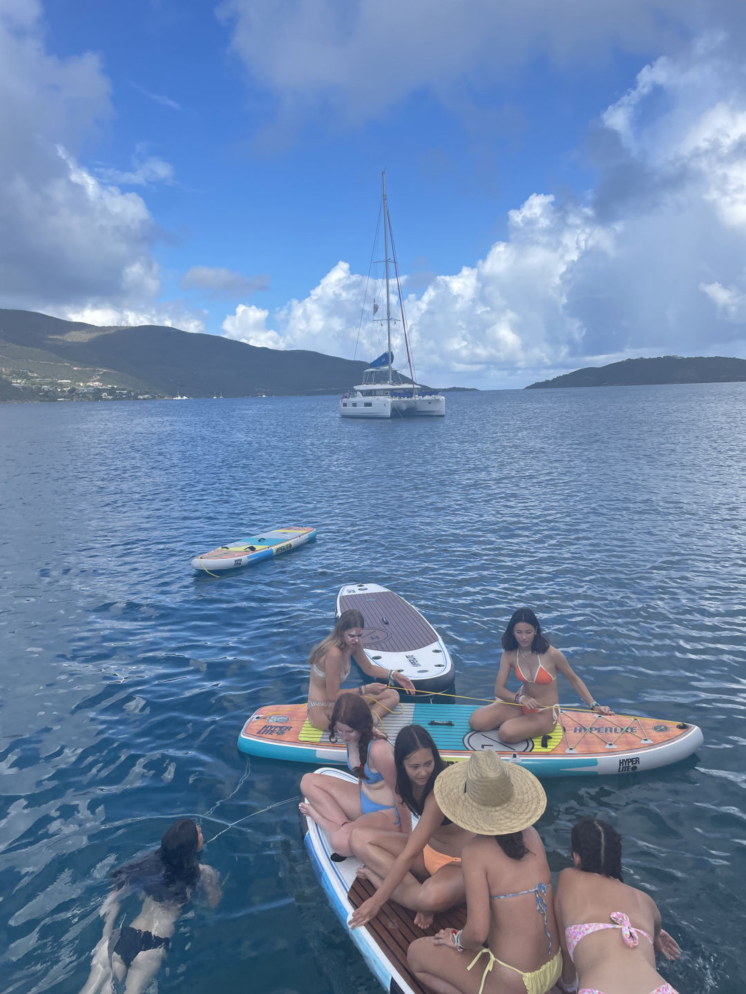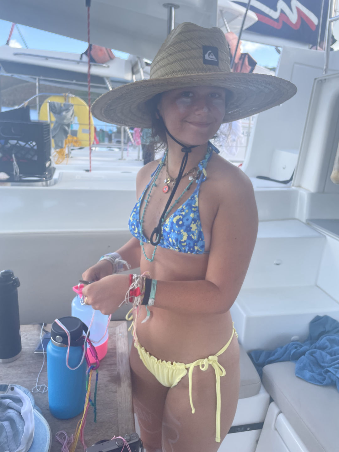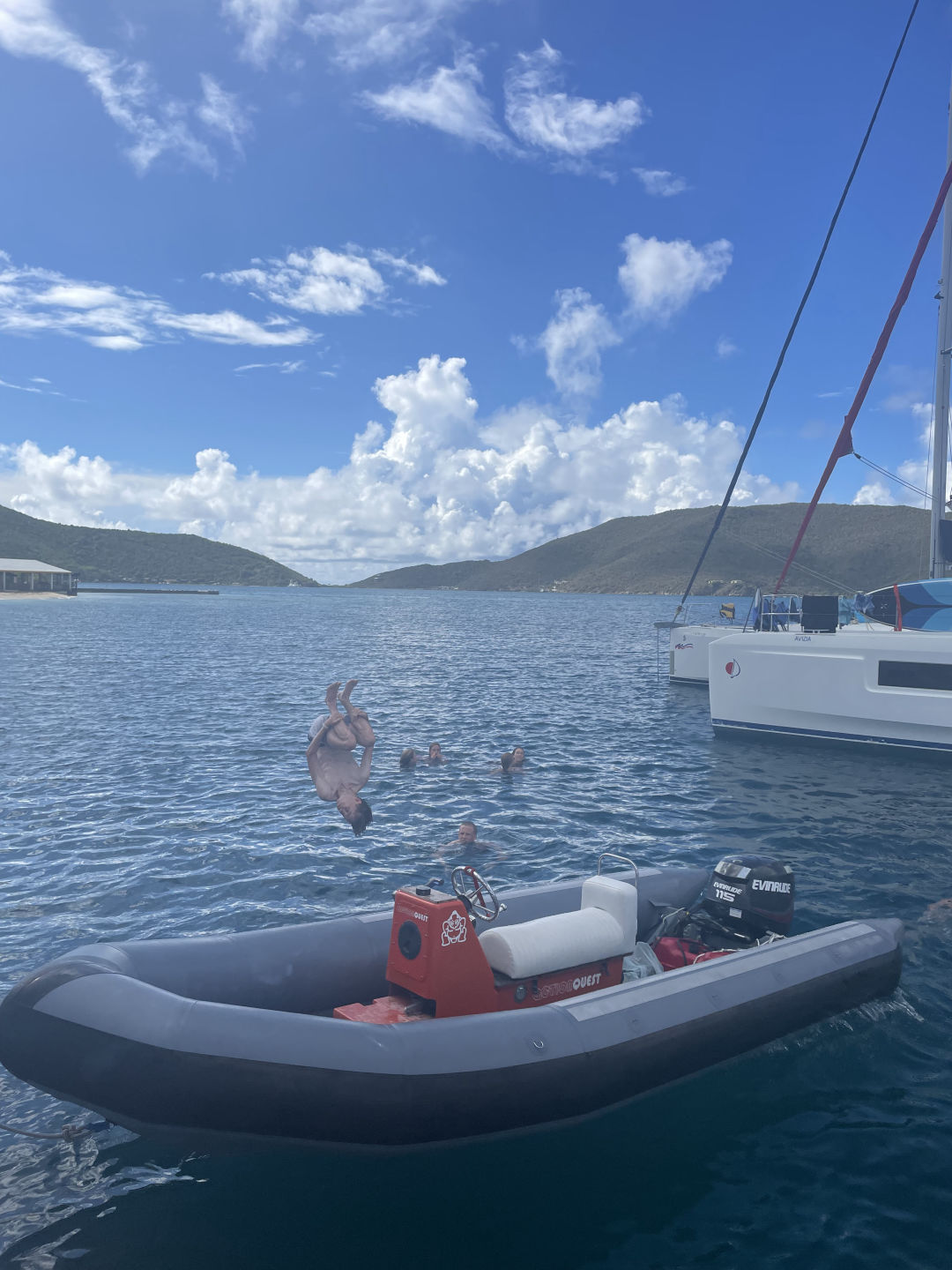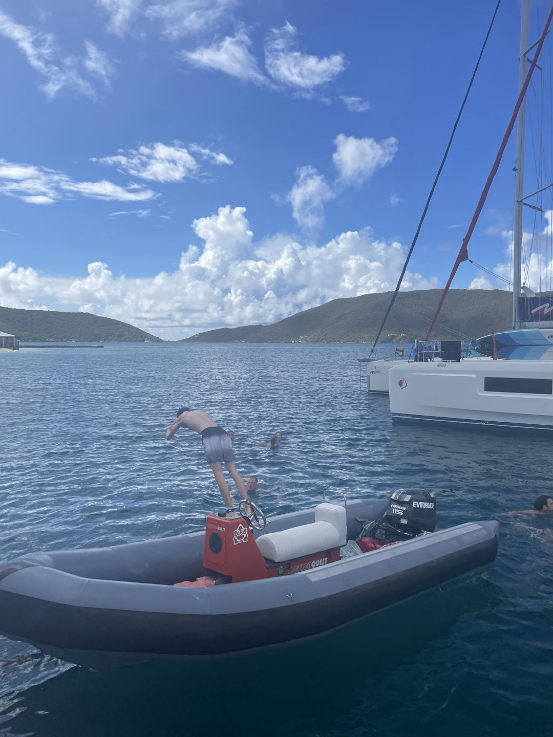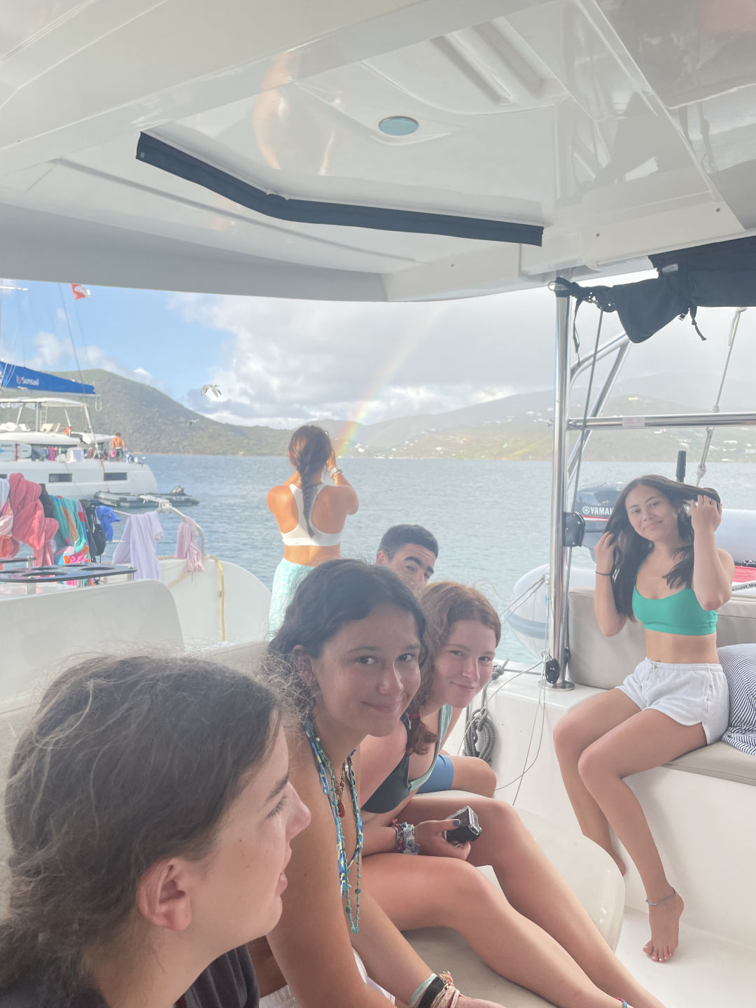 Hi, my name is Avery, and I am from North Carolina. Today we woke up to Tik Tok by Kesha, and we had a day of chaos which is hopping boats and doing different activities. Bree, Jack, Carlos, yoni, and Dylan all jumped off the dinghy. We went snorkeling, and I saw a bunch of fish and coral and took lots of pictures underwater. When we got back, we had broccoli and cheddar soup for lunch. After lunch, a big boat came through with a giant wake and shook the boat side to side, so we unrafted and picked a new anchor spot after that. Then Garrison gave us a lesson on scuba diving and safety stops. And then today, we finally got our phones back to talk to our friends and family. We also got to go to the Leverick Bay market and get snacks to fill our communal pantry. It is now stocked full. When we got back, we took quick showers and got ready for the barbecue. At the barbecue, we got to eat and go on the dance floor. After the dance, we went back and got our laundry ready to be shipped off to get cleaned. Today was a great day!