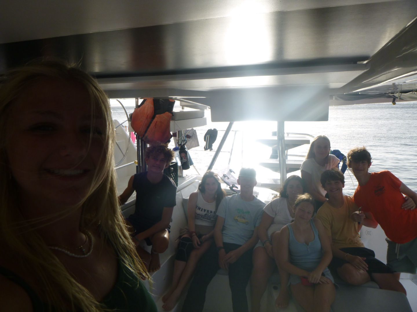 For lunch, there was a big barracuda that we named Barry, and Payton got dared to jump on it, and he did it without hesitation. Then we went scuba diving. The groups were Payton, Ellery, Tatum, and Teddy with Kaleigh. Lulu, Finn, Eres, and Oskar with Cara. And William, Bear, Georgina, and Zander with Mackenzie. It was a checkout dive, so we practiced some of the skills from last year. Most of the groups did handstands; after all, the people on Hope tried to push Tony (staff) off the boat. After scuba diving, we had boat riding, and Eres almost crashed the boat but did a great job. After that, Mike, the (owner of ActionQuest) came to our boat for dinner, and we had a delicious dinner.