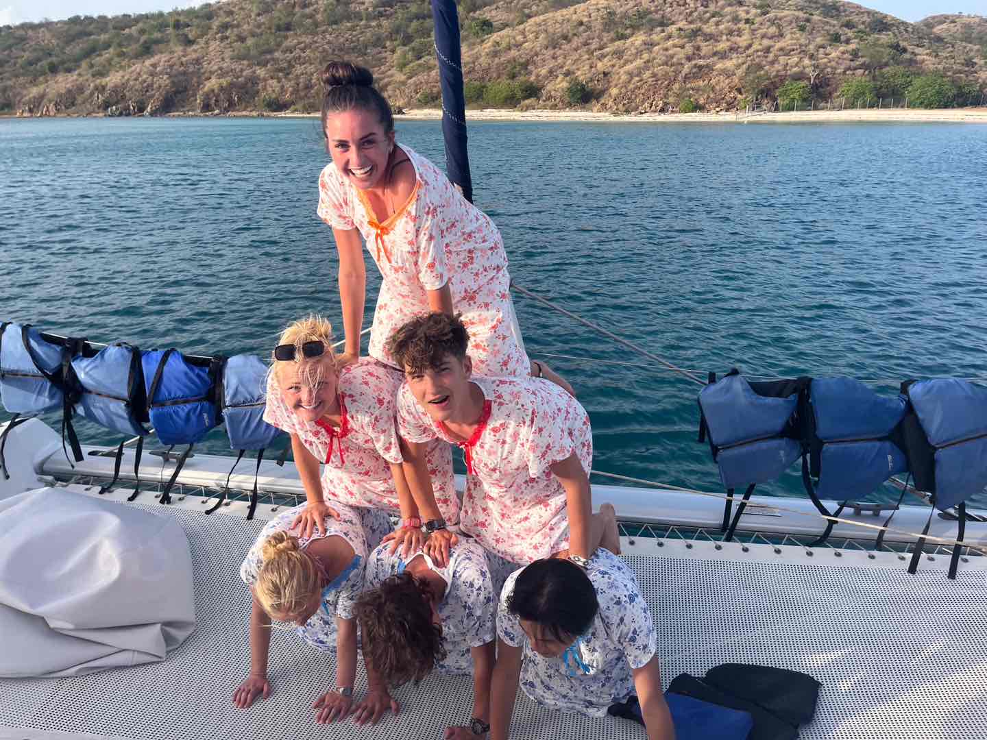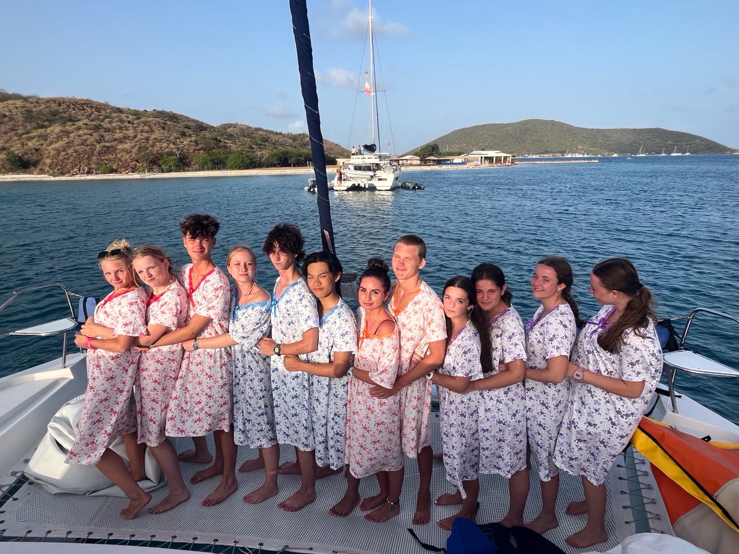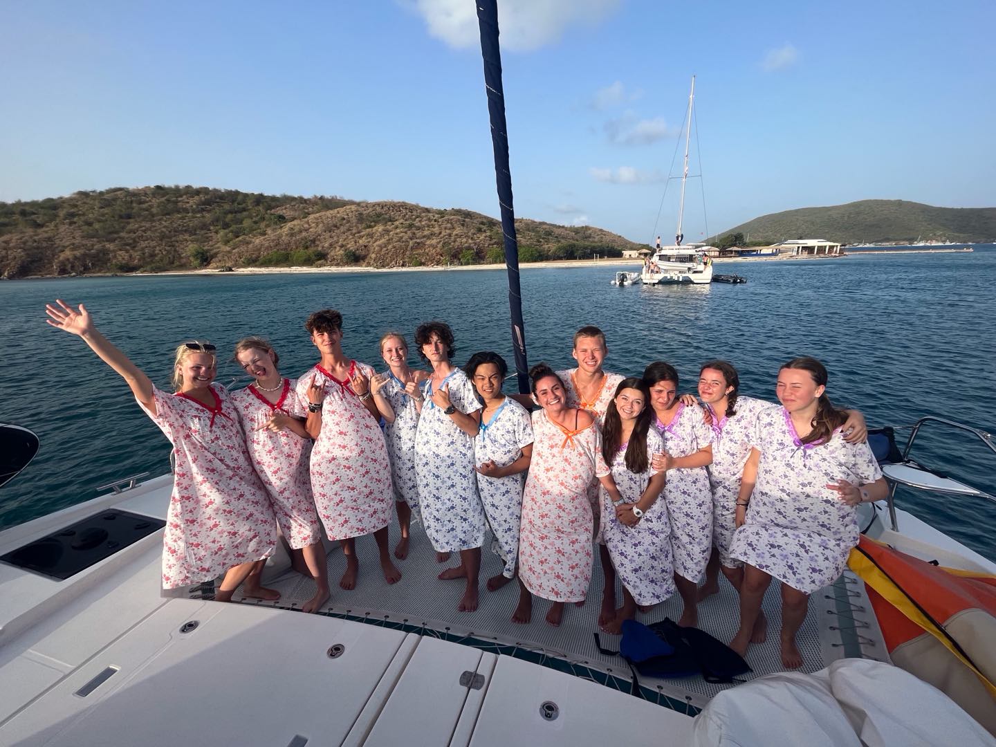 We woke up bright and early at 6 am to sail the boat out to the historical baths. We swam in the beautiful, clear water, playing chicken fights (which Tom T and Madi won) and tried to catch jellyfish in Eva’s swimsuit before trying to find the ‘jumping rock’ to jump off of. We were unsuccessful and ended up walking the entire island, getting lost, but having a whole lot of fun! On the theme of getting lost, we went into Spanishtown on Virgin Gorda for lunch and got lost following the simple instructions of ‘turn left’, but Tom and Lucy eventually led us there. We headed to a nearby store where we acquired our ‘moo moos’ (extremely ugly grandma nighties and our new team look ;), bought by everyone, even the boys, August, Tom, Tom, and Jerry. When back on the boat, I (Clemmie) sailed the 11km to our next destination (Vixen point) with help from Emma, Lexi, and Zoe on the sail. We then had dinner followed by an EPIC wobble off against the boat ‘Hope’, we won..duh..;). Today was another amazing day in paradise! 🌴