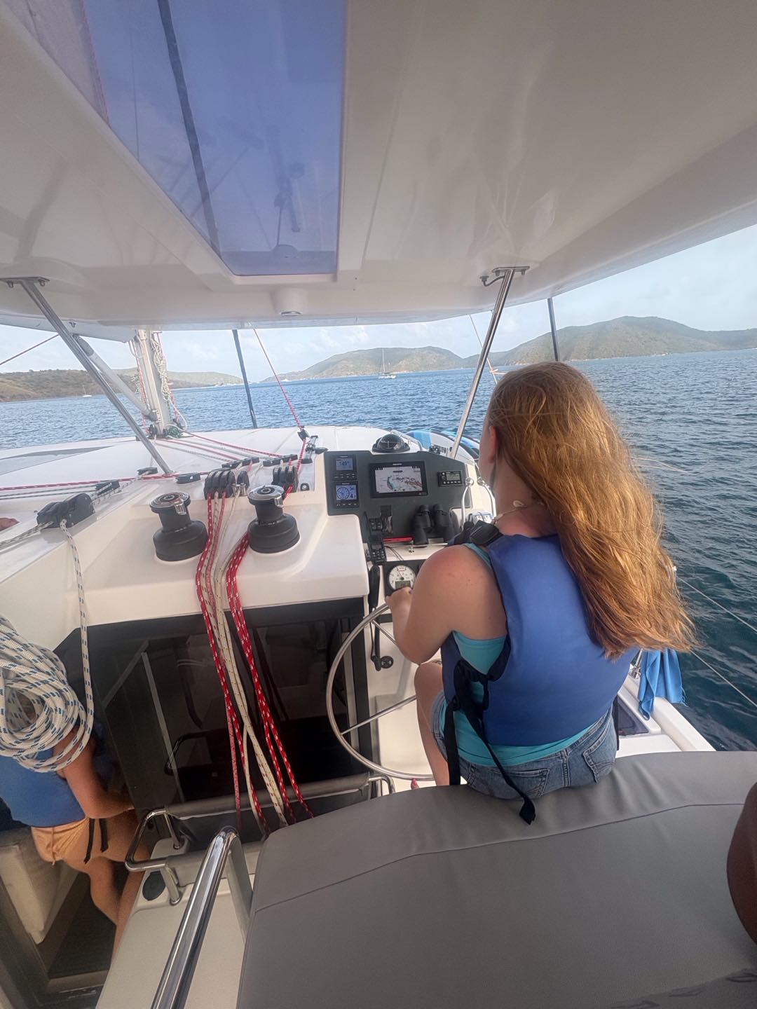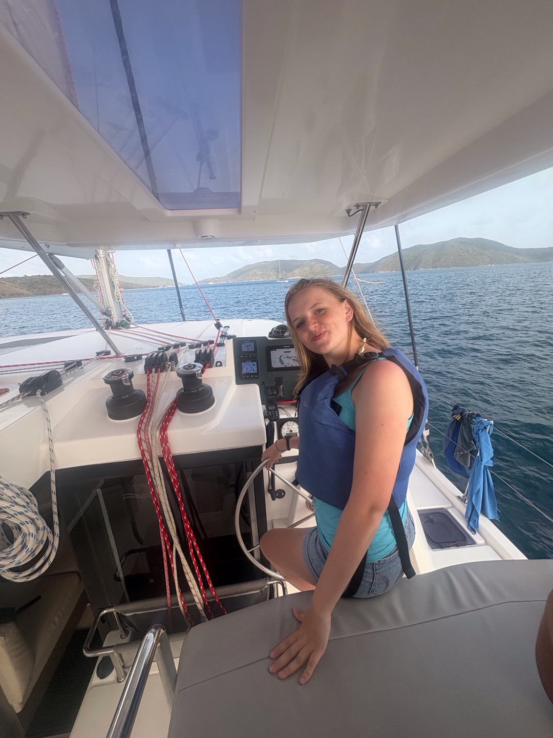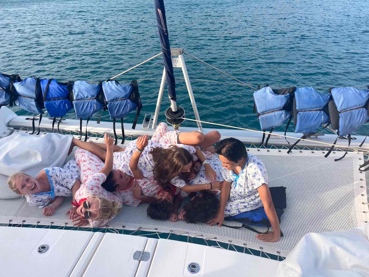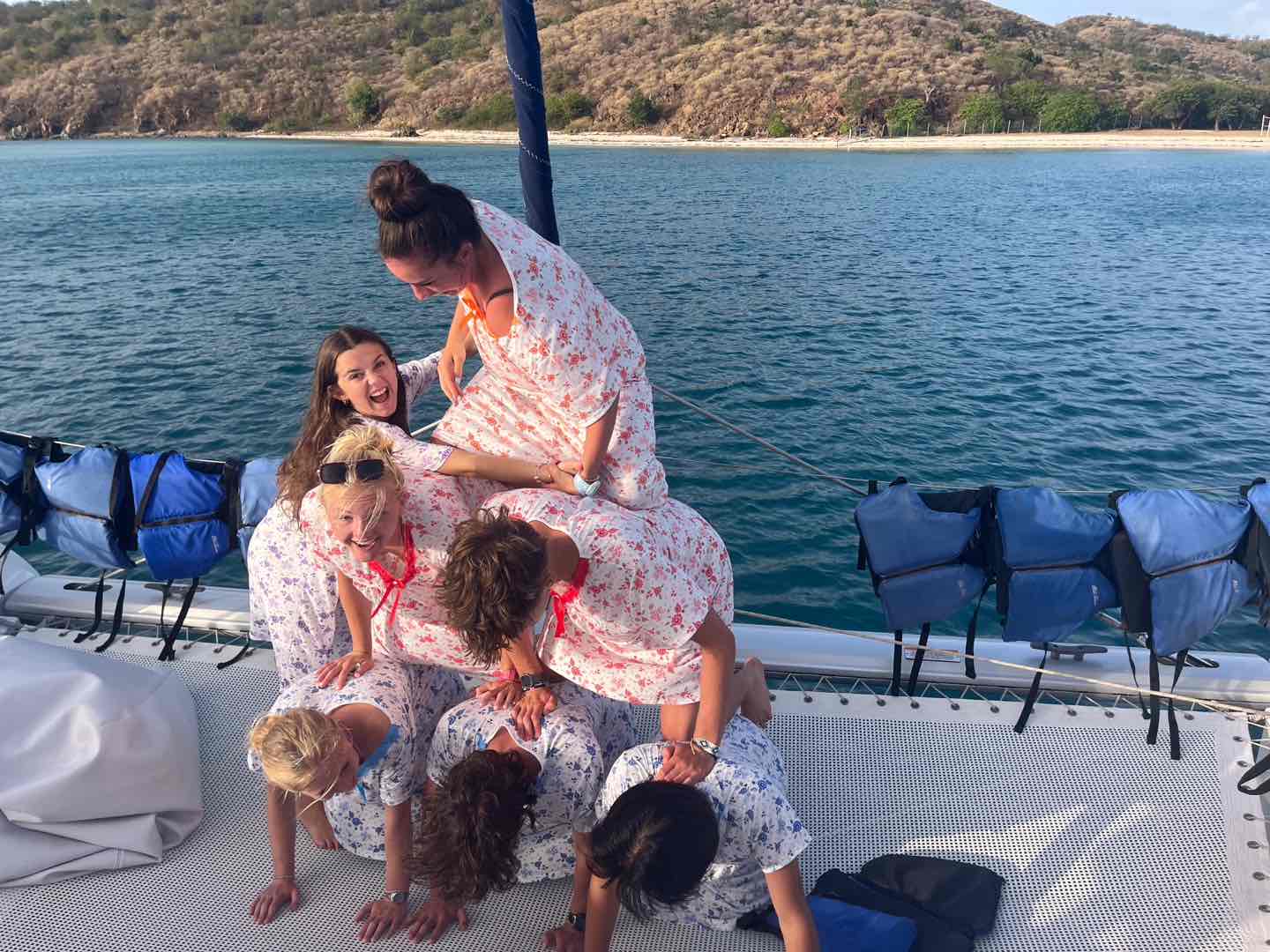 We woke up bright and early at 6 am to sail the boat out to the historical baths. We swam in the beautiful, clear water, playing chicken fights (which Tom T and Madi won) and tried to catch jellyfish in Eva’s swimsuit before trying to find the ‘jumping rock’ to jump off of. We were unsuccessful and ended up walking the entire island, getting lost, but having a whole lot of fun! On the theme of getting lost, we went into Spanishtown on Virgin Gorda for lunch and got lost following the simple instructions of ‘turn left’, but Tom and Lucy eventually led us there. We headed to a nearby store where we acquired our ‘moo moos’ (extremely ugly grandma nighties and our new team look ;), bought by everyone, even the boys, August, Tom, Tom, and Jerry. When back on the boat, I (Clemmie) sailed the 11km to our next destination (Vixen point) with help from Emma, Lexi, and Zoe on the sail. We then had dinner followed by an EPIC wobble off against the boat ‘Hope’, we won..duh..;). Today was another amazing day in paradise! 🌴