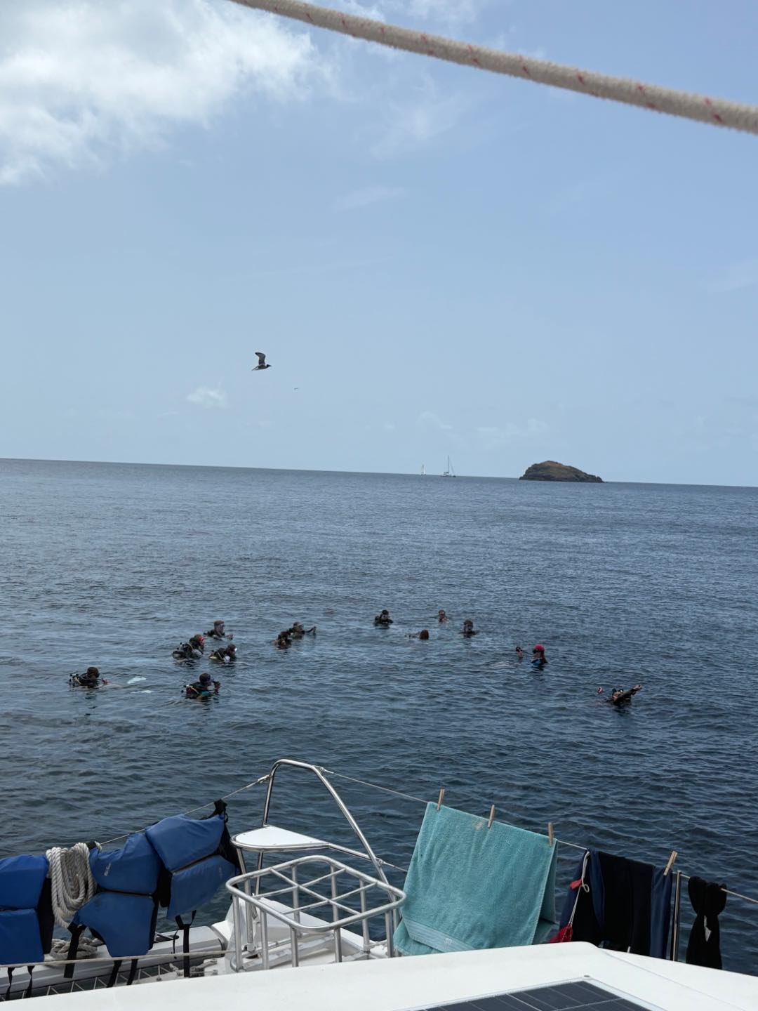Today we woke up to the sweet smell of French toast made by Ari and Josie. After breakfast, we got ready to jump in the water for our first-ever research dive. Our goal was to ID as many fish as possible to understand the reef’s populations. So much fun! Once we dried off, we headed to Leverick Bay for lunch on shore. We had a nice two hours of exploration and long-awaited phone time! After a semi-homesickening call with you all, we got suited up again to explore the mangroves on Vixen Island. Then the night slipped into our classic routine of daily ocean showers. Until we put on our nicest outfits to hit the dance floor and take sunset pictures, we would be hitting the dance floor with all the other Action Quest students at our first-ever BBQ at Leverick Bay. We had a classic cookout dinner of salads, pulled pork, burgers, and fresh watermelon. While Tyler was socializing and enjoying Dj Heavy Beats (a Dj veteran for AQ); Josie, Emi, and Mahe enjoyed the evening breeze in the hammocks. Once our social batteries had been drained, Kylie, Juno, Juju, Antonio, Ellie, Sonja, and Ari played a paranoid game of Paranoia. Eventually, 10 o’clock rolled around, and we dinghyed back to our second home, Vela Vita. After our usual nightly yap session, we headed to bed, ready for another lovely day tomorrow!