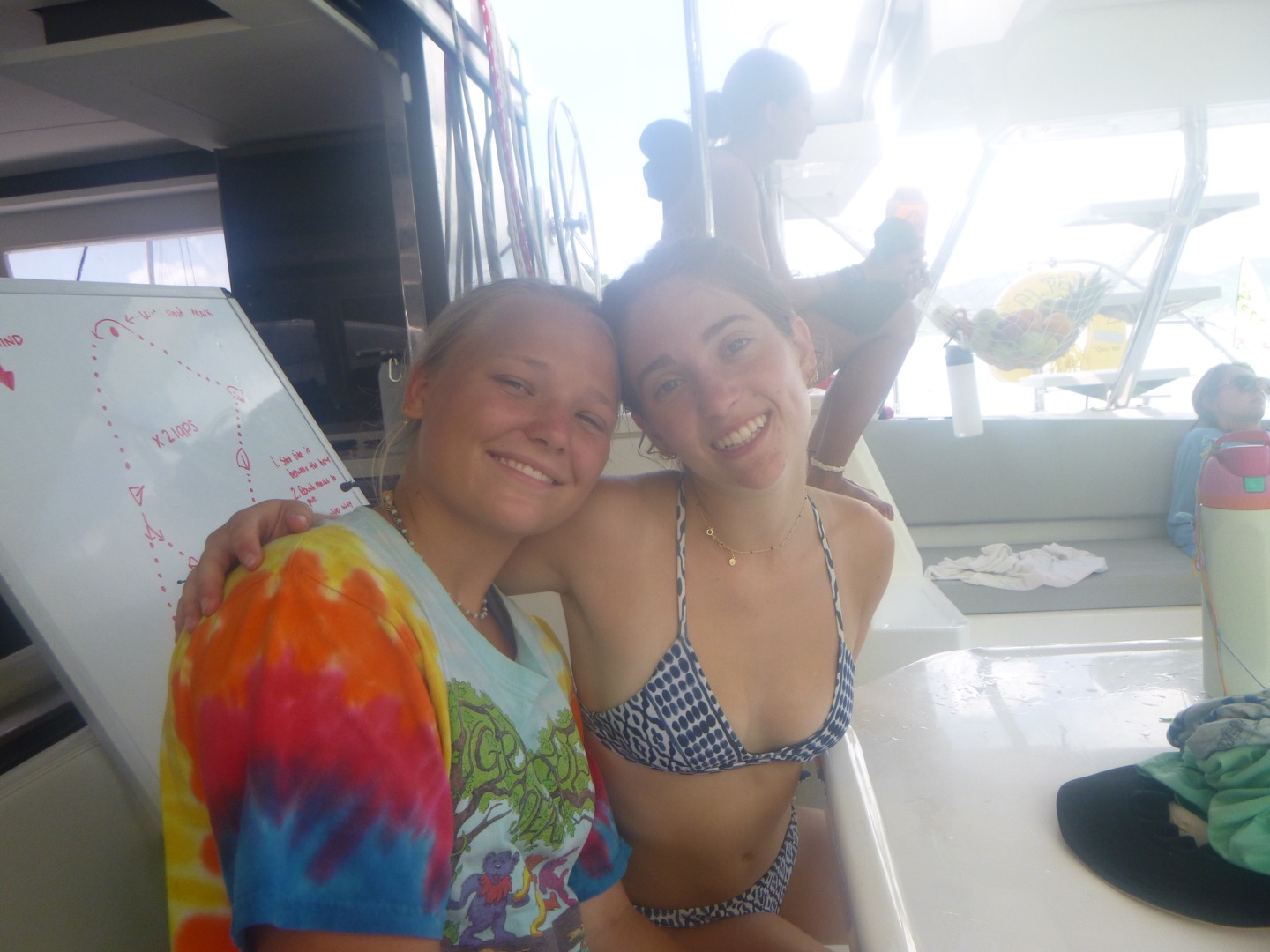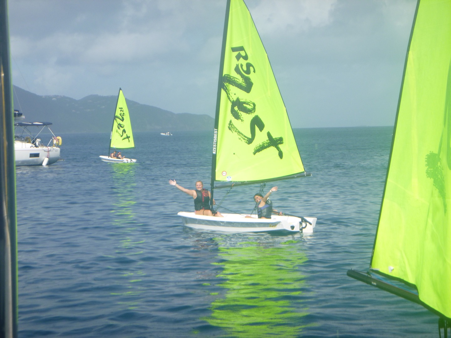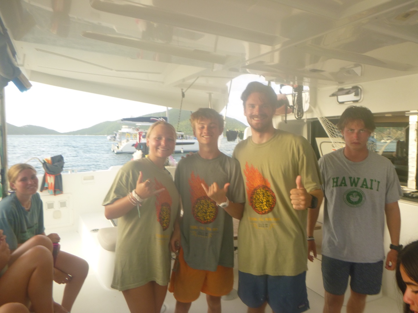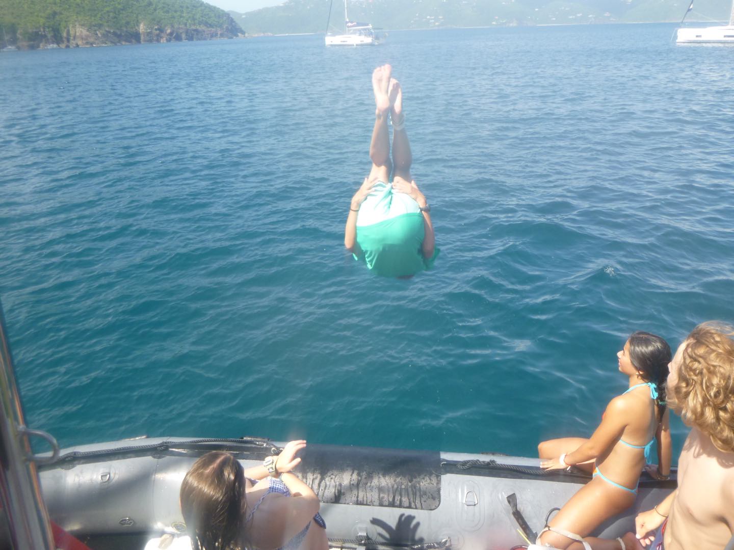 Good evening! Today started with Garrett blasting music too loud at seven in the morning. Claire and Freddy, chef and sous chef, began making eggs while the rest of us got ready for another rotation day consisting of zesting, hiking, water sports, and diving. After eating eggs, we headed to Alpen Glow for our first rotation, zesting. After a big sail training day yesterday, everyone felt more confident on the zests. Catherine and Jordan, who were high in spirits, were successful but managed to flip their boat all the way over, while Freddy and Alyssa came out on top of the race. Ella did backflips off of the dinghy, and Rachel learned how to backflip for the first time. Post-zesting, we did a short but rigorous hike, and while most of us complained about intense inclines, Rachel maintained a positive attitude the whole time. Freddy kept us going by recapping Forrest Gump; Molly was the caboose and kept the group together. Exhausted after the hike, we began making lunch and doing a dishy pit. Lunch was Tuscan white bean soup, crackers, and salt and vinegar Pringles. After eating, we stayed on Odyssey for water sportsssss.