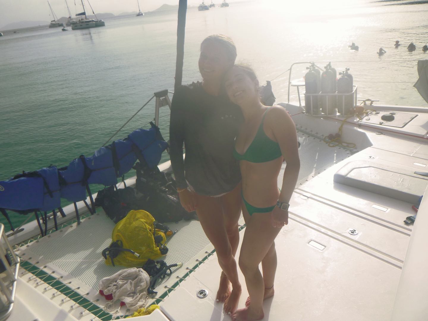 Brig knee-boarded and managed to perform not just one or two but three 360s. Alyssa tried water skiing for the first time and was impressively able to get up. Next, we geared up to dive with our instructors. We’re nearing the end of training for our PADI open water certification, so we dove around 30 feet, worked on skills such as full mask floods and weight checks, and explored the ocean. Jordan and Brig did barrel rolls and backflips during the safety stop. Molly, who was sick and couldn’t dive, talked to friends on Frenchie and pulled in dinghies coming for water sports. Our last event of today was a beach barbecue. We ate burgers and hot dogs and socialized with other boats. Tucker and Carson talked to friends on Alpen Glow and Shamwari, and Freddy played American Football for the first time. We all took ocean showers in the dark, and as I’m writing this, Tucker just fell into the water trying to retrieve his shirt from Sumo. We’re all thriving and sending love home!!