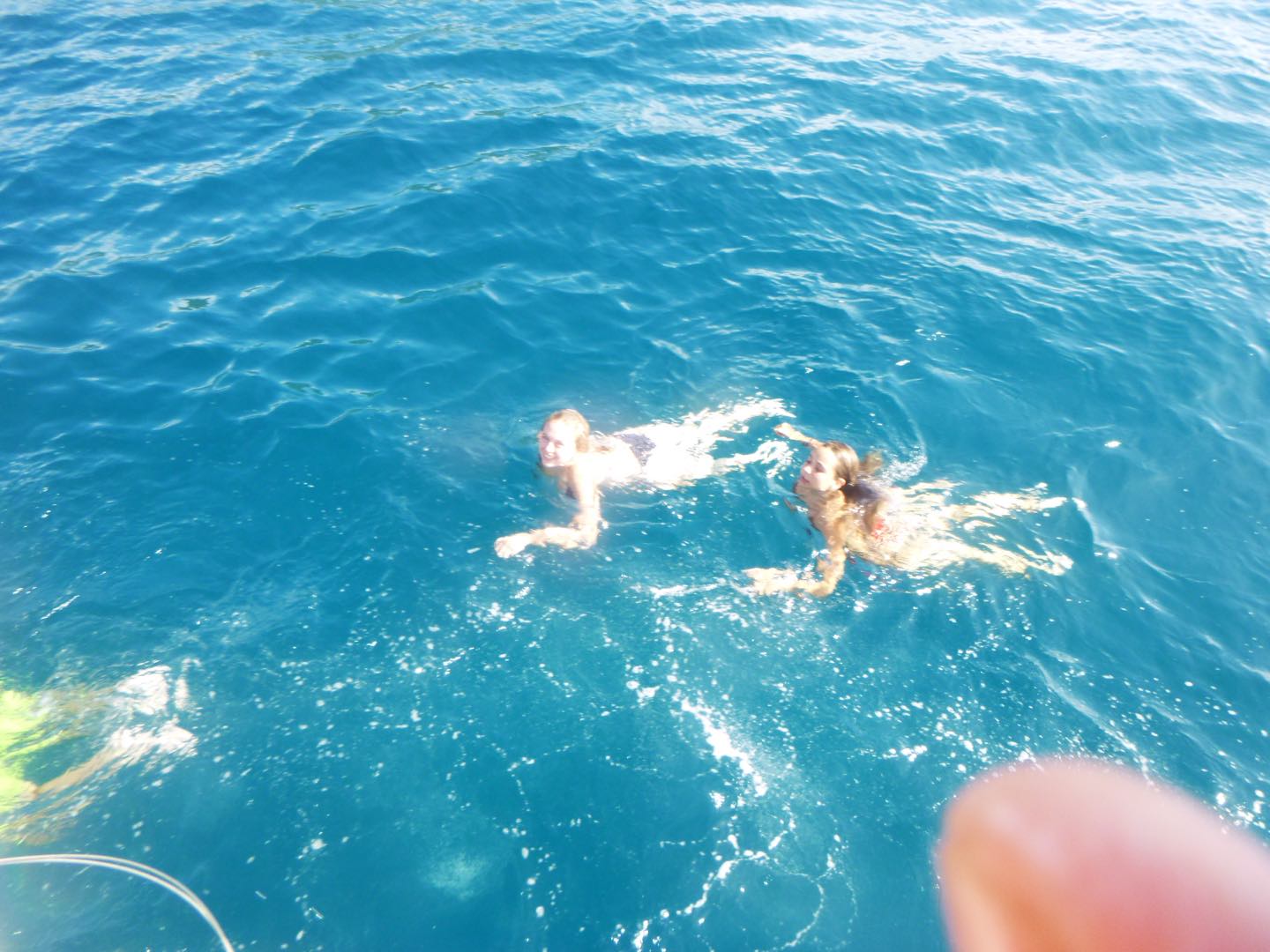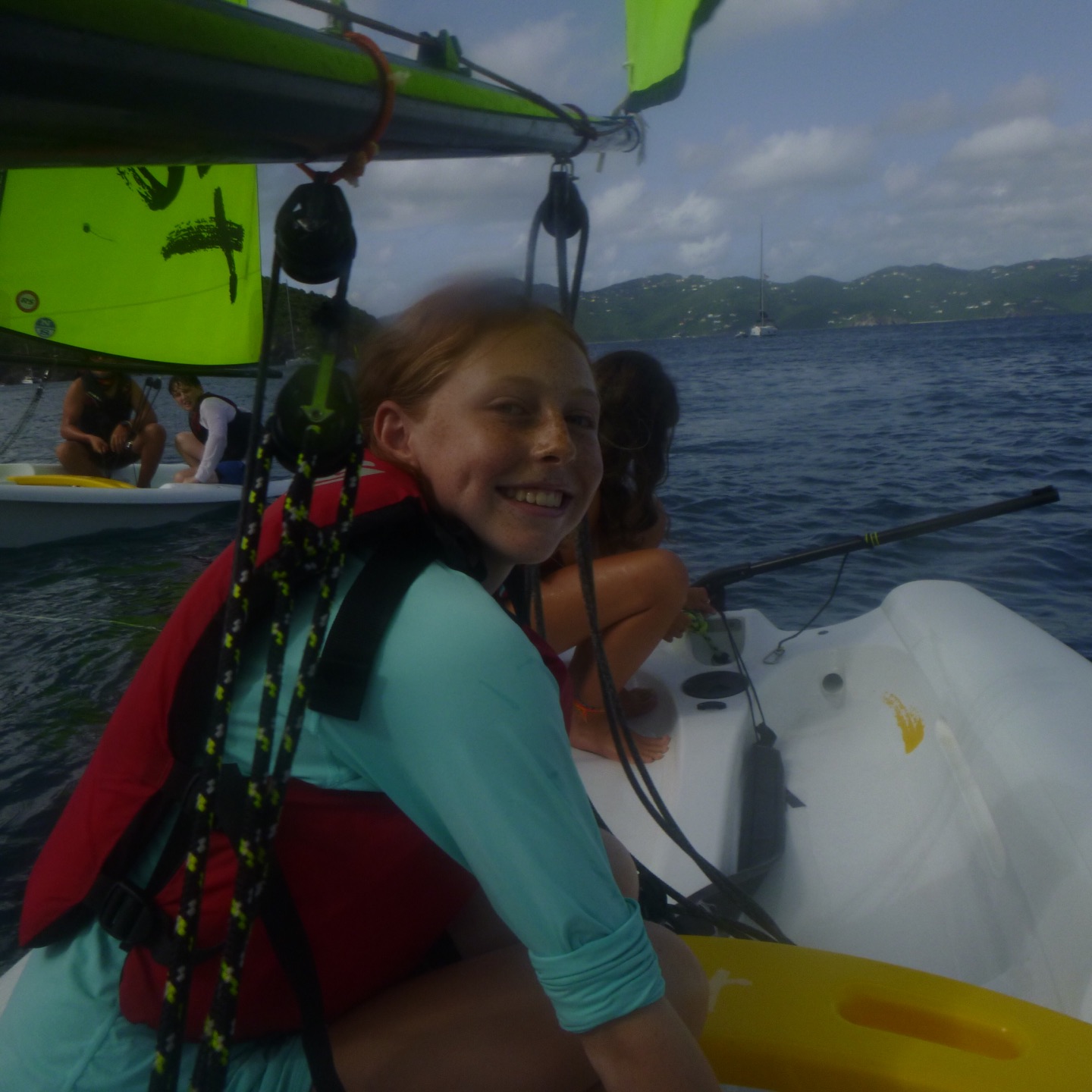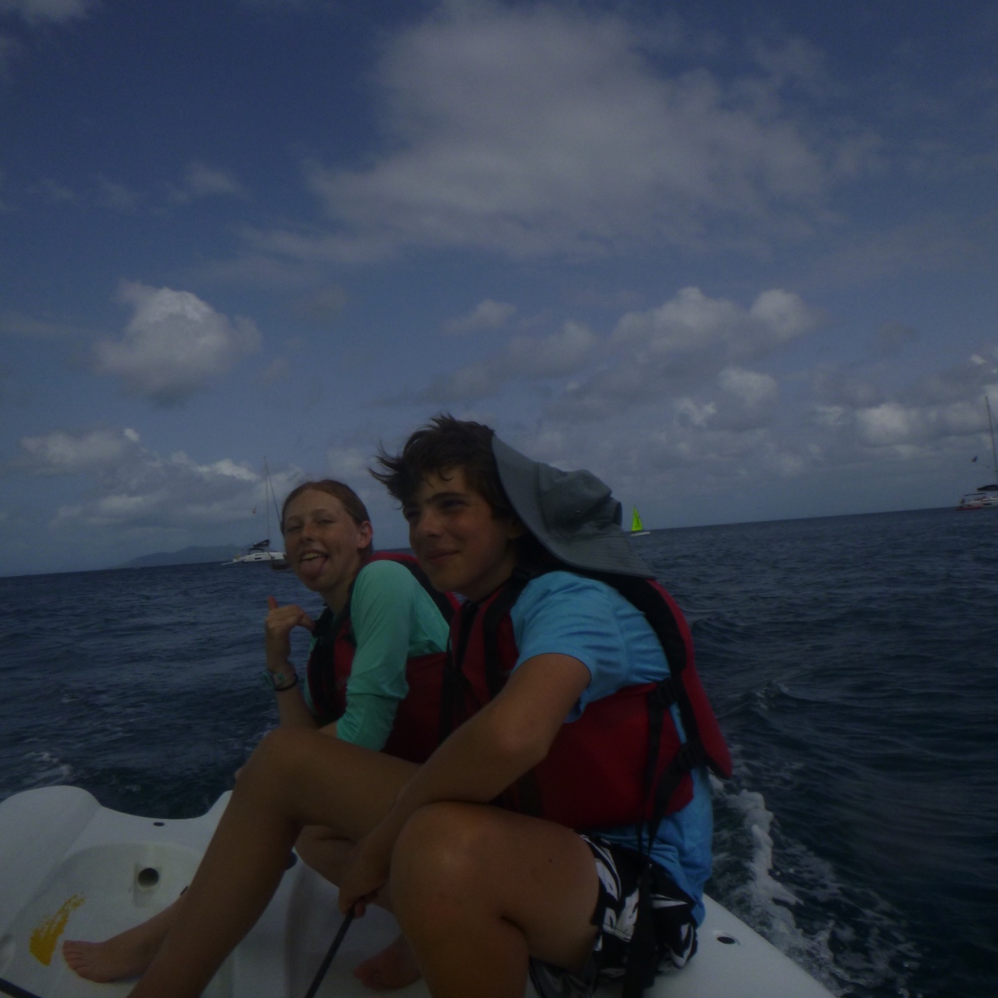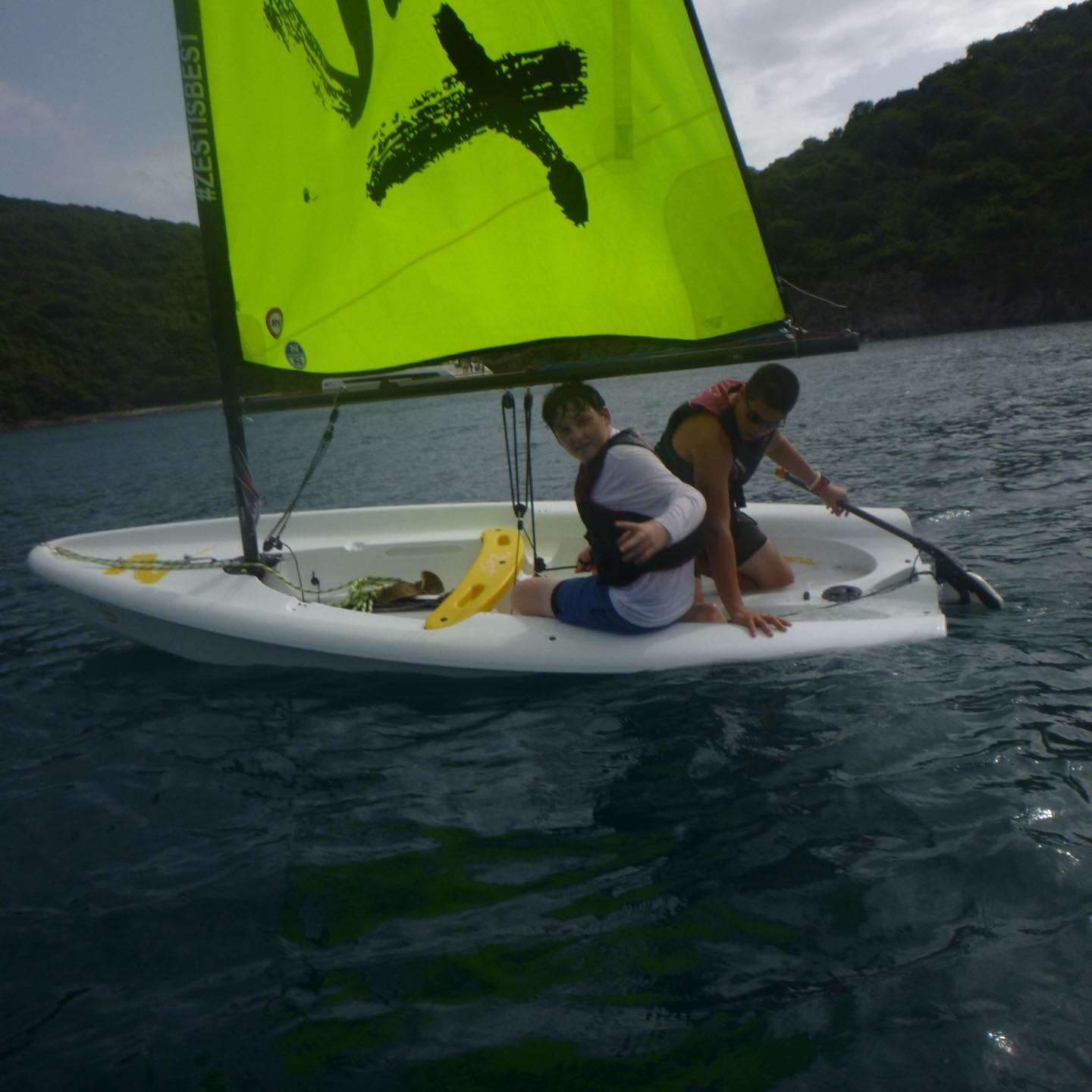 The day started at the very pleasant hour of 3:00 in the morning because, being the little Rapscallions that we are, we were seeking a laugh and revenge. We pulled a prank on the other boats, everyone woke up at 3:00 am, except me. I was supposed to wake everyone up that was going, but I (that is Holden) have a smooth kola brain, as Mike would say, and can’t set an alarm on my wristwatch to save my life. So thankfully, while I slept in the fox hole, Pearl, Katy, Cam, Dawson, Kennedy, and Mike quietly drove through the water under the early morning fog in a dingy rounding up fenders (these inflatable buoys that we tie to the side of a boat when docking to protect a hull) which went smoothly except for a few boats that wised up and hid their fenders. The premise of the prank was that we would take every boat’s fenders (which each boat has three of) and leave them all on one boat, a little mono-hull called Glad 2 b here. When I pulled myself out of the fox hole, it was a little before everyone else woke up, who then had to cook breakfast half asleep while blasting music. We had some pretty good eggs and some breakfast muffins with pineapple, and then it was go time. We had a rotation day today, so Suki, Katy, and I set sail in the zests (zests are small little sailboats we get to sail around the fleet) Cam, Dawson, Jovian, and Andrew also zested around the boats and fleet while the rest of the boat relaxed, read, and sunbathed. Oh, and Will, the captain of Glad 2 b here, asked Mike why there were now 20 fenders hidden in his sails.