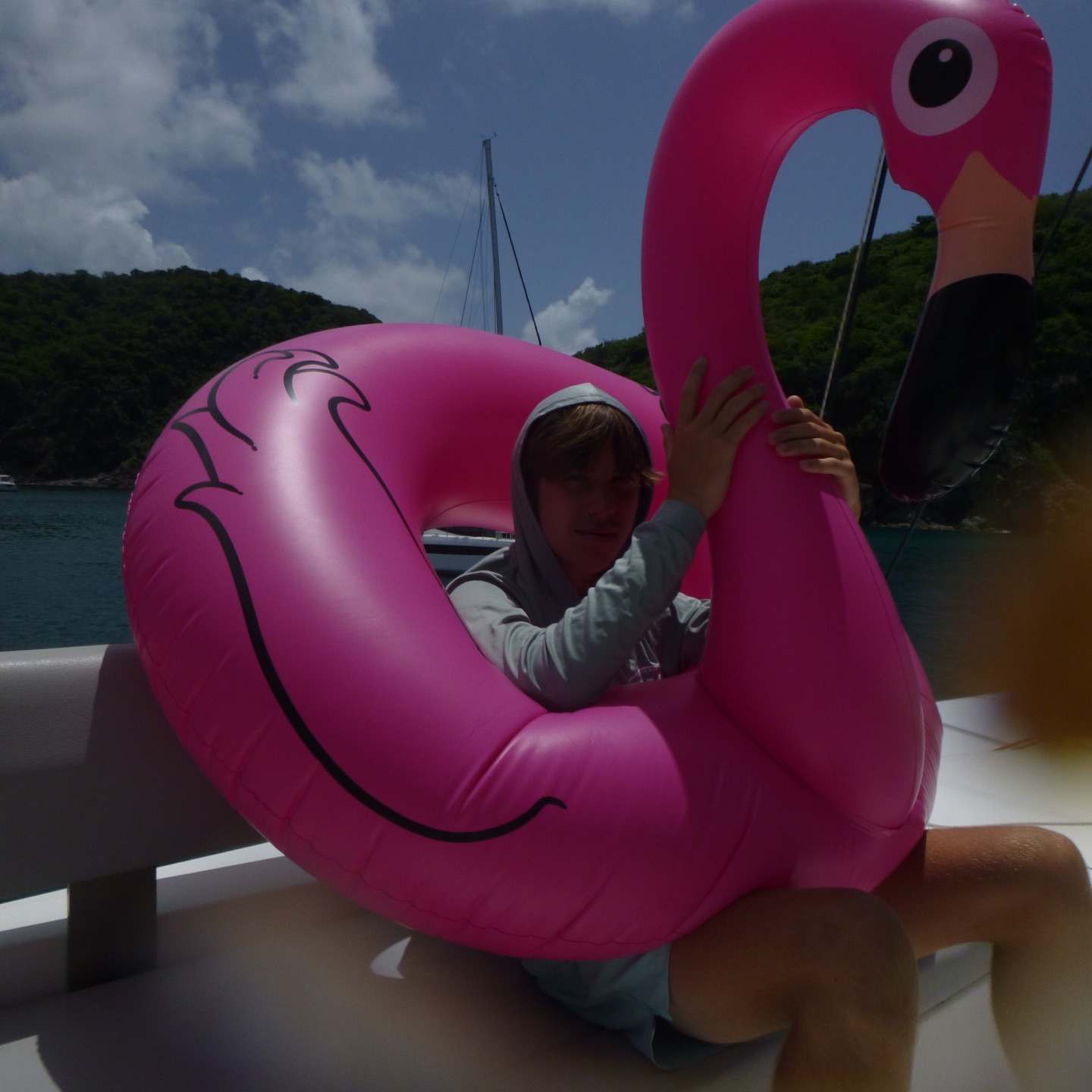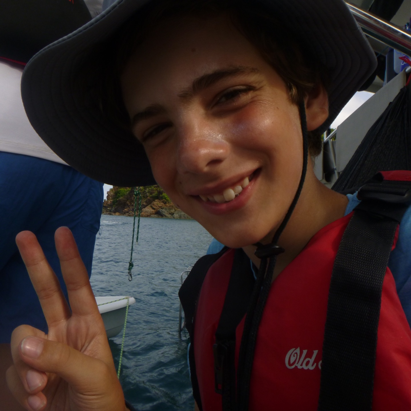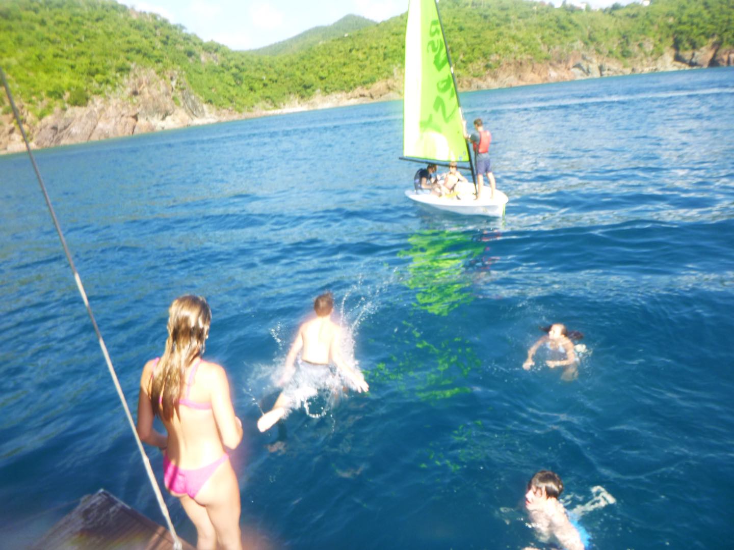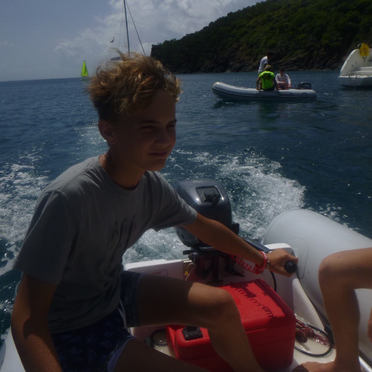 The day started at the very pleasant hour of 3:00 in the morning because, being the little Rapscallions that we are, we were seeking a laugh and revenge. We pulled a prank on the other boats, everyone woke up at 3:00 am, except me. I was supposed to wake everyone up that was going, but I (that is Holden) have a smooth kola brain, as Mike would say, and can’t set an alarm on my wristwatch to save my life. So thankfully, while I slept in the fox hole, Pearl, Katy, Cam, Dawson, Kennedy, and Mike quietly drove through the water under the early morning fog in a dingy rounding up fenders (these inflatable buoys that we tie to the side of a boat when docking to protect a hull) which went smoothly except for a few boats that wised up and hid their fenders. The premise of the prank was that we would take every boat’s fenders (which each boat has three of) and leave them all on one boat, a little mono-hull called Glad 2 b here. When I pulled myself out of the fox hole, it was a little before everyone else woke up, who then had to cook breakfast half asleep while blasting music. We had some pretty good eggs and some breakfast muffins with pineapple, and then it was go time. We had a rotation day today, so Suki, Katy, and I set sail in the zests (zests are small little sailboats we get to sail around the fleet) Cam, Dawson, Jovian, and Andrew also zested around the boats and fleet while the rest of the boat relaxed, read, and sunbathed. Oh, and Will, the captain of Glad 2 b here, asked Mike why there were now 20 fenders hidden in his sails.