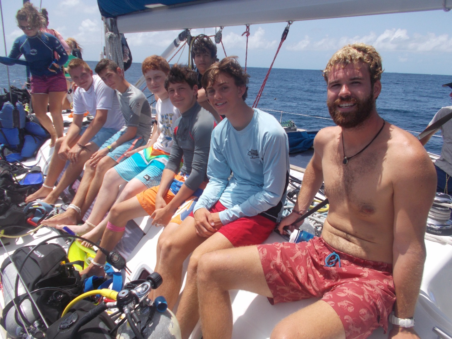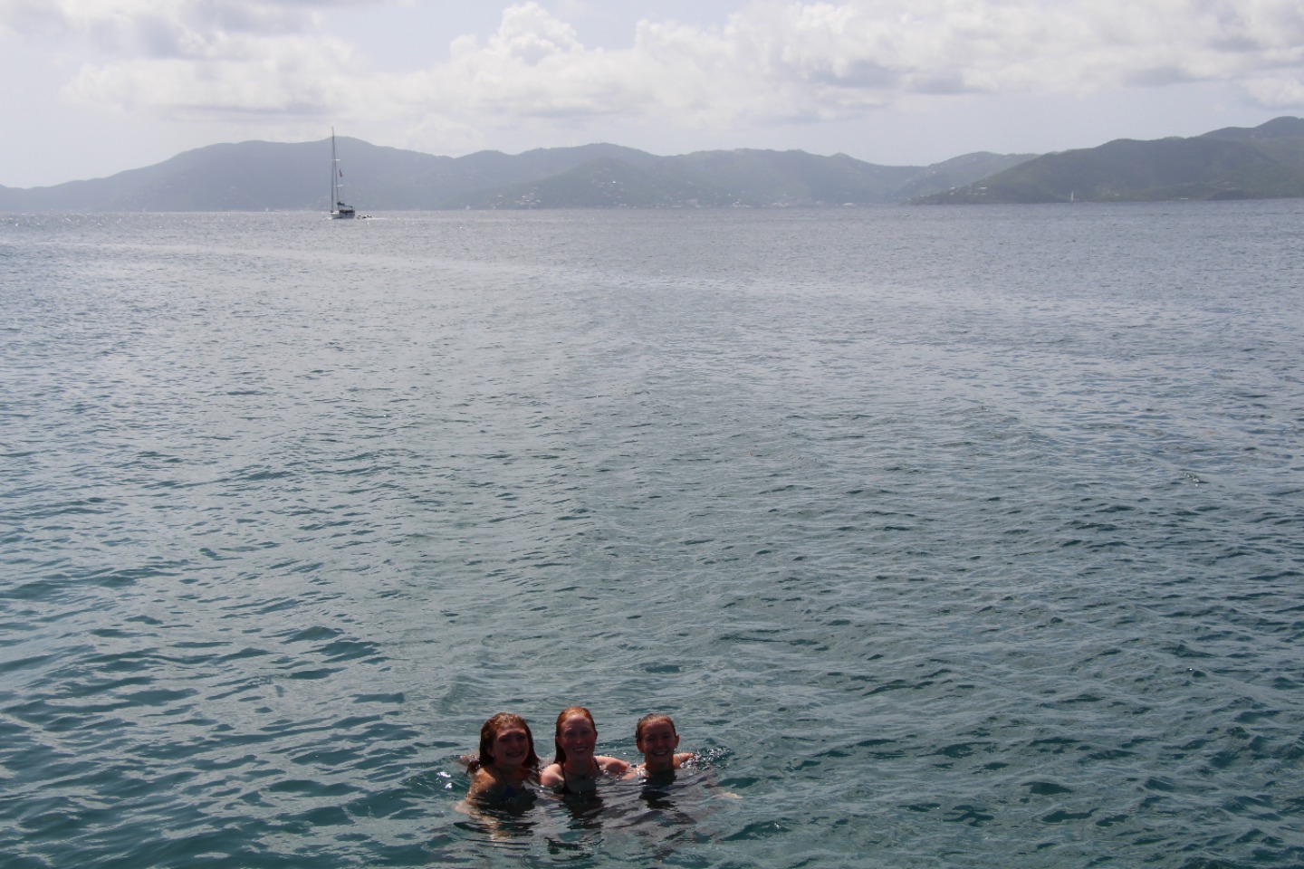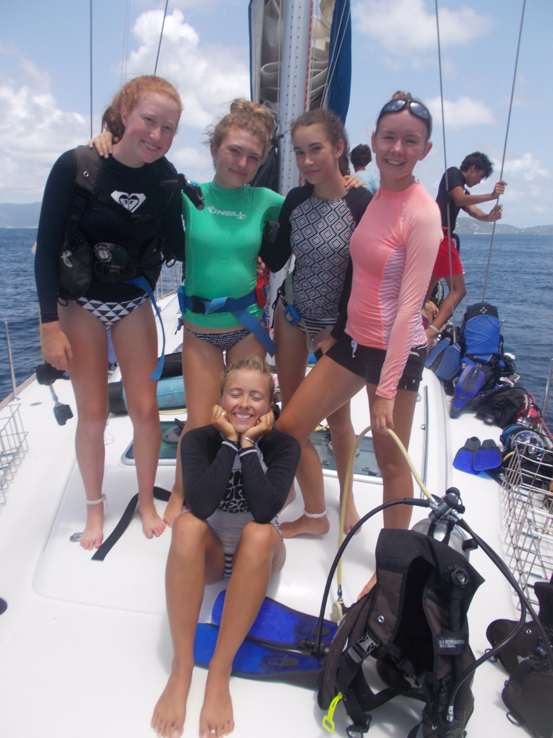 Today, perhaps more than any day, we Bellas reached breathtaking heights and some challenging yet moving lows as well, both literally, but also figuratively. The day began bittersweet with a colorful sunrise and some delicious oatmeal, but also unfortunately with the unexpected early departure of one of our shipmates, the lovely Ella. Some warm hugs, farewells, and the discovery that our boat had been renamed la Brola Vita (the result of what may or may not be a little prank war we’ve got going on). Later we motored off to Salt Island, home of our final dive site. Upon arriving at our destination all our sailors took their IYT crew and advanced sailing exams. Many of us found the tests to be more on the difficult side but we all managed to power through them. Following a quick PB&J sandwich break the Bellas geared up for our final dive exploring the RMS Rhone. There wasn’t as much exciting sea life to see on what was actually one of our deepest dives, but diving through a sunken ship was actually one of the coolest and most surreal experiences we’ve had yet! There’s really nothing quite like swimming and breathing at the bottom of the ocean as newly certified divers. Literally, we had reached one of our trips lowest lows, and although it was no easy time getting there, it was amazing to see such a rare and beautiful place. What I found so amazing about today though, is that only a few hours after we were 55ft below the surface, more than half of our boat was looking down on our home for the past weeks up at the top of a small mountain on Salt Island. The view was purely breathtaking, and the difficult time we had climbing the mountain made it all the more worthwhile. Being up on that mountain was definitely a high point of this trip and a wonderful way to begin the close of a day filled with highs, lows, and an amazing time in between. date: Aug 12, 2017