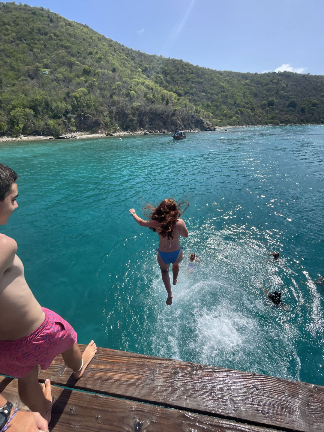 Hi everyone, it’s Amelia again! Today might just have been the best day yet. It started off great. The staff let us sleep in until 8, which meant everyone was in a good mood. We then had a delicious coffee cake breakfast, and then we did a quick clean up before a relaxing sail over to Norman Island. We swam around for a while and saw two sea turtles!!! We got so close to them that we could’ve touched them—definitely one of the highlights of the trip. After swimming around for a while and taking so many videos on Hanna’s Go Pro, we got ready to snorkel. We snorkeled by these really pretty caves. We saw so many different types of fish that I’d never seen before. We went over to Willy T’s for lunch with Friend Ship. It’s a really cool boat restaurant. We ate our delicious food on the top deck and then jumped off the back of the boat into the ocean, which was so much fun. We all did cannonballs which was extremely painful, and had a blast watching people backflips. On our way out, Aria, Brie, Jack, Rangeley, Hanna, and I all bought merch from the restaurant to commemorate our amazing time. When we got back to Odyssey, Beth returned!!!!