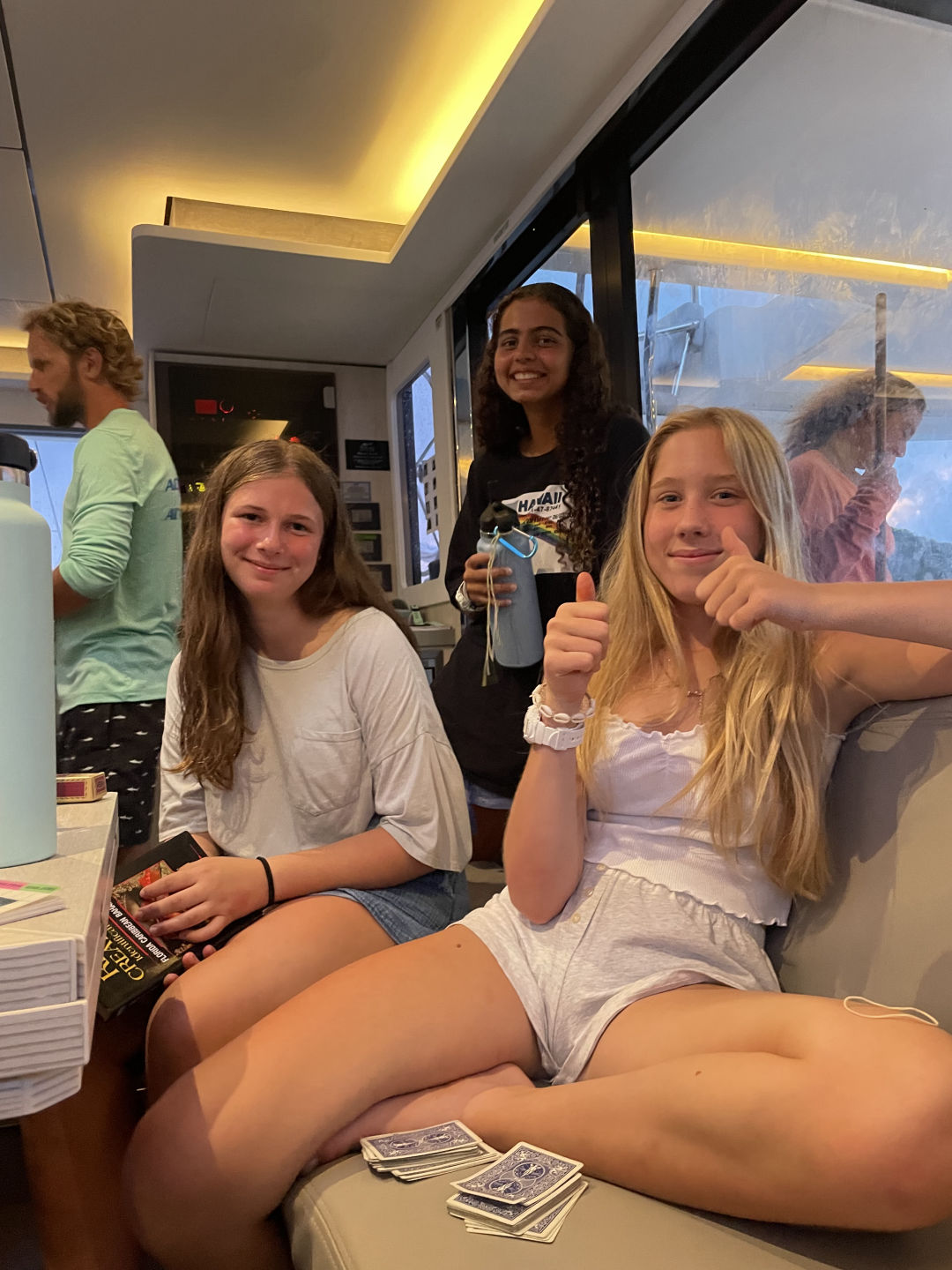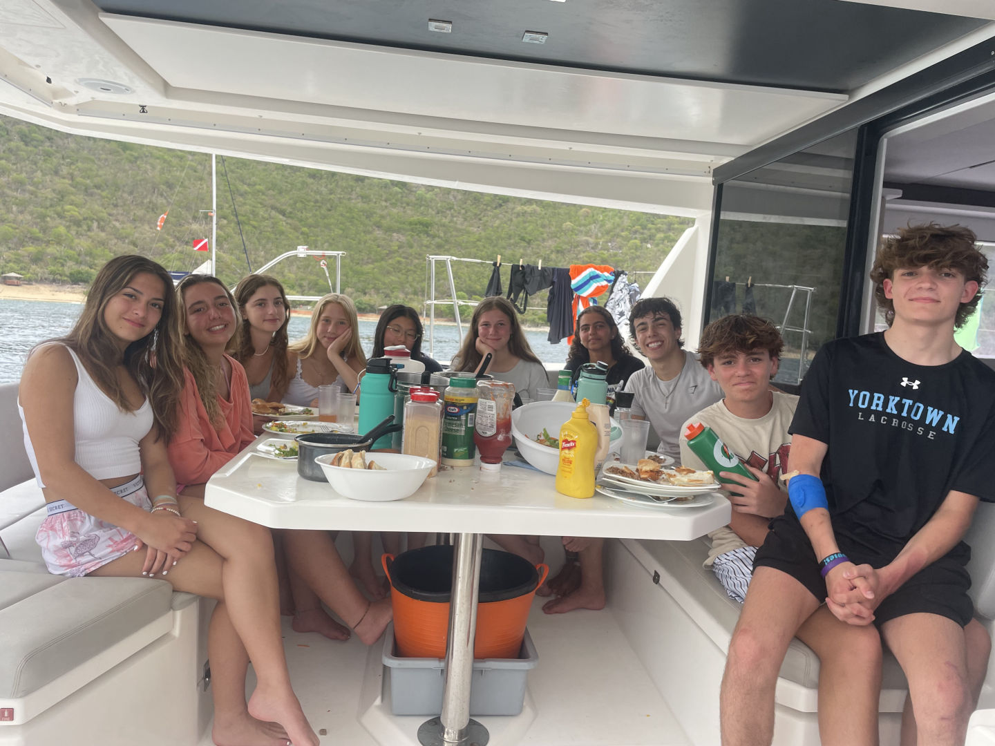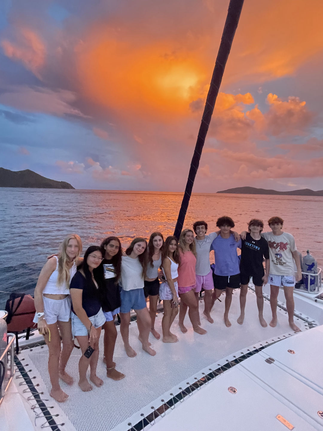 Hi parents. It’s Owen. Most of us woke up around 5:00 and then waited for breakfast to be ready. After we had some cereal, we got our scuba bags organized and then got ready to have a talk with Big Mike. Then we got on the boat and started our sail to Peter Island. While underway, we had lunch which was ham and turkey sandwiches. We finally made it to Peter Island, and we began to set up our scuba tanks to do our first dive. Before our dive, we had to do our swim test, which consisted of 7 laps around the boat and 10 minutes of treading water. After the swim test, we began our first dive. It was a refresher dive, and we had to do a few skills. The skills were; regulator recovery, full mask flood, clear, hover, and an alternate air source use. The groups for were Alivia, Camille, Sasha, Gabe, Ellie, and Rina. In my group, I had Beckett, Eric, Hugh, Sophia, and Ana. Once we finished the dive, we took our showers in the ocean, and Gabe whipped us up some sloppy joes. We are about to head over to Event Horizon to do a Scuba review chat.