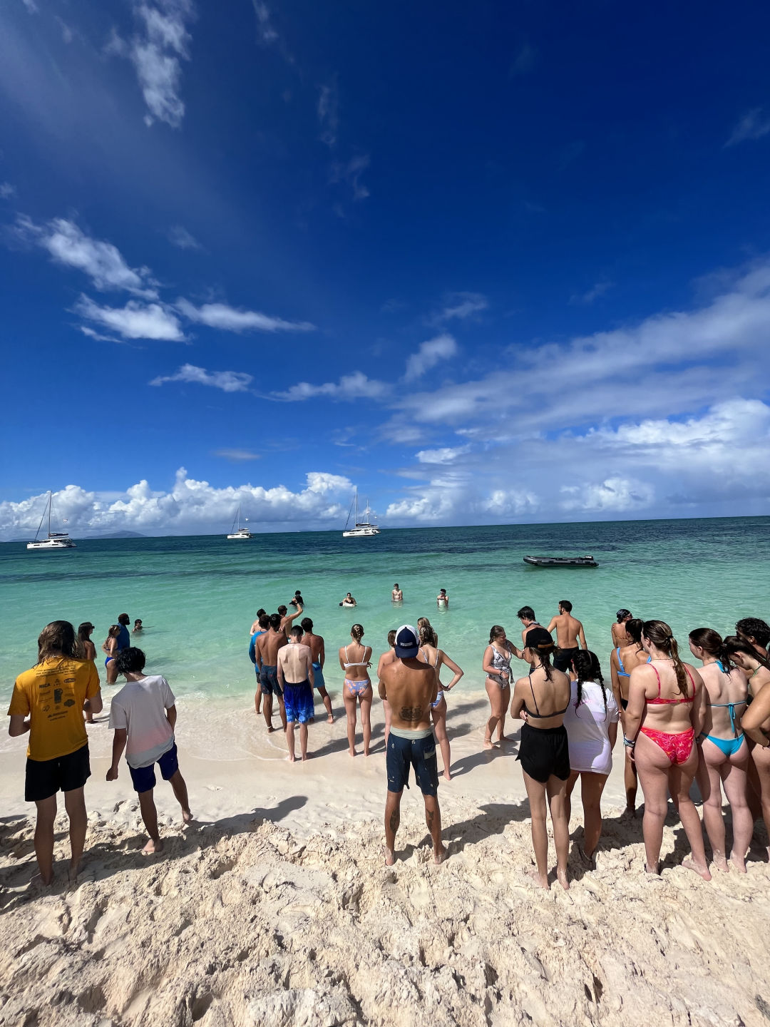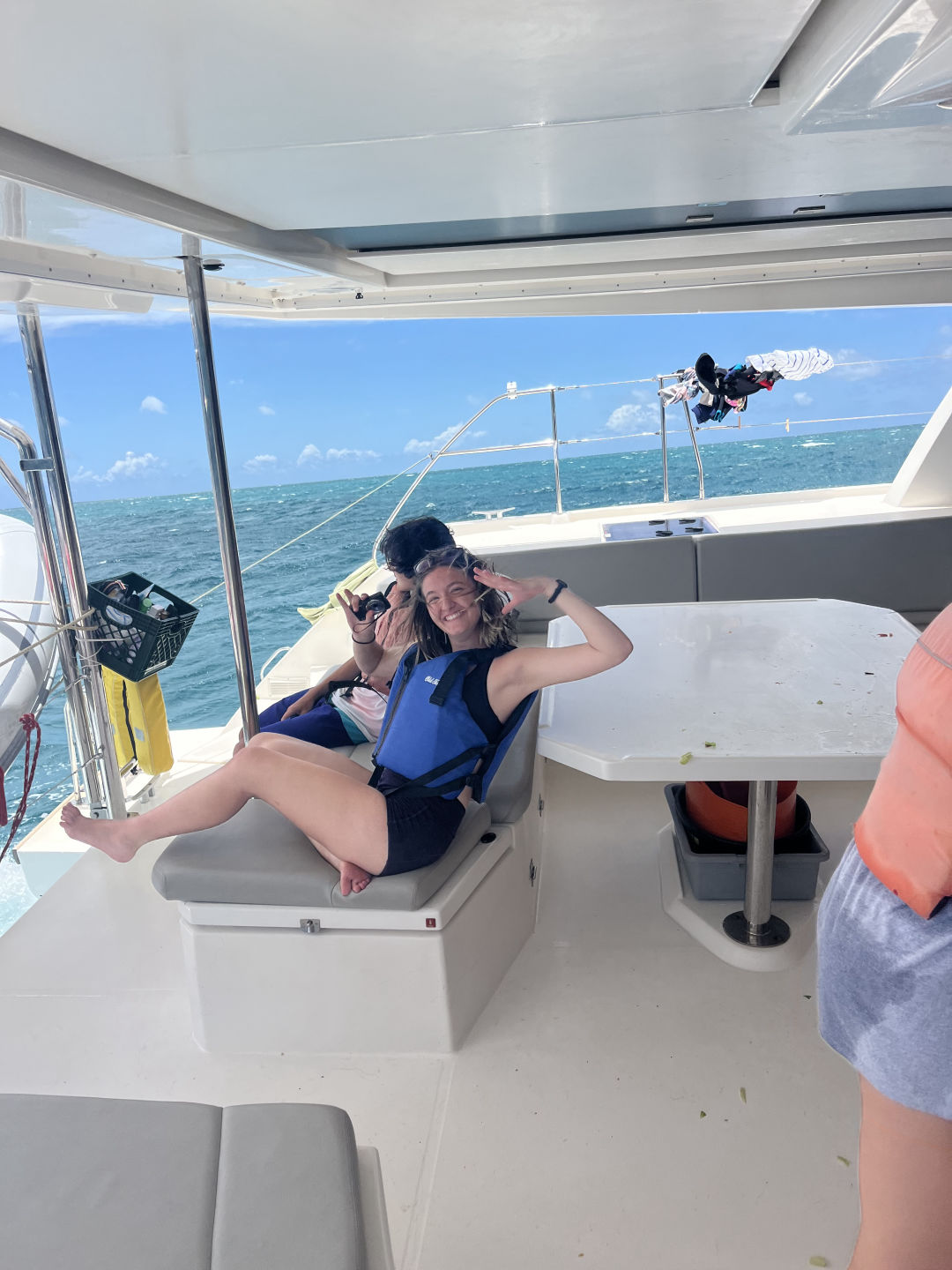 Then we played tug-of-war against each boat, and we lost terribly. The fourth game we played was just called Milk. Someone from each boat would try and chug a carton of milk through a snorkel. They could switch out with other people if it were too much milk, but Nolan ended up drinking just about all the milk and only left a few sips for Sadie to finish off. It was close, but apparently, we also lost. I get the feeling the staff running the games was siding with their boat—a lot. The last game we played didn’t really have a name but it was something like everyone digs a hole under a paddle, one person runs under it, spins around a fender five times, and runs into the water to grab a mouthful of seawater and spit it into a Pringles bottle to fill it up… the game. It was a little chaotic, as you can imagine, and really we won because we got it filled up first, but the other boats said we were cheating cause we used water in our hair to help fill up the bottle taken, which they said was cheating but our boat didn’t agree. In our minds, we won. After the games, we headed back to the boat and had lunch. After we sailed out to Cooper Island, everyone, including me, slept on the way there, even though the waves were terrible. Some people helped sail the boat, and some people worked on getting their shipwreck specialties. The staff saw dolphins while we were asleep. And they’re showing everyone the videos while I type this. We had tacos for dinner. They were really good. Oh, and Cici made our cake. We’re gonna watch a movie tonight before we go to bed. Hopefully, it isn’t pitch-perfect two, but we’ll see.