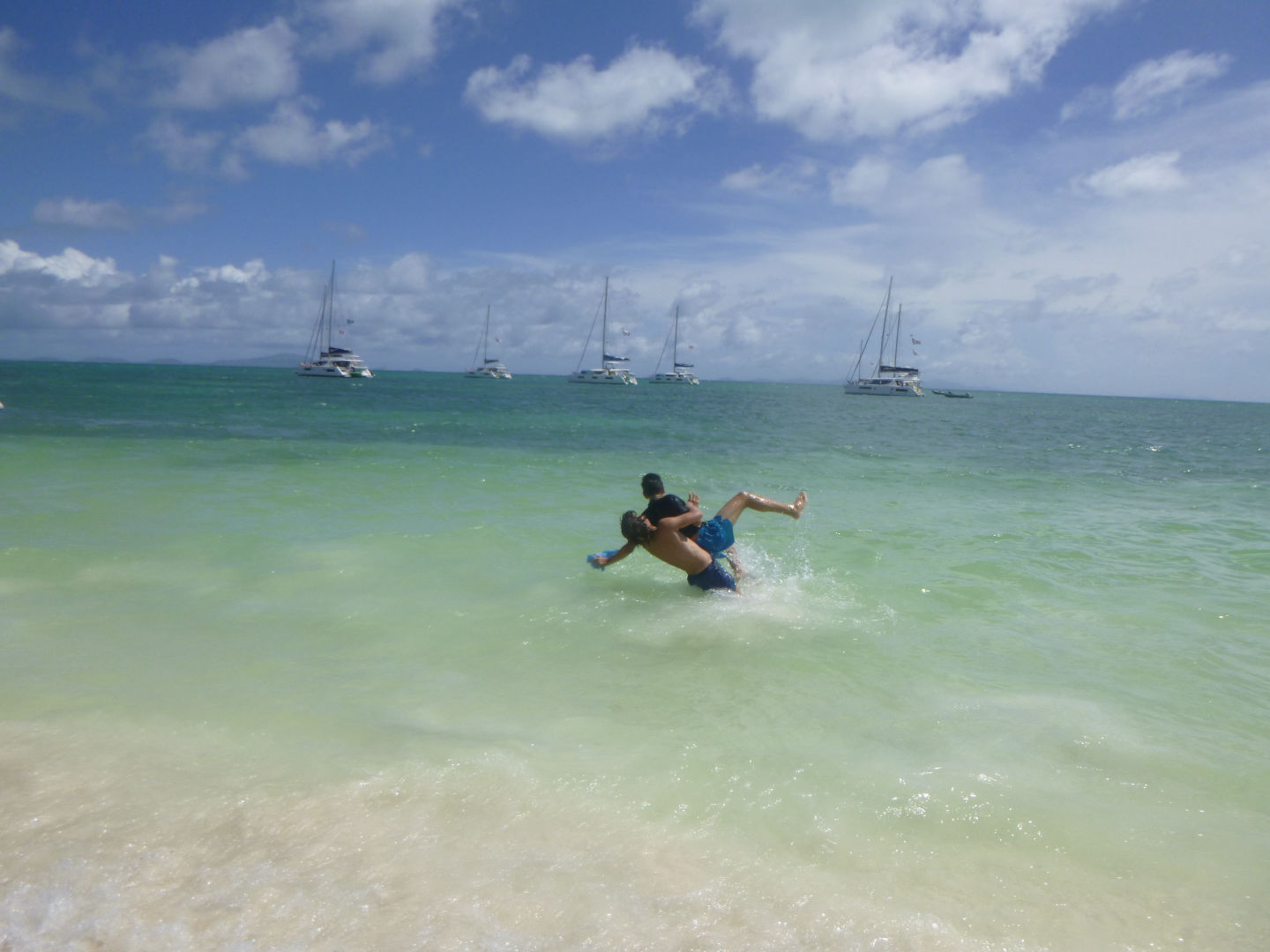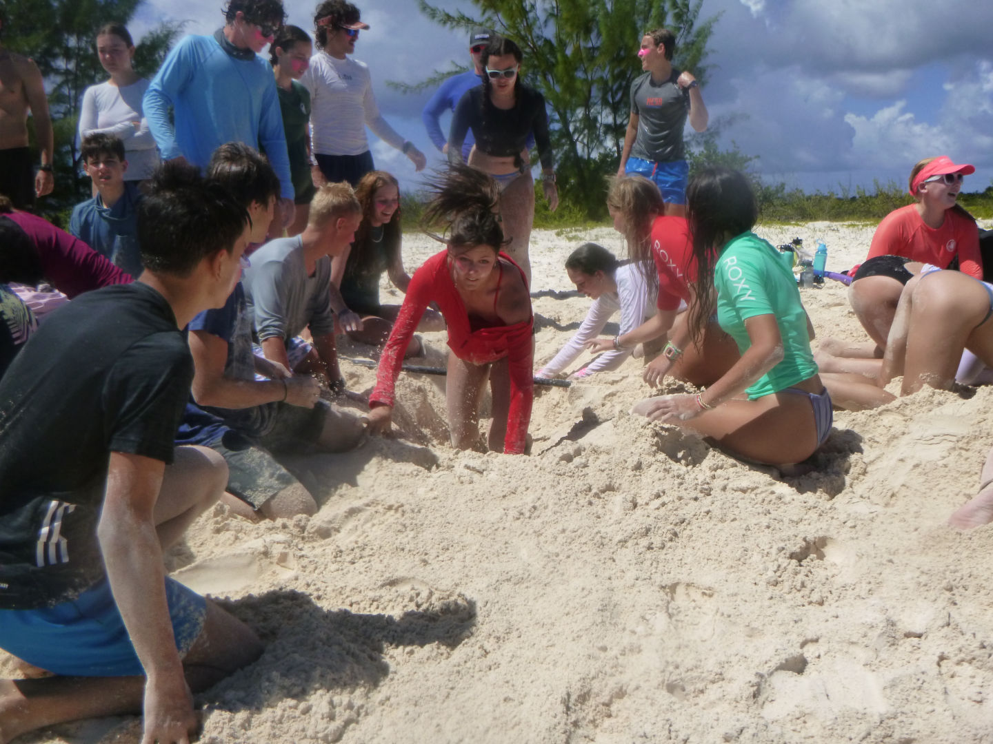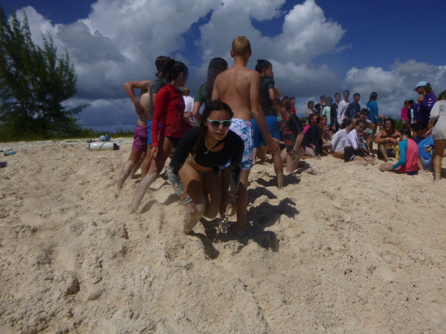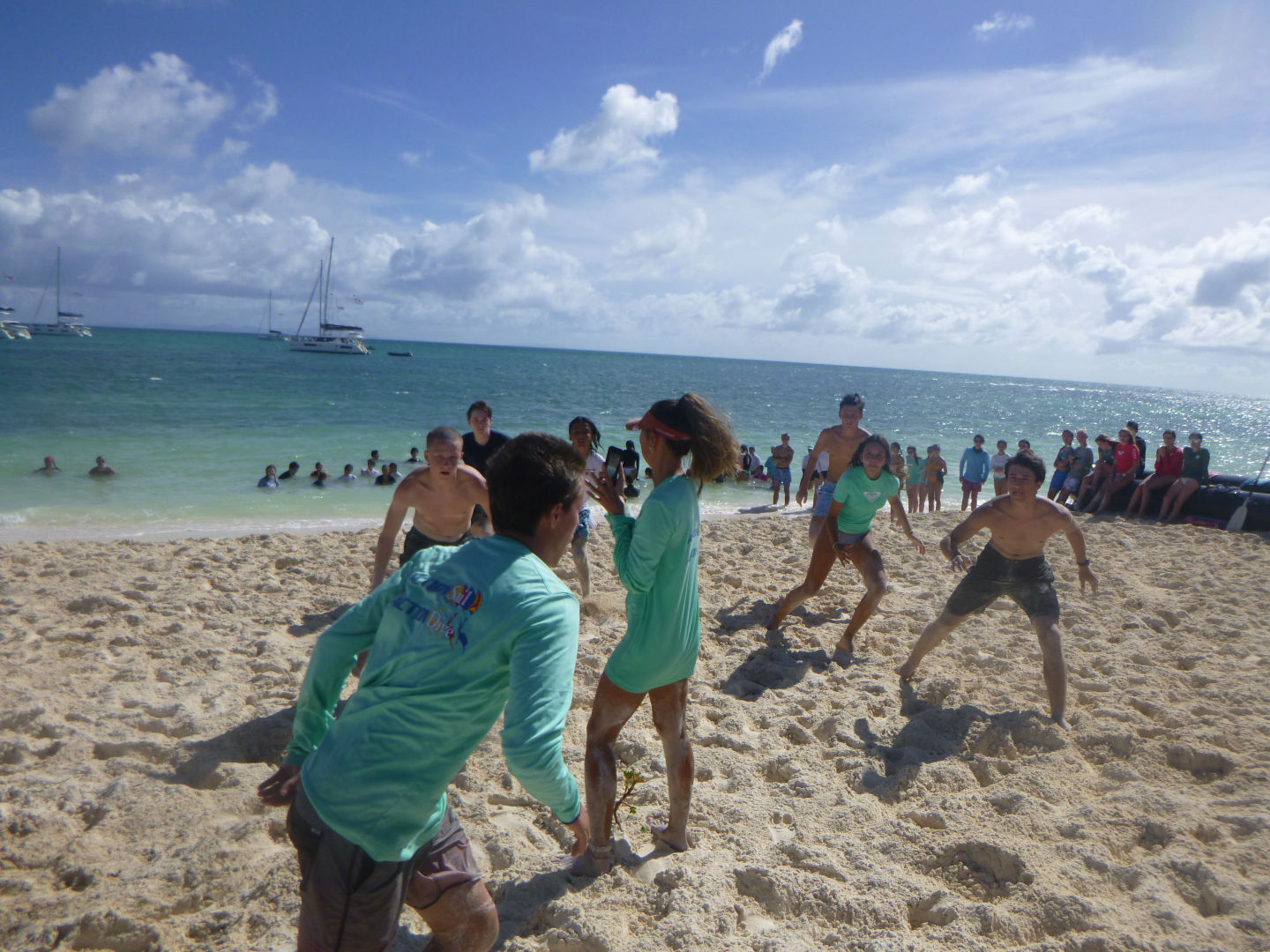 Caroline and Ariana had learned the hand movements almost immediately while many of us had struggled. After a disappointing first game, Max had great success as he won the Fender Rodeo for our team. This game was followed by an extreme relay race that consisted of digging a hole in the sand under a paddle, swimming to a dinghy, climbing up onto it, jumping off, and swimming back to our team. The relay team was Bridget, Alex, Jon, Maddy, and Me(Casey). After that, we played a game called two-hand touch, Will and Erica made it into the finals and almost won! In the end, we came a close second place but still had a great time. After returning back to the boat, we took a shower and sailed to the other side of Anegada Island. Later, we ate risotto with Caesar salad and chicken prepared by our chefs of the day, Alex and Niko.