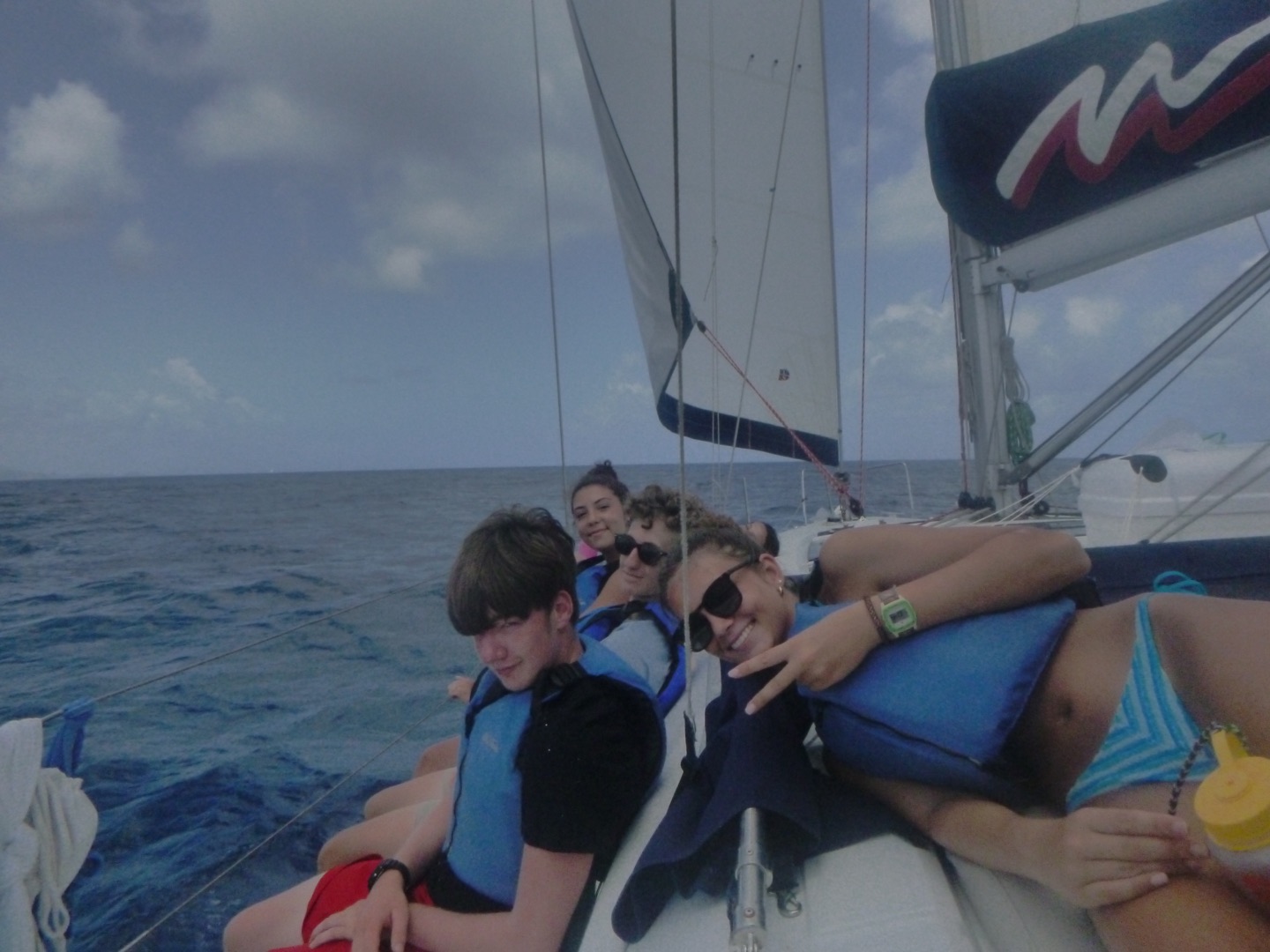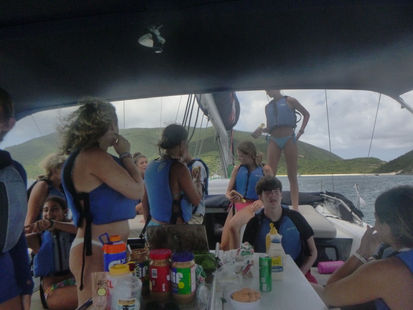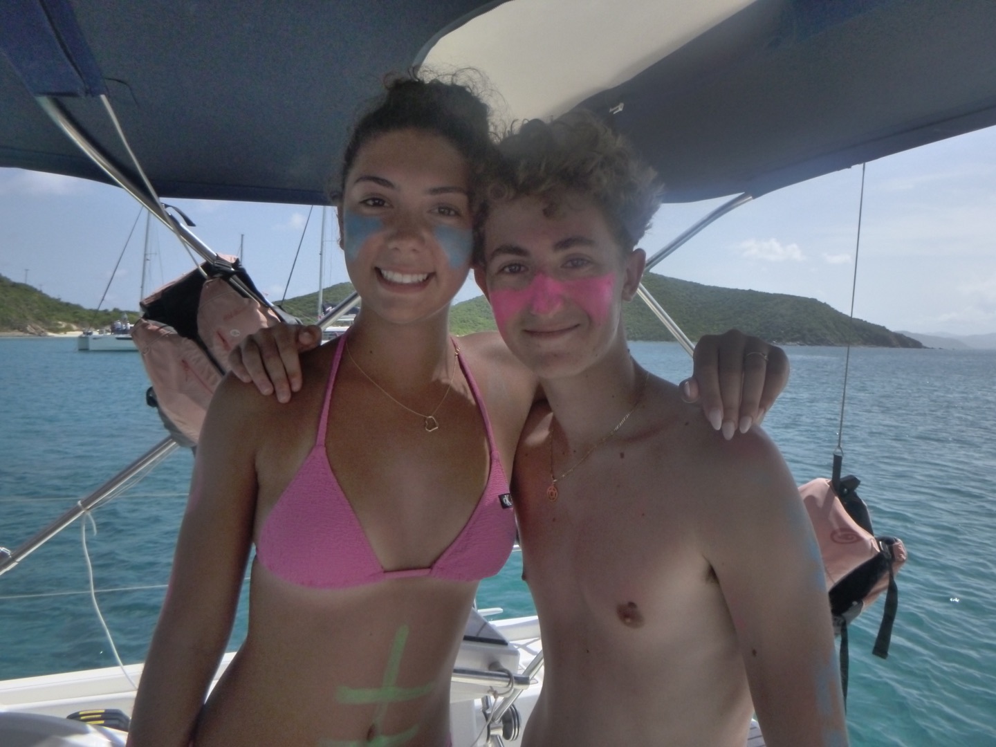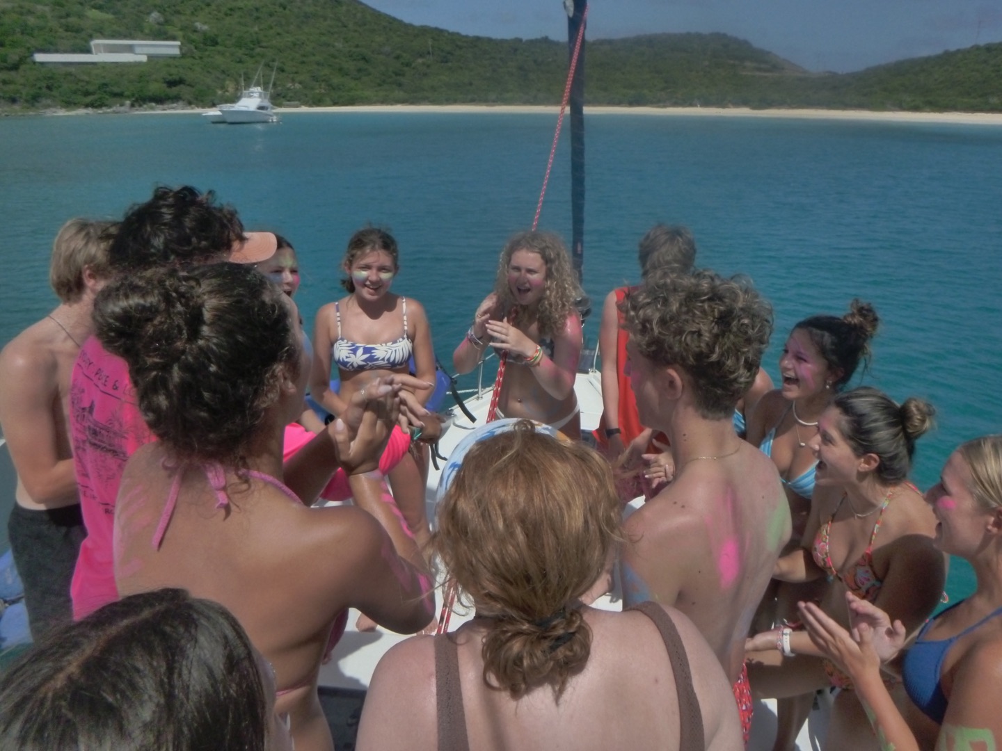 Hey gang, it’s day seven, and it’s a big day because today’s the boating Olympics! This morning, Marinne and Chloe made the best scrambled eggs and blueberry muffins, which were so soooo good. After eating breakfast, we discussed the game plan for the day, which consisted of sailing and the boating Olympics. We got our PFDs on and got to sailing, where Mimi and a few others got to steer while Maddie, more members of the squad, and I got to help a little around the boat. We did some downwind sailing and got to do some wing on wing, which is when one of our sails is let out on one side while the other is let out on the other side. Once we got to our destination, we rafted with a fellow action quest boat called Odyssey and started preparing for the boating Olympics. We got our hands on the other boat and used colorful zinc sunscreen to decorate our faces. After that, we were given a fire pep talk, and Natalie got us HYPED. We sang Hoist the Colors from Pirates of the Caribbean as we rode the dinghy to shore. We were ready, chanting and singing, prepared to take the W… which did not happen, but I digress.