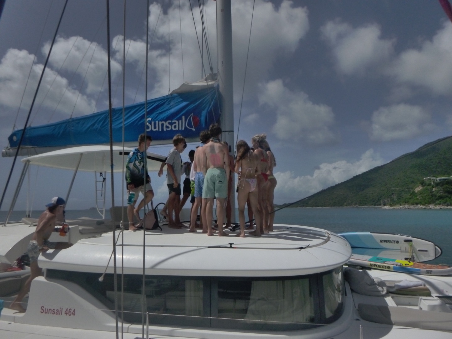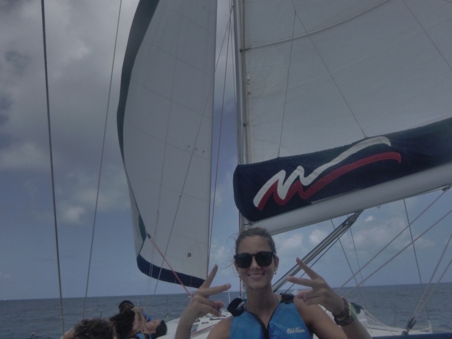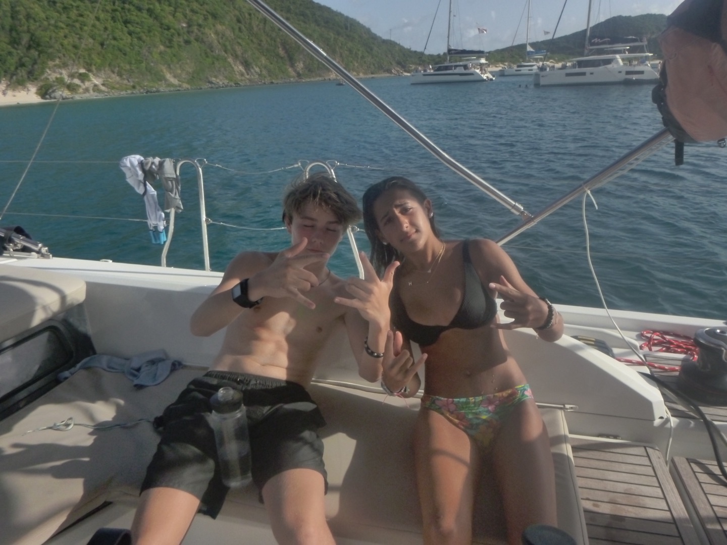 Hey gang, it’s day seven, and it’s a big day because today’s the boating Olympics! This morning, Marinne and Chloe made the best scrambled eggs and blueberry muffins, which were so soooo good. After eating breakfast, we discussed the game plan for the day, which consisted of sailing and the boating Olympics. We got our PFDs on and got to sailing, where Mimi and a few others got to steer while Maddie, more members of the squad, and I got to help a little around the boat. We did some downwind sailing and got to do some wing on wing, which is when one of our sails is let out on one side while the other is let out on the other side. Once we got to our destination, we rafted with a fellow action quest boat called Odyssey and started preparing for the boating Olympics. We got our hands on the other boat and used colorful zinc sunscreen to decorate our faces. After that, we were given a fire pep talk, and Natalie got us HYPED. We sang Hoist the Colors from Pirates of the Caribbean as we rode the dinghy to shore. We were ready, chanting and singing, prepared to take the W… which did not happen, but I digress.