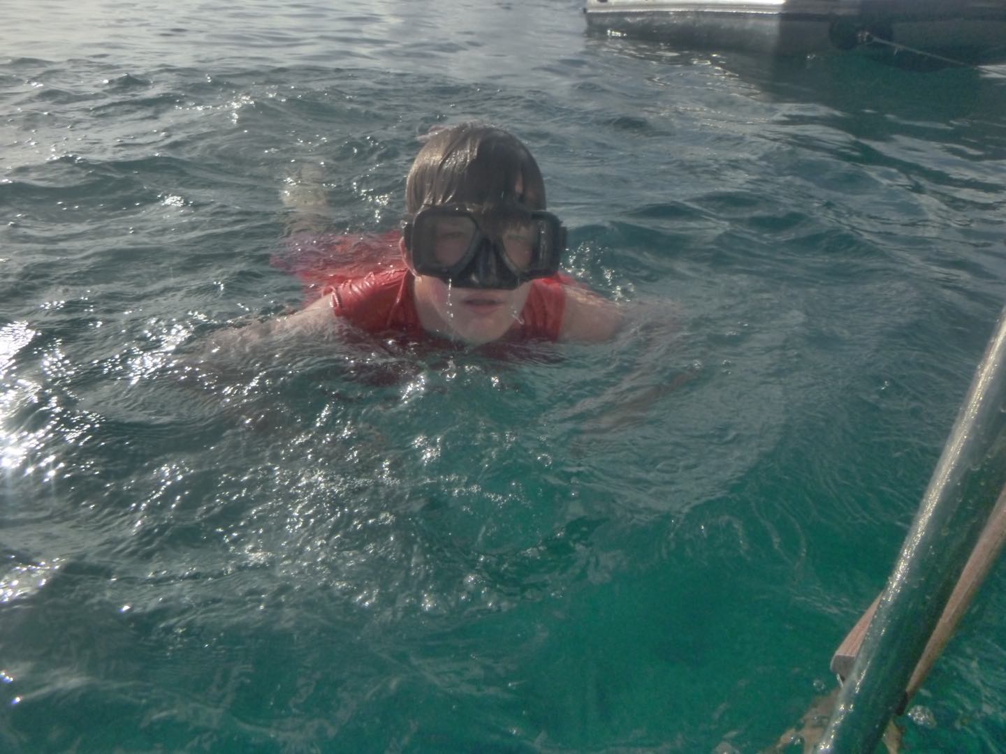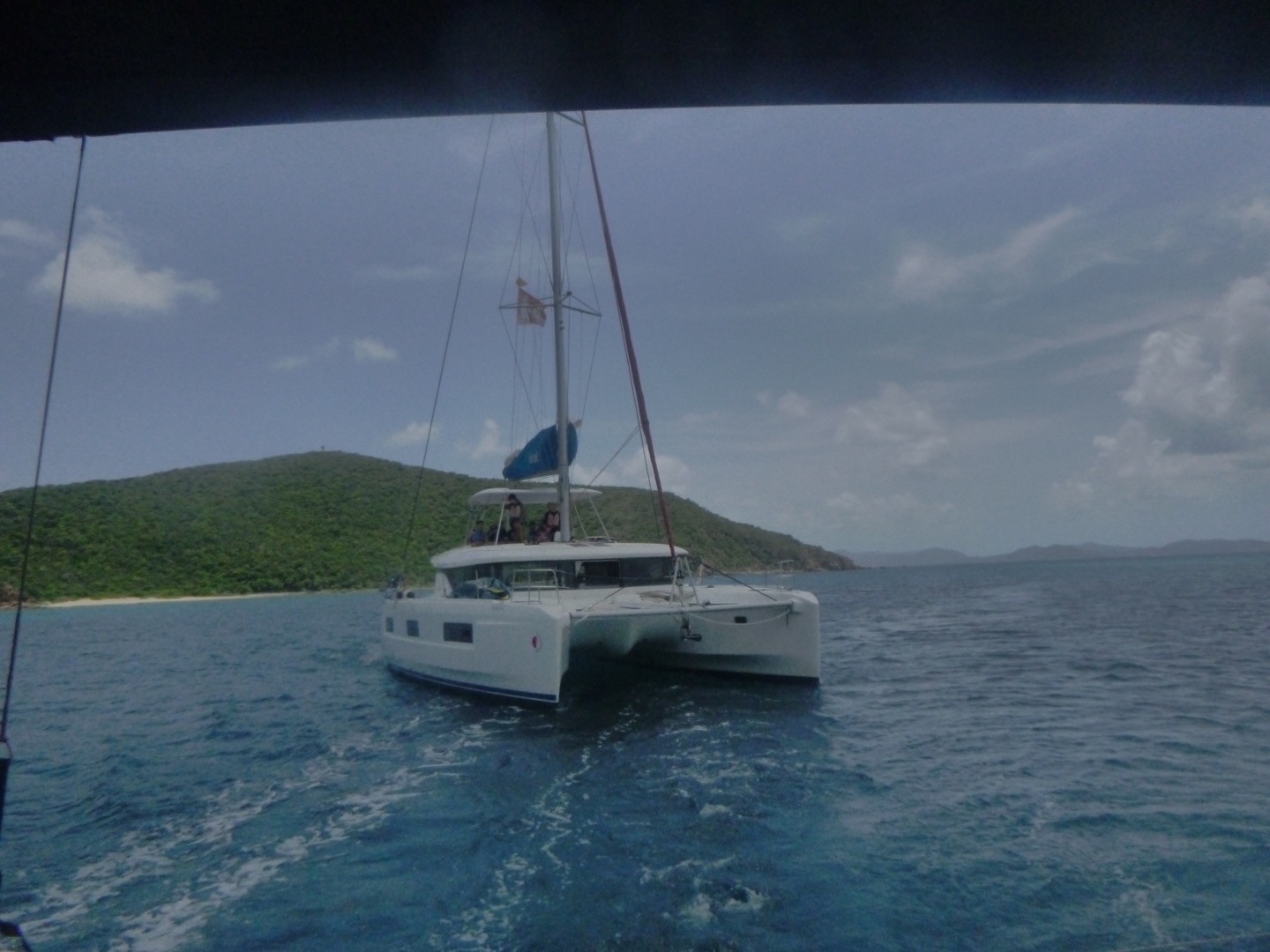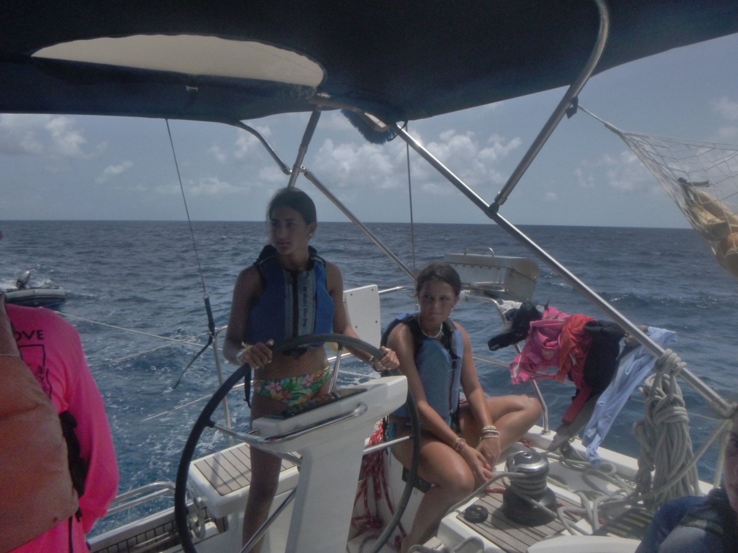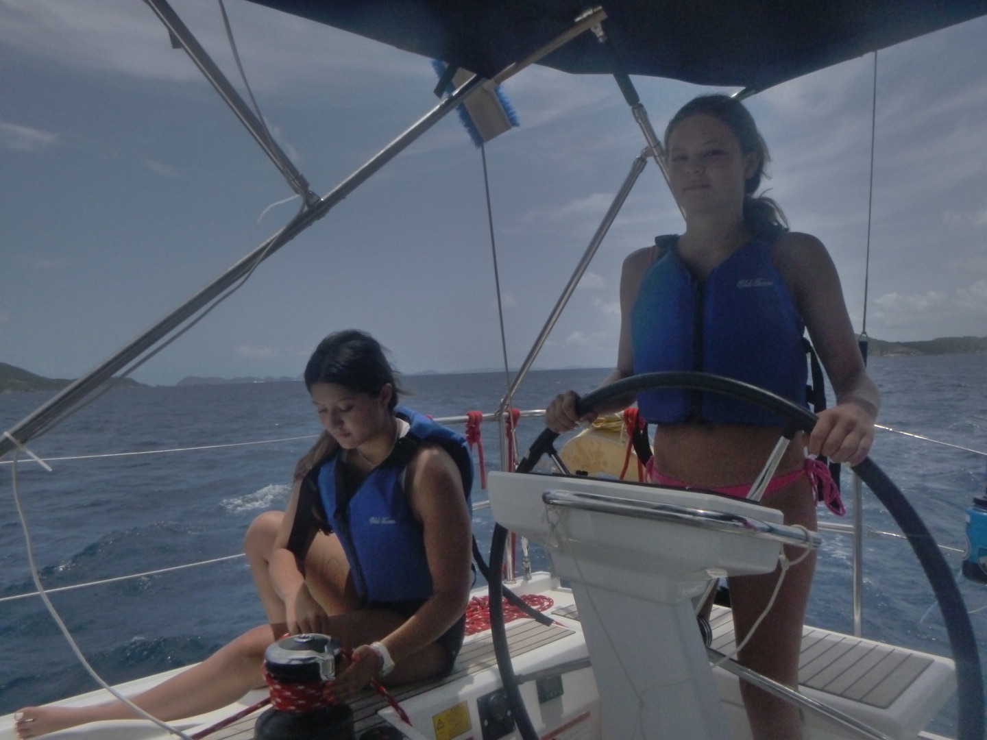 Hey gang, it’s day seven, and it’s a big day because today’s the boating Olympics! This morning, Marinne and Chloe made the best scrambled eggs and blueberry muffins, which were so soooo good. After eating breakfast, we discussed the game plan for the day, which consisted of sailing and the boating Olympics. We got our PFDs on and got to sailing, where Mimi and a few others got to steer while Maddie, more members of the squad, and I got to help a little around the boat. We did some downwind sailing and got to do some wing on wing, which is when one of our sails is let out on one side while the other is let out on the other side. Once we got to our destination, we rafted with a fellow action quest boat called Odyssey and started preparing for the boating Olympics. We got our hands on the other boat and used colorful zinc sunscreen to decorate our faces. After that, we were given a fire pep talk, and Natalie got us HYPED. We sang Hoist the Colors from Pirates of the Caribbean as we rode the dinghy to shore. We were ready, chanting and singing, prepared to take the W… which did not happen, but I digress.
