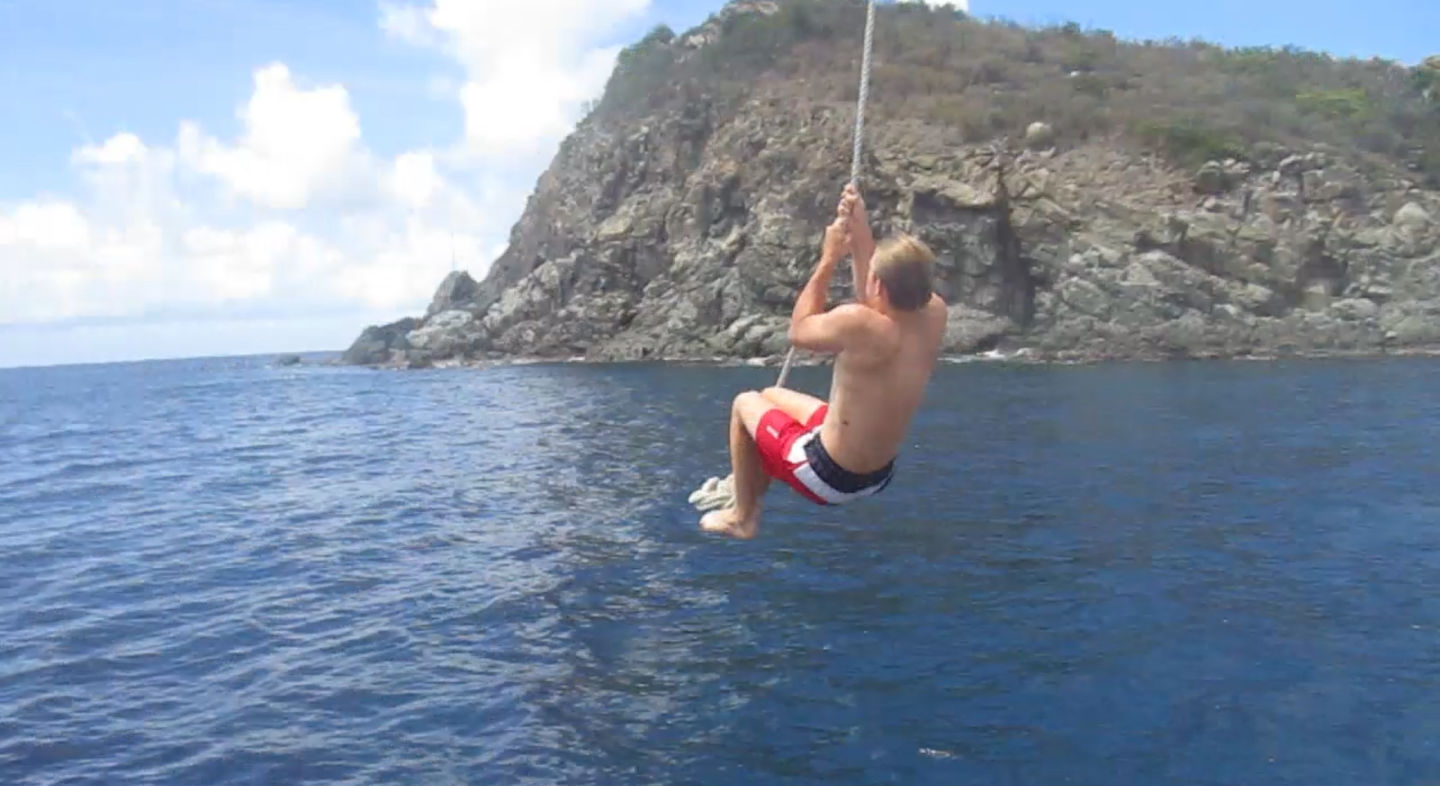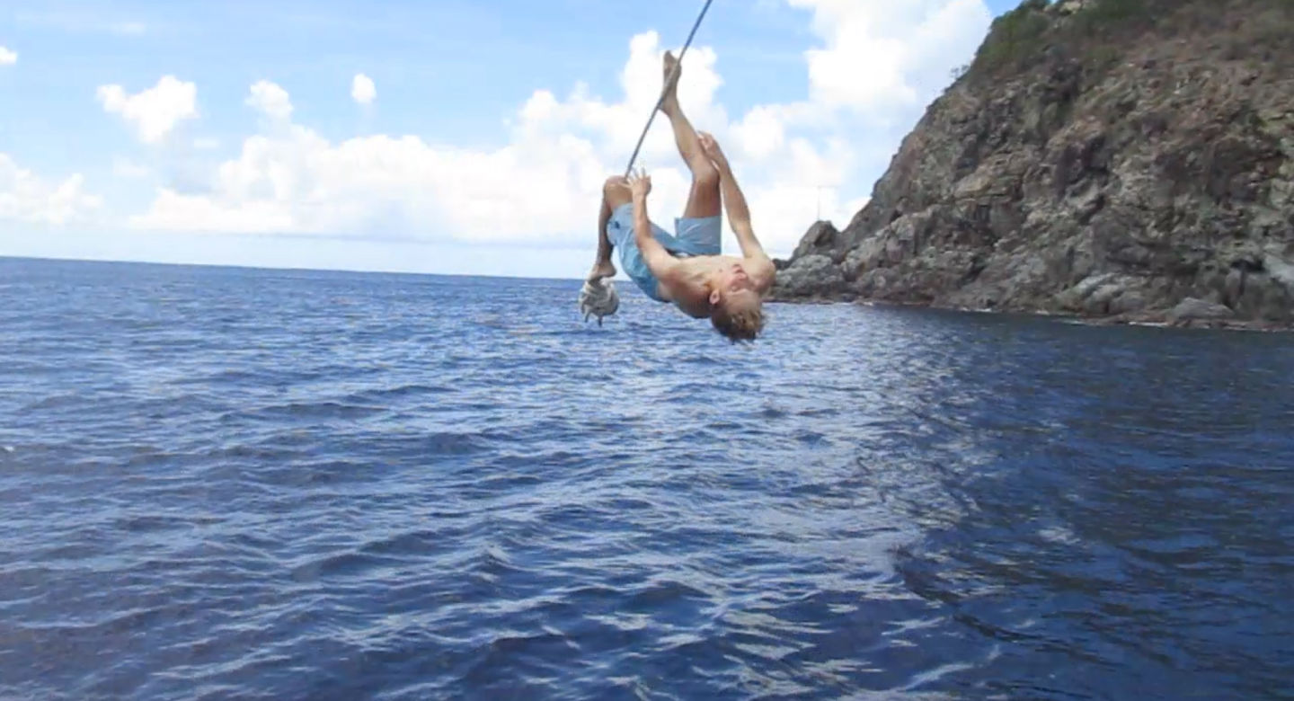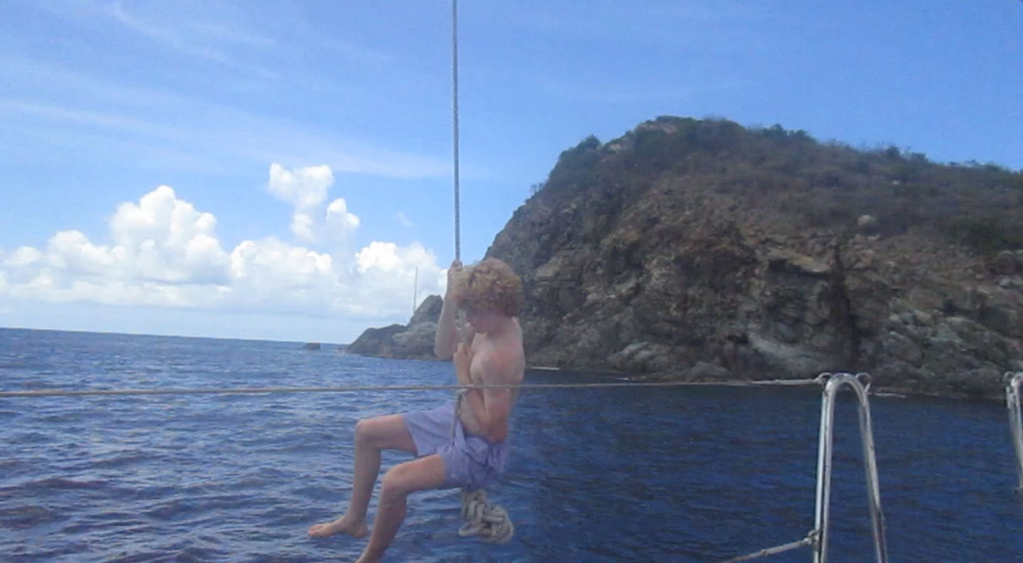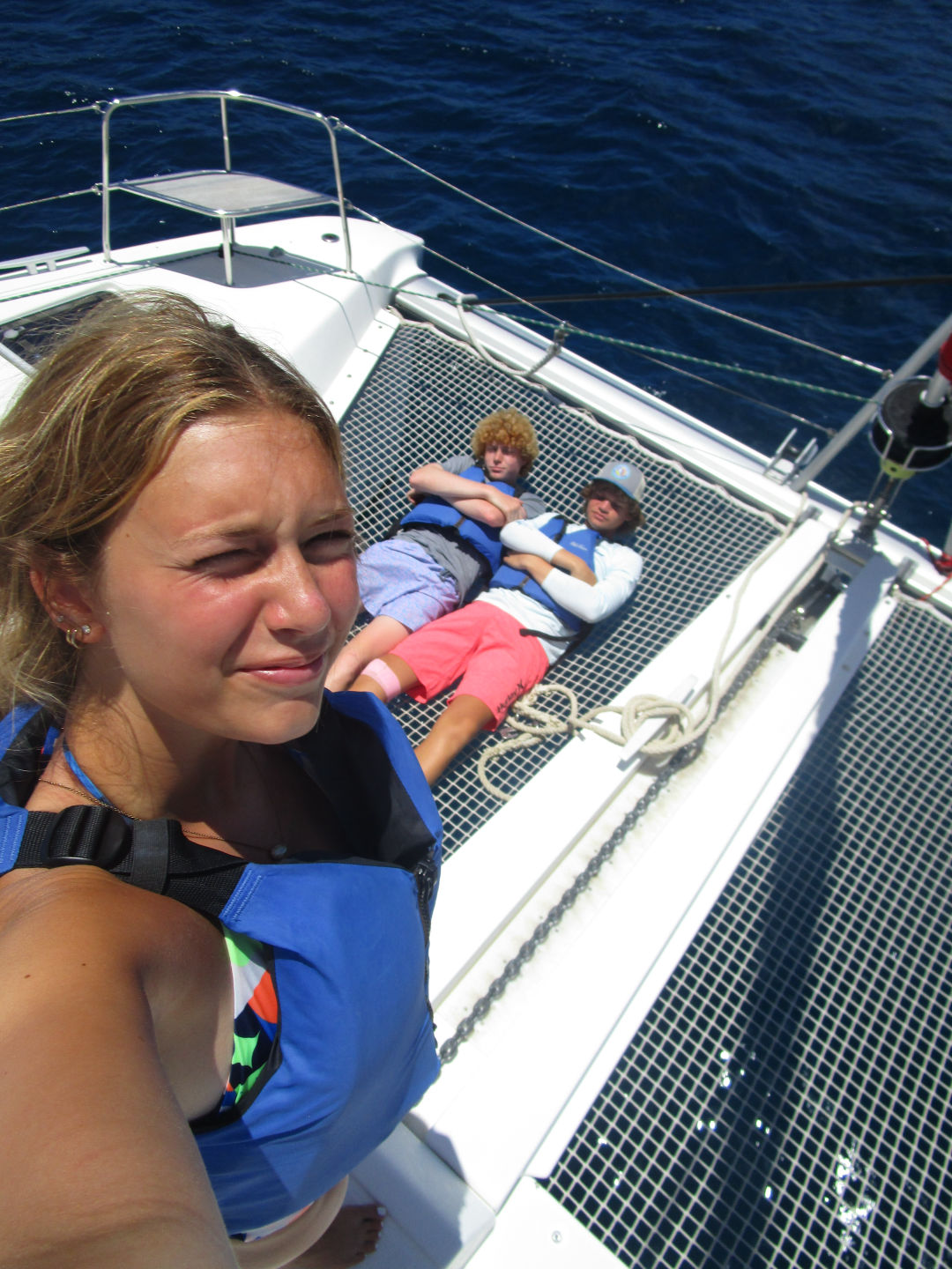 We woke up this morning to cereal. I had frosted Mini-Wheats. After Matt, Stella, and Claire finished the dishy pit, we prepared the boat for the morning sail. Thomas was pressing the anchor button, and Evan was pointing at the anchor so that Matt could drive the boat out of the anchorage. Then we spent the morning sailing around, learning about the sails, what they do, and what line does what. While we were sailing, everyone got a turn to drive the boat and lift the sails. After we all got a turn to sail and do maneuvers like tacking and jibing, we picked up a mooring ball. Drew and Meredith cooked mac and cheese for lunch and didn’t mess up the Mac and cheese like Drew, and I did a few days ago. After lunch, we took the dingy over to Bliss Point, which is the staff boat in the fleet. The staff boat had set up a boom swing for us to swing on into the water. We all started to just swing and have a good time until Jake (one of the staff)suggested that we try and do a back flip off of the rope swing. Everyone was scared to do a flip at first, but after I landed a back flip, most of everyone did a flip off of the rope swing. Evan, Kate, and Lyla attend to do their first off the dinghy. We all are still trying to teach Kate and Lyla how to backflip, but Evan was able to do a backflip off the dinghy. After the boom swing, we went back to our boat to finish cleaning the salon. Then, we sailed to marina keys while most people on board decided to nap. While Allie, Aidan, and Beth were letting the anchor down, we were all showering off the back of the boat. Lastly, we had tortellini for dinner with Mike(the owner of ActionQuest). Now everyone is dancing on the back of the boat to Bohemian Rapsody. Next, we are going to do life works as our night activity and go to bed!