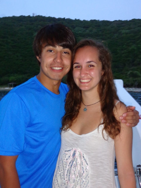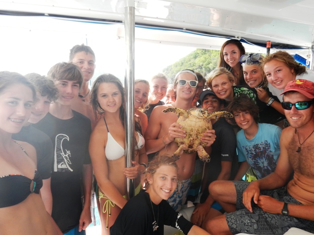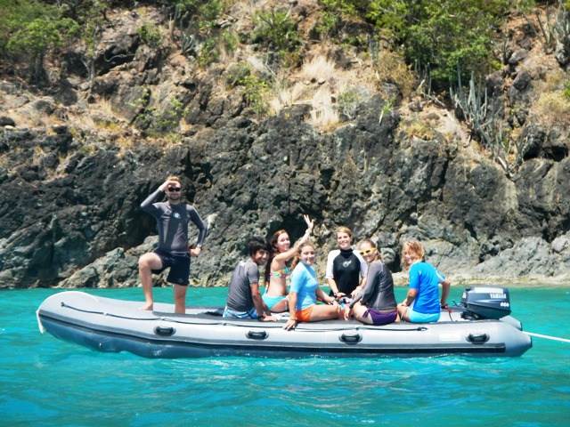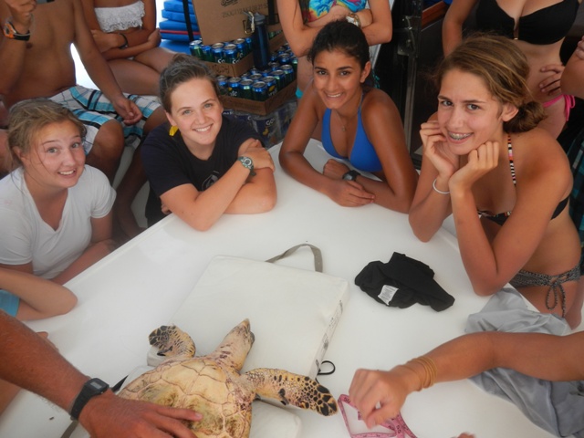 Today we awoke to the sounds of “Oh Canada!” in honor of Canada Day and our Canadian staff member, Cayley. After we finished as much of the song as we could remember, the chefs started on breakfast: scrambled eggs and poppyseed muffins with lemon glaze. After breakfast, we cleaned up and the Dolphins on our boat prepared for a dive to collect data for their research projects. While the Dolphins did this, the Neptunes on our boat went wakeboarding and waterskiing. After the dive, the chefs prepared lunch, tortilla soup with grated cheese and plenty of saltine crackers. After cleaning up from lunch, we prepared for turtle tagging. As the name might hint, turtle tagging requires a great deal of effort and complex dinghy driving skills. This issue is not necessarily the tagging but the catching of the turtle in the first place. To catch the turtle, three dinghies dragged behind them, with four shipmates in each. Each shipmate was armed with a snorkel, mask, and fins, and scanned the water for turtles. We followed this routine for two hours with no luck. Finally, we returned to our boats disappointed. Luckily, as we prepared to sail out, we heard yells from the bow, “A turtle! A turtle!” Several splashes later, Charter rose to the surface holding a small hawksbill turtle. We brought it to the stern of the boat and sat it on the table. We collected the tagging information and examined its characteristics. It was an incredible feeling after so much work to see the turtle sitting in front of us. Overall it was a VERY good day.