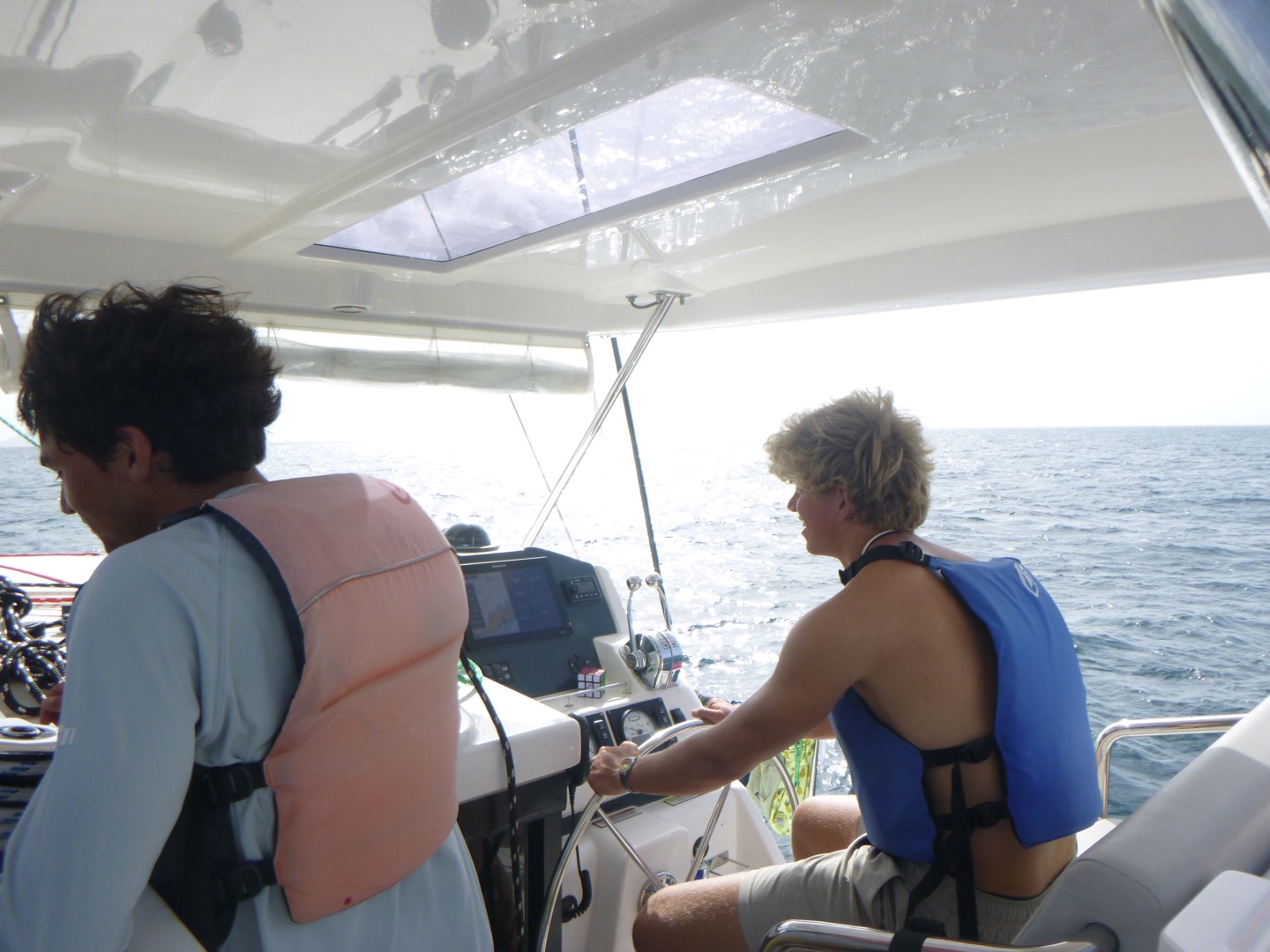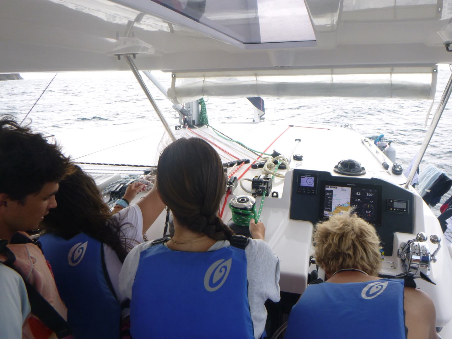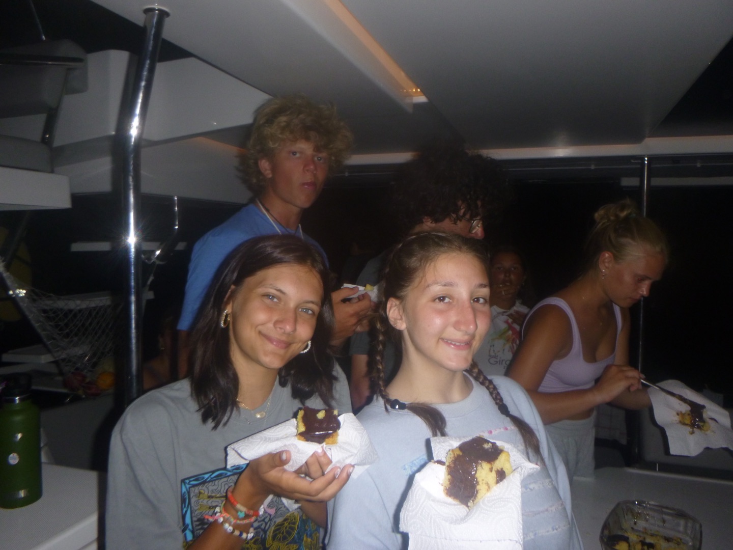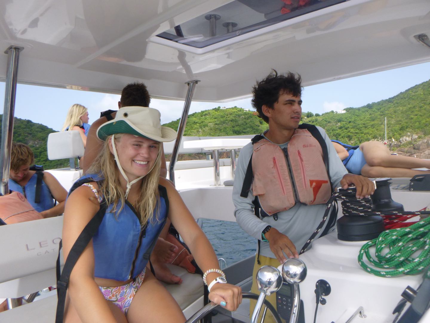 Bonjour everyone! Today was day 14 here on Iles et Ailes, meaning one week until we depart :(((. We woke up this morning at 7:15 to move the boat back to Muskmelon for CHAOSSSS DAY! For once, we didn’t dive the first rotation, so we headed over the Shamwari and Odyssey and were rafted together. Chaos day just means there is no set schedule, and the dive boat (us) works all day to get everyone the dives they need in order to become certified!! So we hung out with Odyssey and Shamwari, and after a bit, Julia and Maren decided to bring out the Henna. In the meantime, Celeste, B, and I, as well as our friends Molly and Freddie from Odysea, went to do some water sports. I kneeboarded, which is my favorite, and Celeste just came for the ride. B, however, was absolutely shredded on the Wakeboard. Sariah and Aidan went out on the zest together, while Houston took one on his own, and Noah and Nadiya took another. Ella and Sadie enjoyed a peaceful morning reading and sitting on the cover of the Bimini. After a long, long time on the raft with no food, we needed a moral boost. SO Will brought us over the the monohull in the fleet and we got to do boom swings which was so fun, plus Sariah and Houston got to see their siblings who were rafted with the monohull. Most everyone got a chance to go off before we were finally picked up and brought back to Frenchie for lunch (my personal AQ favorite: Quesadillas). After a speedy lunch, we headed to the bow to set up our kits and get ready for our final training dive. The open waters were the first in. Sadie, Sariah, Ella, and Nadiya saw a lobster and did some tricks at the bottom.