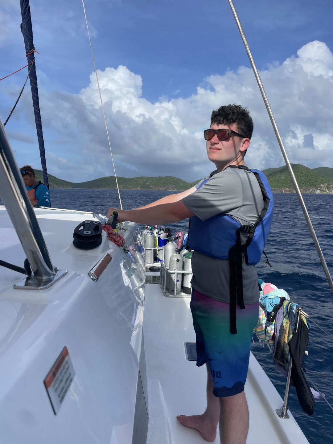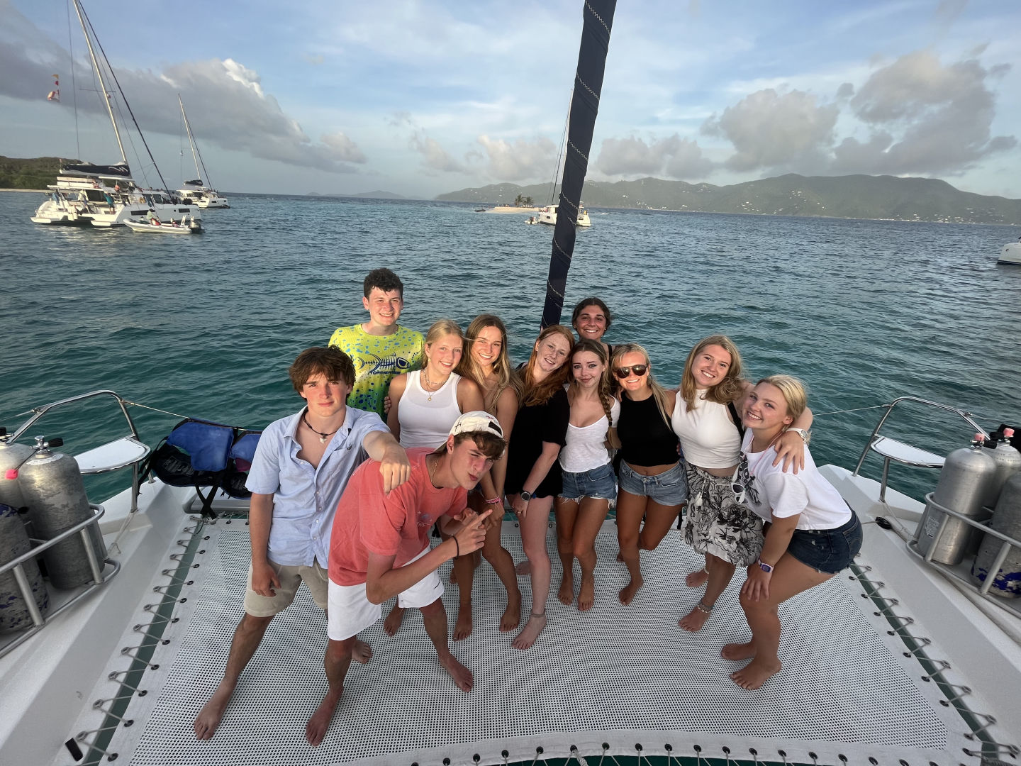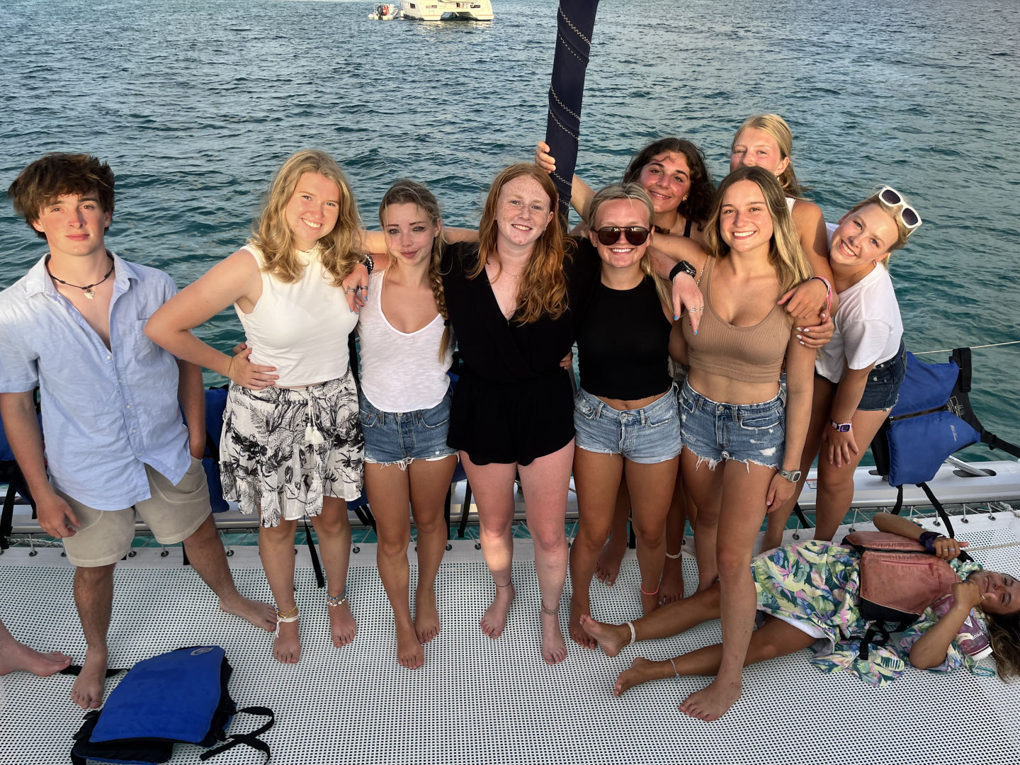 We started the day with a nice wake-up of The Backstreet Boys blasting throughout the boat. After a quick morning routine, the DMs (Georgia, Ned, and I) went on a fun little tank run and came back to eat some oatmeal and cereal with the rest of the boat. Everyone left for the day to do some water sports, paddle boarding, snorkeling, and relaxing. Lana, Stella, and Aubrey got caught in a massive rainstorm on a dinghy that was supposedly very cool. Meanwhile, on the raft, Nómada was chilling, and some bees came in for some shelter. One found its home in Avery’s arm, but she got it out, and all was good. All the way over on another boat, Harry jumped in the water for some diving and caught up completely on his dives. According to the instructors, he did an absolutely stellar job and was killing it like a fish underwater. During this, the DMs got kitted up and hopped in the water for a DSD dive. This consisted of three staff members pretending to be bad divers that have never been diving before while Georgia, Ned, and I had to make sure they didn’t kill themselves or us. They took off their kits, their masks, their fins, took out their regulators, etc. Definitely, the most stressful dive I have ever done, but really funny at the same time. We hopped out of the water and into another tank run before splashing back into the water. We demoed several skills underwater and finished all of the demos we needed to qualify as DMs. We decided to stay underwater for an additional ten minutes, and we all took off our fins and lay down on the sand, taking the time to relax while looking at all of the gorgeous reef life around us. Since we had little left to do to certify as divemasters, we got to hop on a dinghy and do water sports. We made a quick stop to pick up Stella, Aubrey, and Kate, as well as a few friends from the boat Friendship. Ned started waterskiing and failed miserably before switching to wakeboarding. He then waterboarded himself a few times before he finally was close to standing up and face-planted in the water. It was then my turn, and of course, I was just so amazing at wakeboarding and stood up on my first try until I tried to fix my bathing suit and slammed into the water. I got up the next try and had a great time going in and out of the wakes like a pro. Aubrey tried to pick me up by the lifejacket to get me back on the dinghy and hit my face on the side until, eventually, using her incredible upper body strength, and pulling me up. Then it was Georgia’s turn to wakeboard, and she only waterboarded herself once before she stood up and totally killed it. She was boarding for a hot minute until she tried to go outside the wake and fell on her face with her arms flailing. Super amusing to watch. Ned then tried again, and after a little more waterboarding, he stood up for a solid few seconds! We then went back and picked up the rest of the Nómada shippies and brought them back to the boat for lunch. We had chicken-cheese wraps, quesadillas, Nutella, and peanut butter sandwiches for lunch. After lunch, we relaxed for a half hour before the DMs went on another tank run and brought back some tanks for everyone on Nómada to dive with. After which, Ned spent the next 10 minutes attempting to do a backflip of the dingy. He seems to think it was perfect, but Aubrey and I were very much enjoying watching him try. Everyone split up into their diving groups, and I went with Garrison’s group, which consisted of Kate, Stella, and Aubrey. I led the dive, taking them around the reef and seeing many different types of fish. We saw massive schools of fish (that Kate turned to say hi and wave to), a lionfish, and a massive lobster. Afterward, we took off our fins, deflated our BCDs, and spent the next several minutes jumping around, doing flips, and doing a very slow race. After this dive, the DMs were done with all of the water skills necessary to become a divemaster, the exam being the only thing left to do. More importantly, this dive officially made everyone else open water divers!!! In between rotations, I made them a congratulatory cake with Ned and Georgia and we all happily munched on the wonderful cake in celebration. All of the newly certified open water divers headed up to the power tower, where they started to sail the boat. Kate started at the helm while we raised the sail, and she held us perfectly still in the water for about a half hour while everyone worked together without staff help to raise the sail. Then Aubrey took hold, and we finally started getting underway. All was well until she started showing Lucas how to man the helm and swerved the boat back and forth, making me nauseous in the process. Ned, Georgia, and I took this time to get some studying done until we decided to take naps instead, about 20 minutes in. We (eventually) made it to the bbq. After a chaotic photo shoot on the bow, we dinghied over to the bbq island that is really just a spit of sand in the middle of the ocean. After landing on Sandy Spit (a fitting name for the pile of sand), we all got in line for some wonderful food. We met up with our friends from Friendship, and everyone ate dinner together, Lucas and Maude going off on their own to spend some quality time with friends they had made on other ships. After a nice family dinner together, we all split up and hung out with friends we had made from other boats. I personally met up with some people from the rescue boat that I had made friends with when I was here from years passed. At the end of the night, we all met back up together to talk some more (because we are always so quiet on the boat ;)). Stella brought out her camera to take a bunch of pictures of everyone, and we discussed the night’s events together. A minute later, Issy came running over very excited to show off a grain of bioluminescent sand she found. It was pretty cool, a glowing grain of sand amongst all of the others. We then hopped on a dinghy to head back to the boat, ready