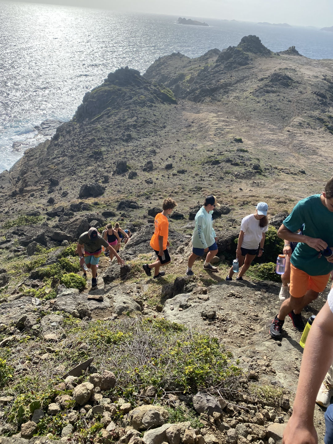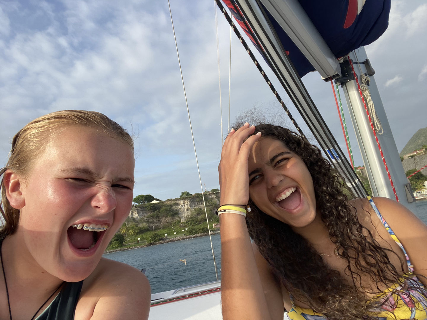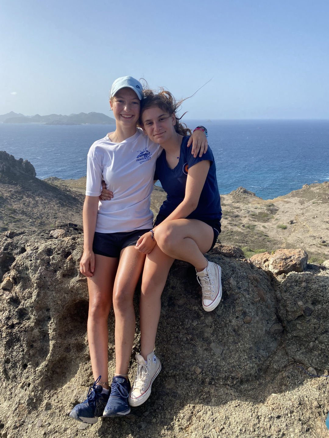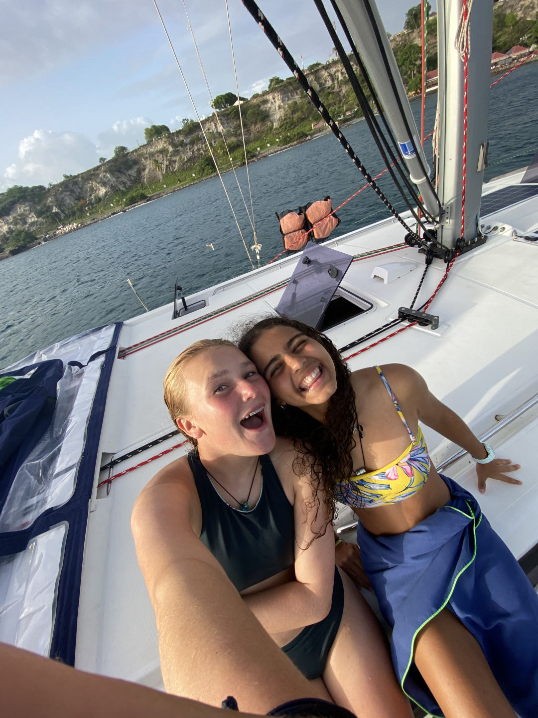 We started the day with a nice hike up Ile Fourchue. After a scramble climb to the top, there was an amazing view of the ocean and surrounding islands. Alex gained the nickname Mountain Goat for his ability to descend the mountain so quickly. Once we got back to the boat, we prepared for our passage to Statia. Underway, we experienced high winds and lots of rain, making the sail very exciting. At one point, Wombat was sailing 10 knots! After arriving at Statia, Nick cleared customs for us while the rest of us jumped into the ocean. Missy and Benzi set up a boom swing which Audrey did a flip-off. Audrey, Sophie, and Ana went snorkeling by the boat and found a very large fish which we first thought was a shark. Our chefs, Alex and Johnathan, cooked a delicious dinner of garden burgers, and Noah made Arnold Palmer. After clean up, we hung out on the bow and went to bed early for a full day tomorrow.