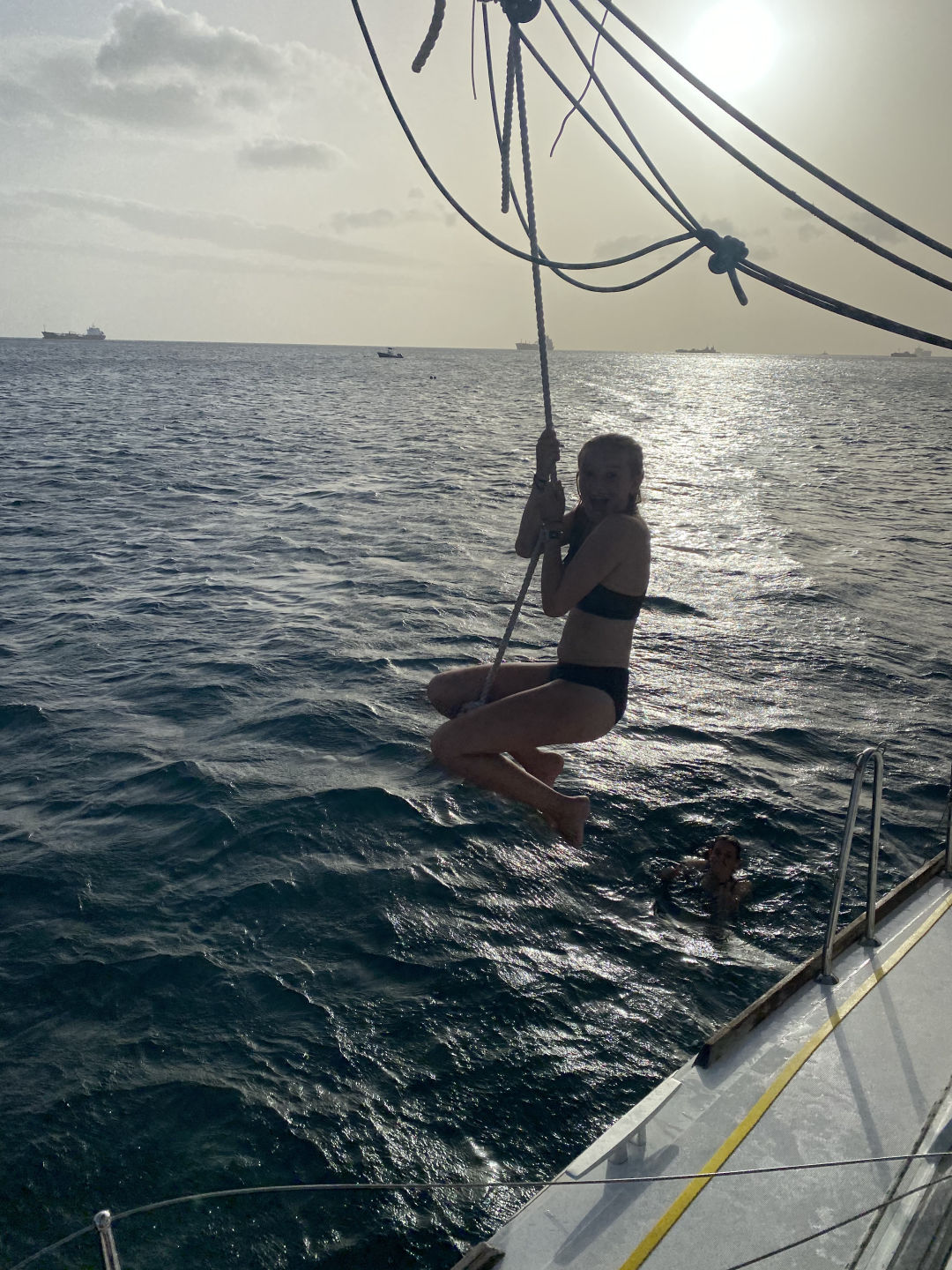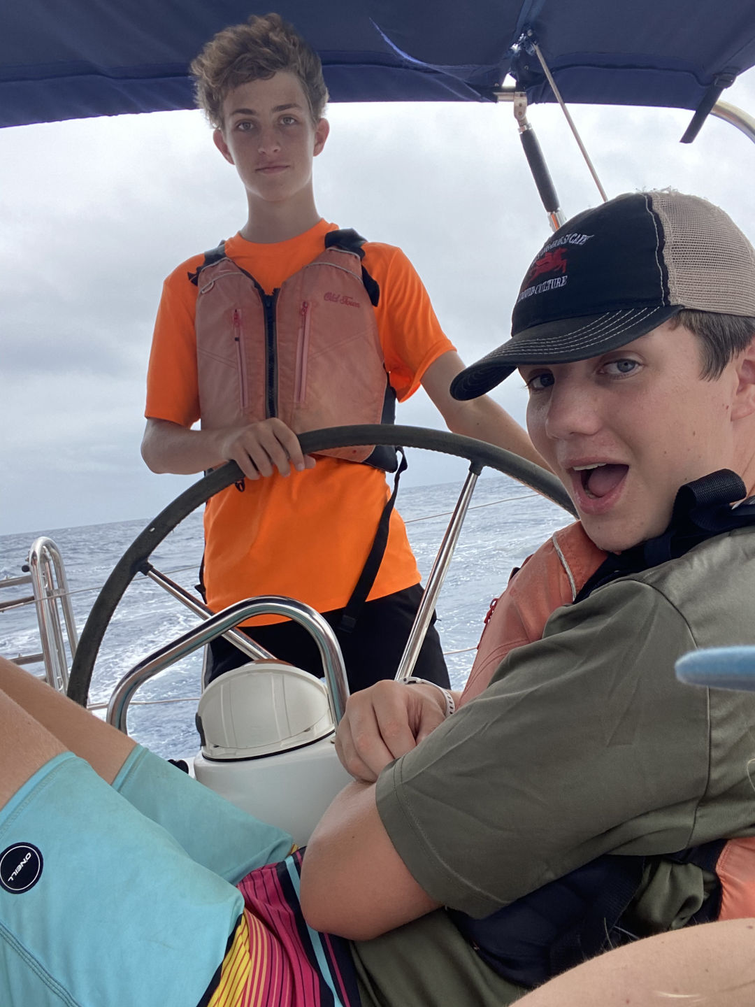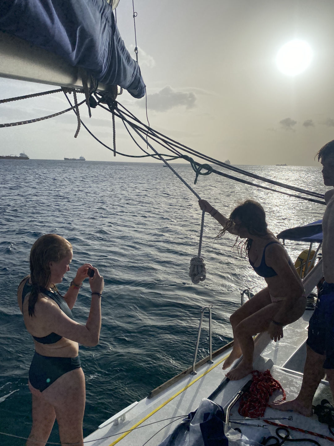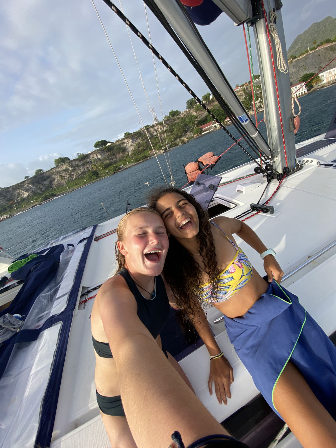 We started the day with a nice hike up Ile Fourchue. After a scramble climb to the top, there was an amazing view of the ocean and surrounding islands. Alex gained the nickname Mountain Goat for his ability to descend the mountain so quickly. Once we got back to the boat, we prepared for our passage to Statia. Underway, we experienced high winds and lots of rain, making the sail very exciting. At one point, Wombat was sailing 10 knots! After arriving at Statia, Nick cleared customs for us while the rest of us jumped into the ocean. Missy and Benzi set up a boom swing which Audrey did a flip-off. Audrey, Sophie, and Ana went snorkeling by the boat and found a very large fish which we first thought was a shark. Our chefs, Alex and Johnathan, cooked a delicious dinner of garden burgers, and Noah made Arnold Palmer. After clean up, we hung out on the bow and went to bed early for a full day tomorrow.