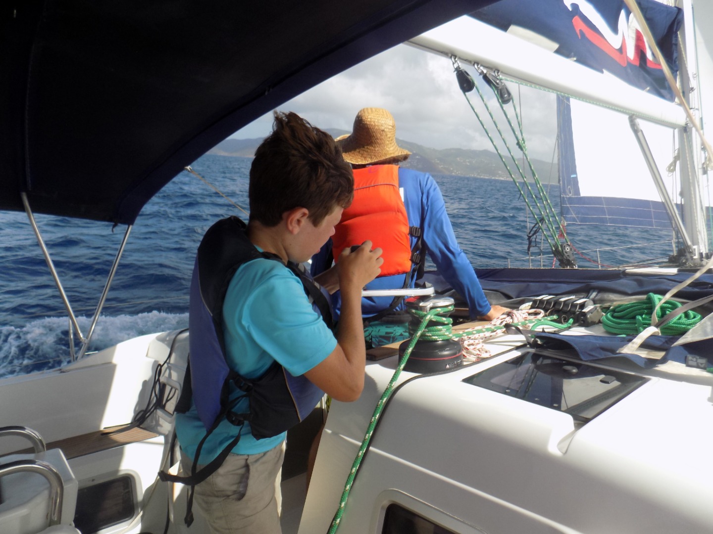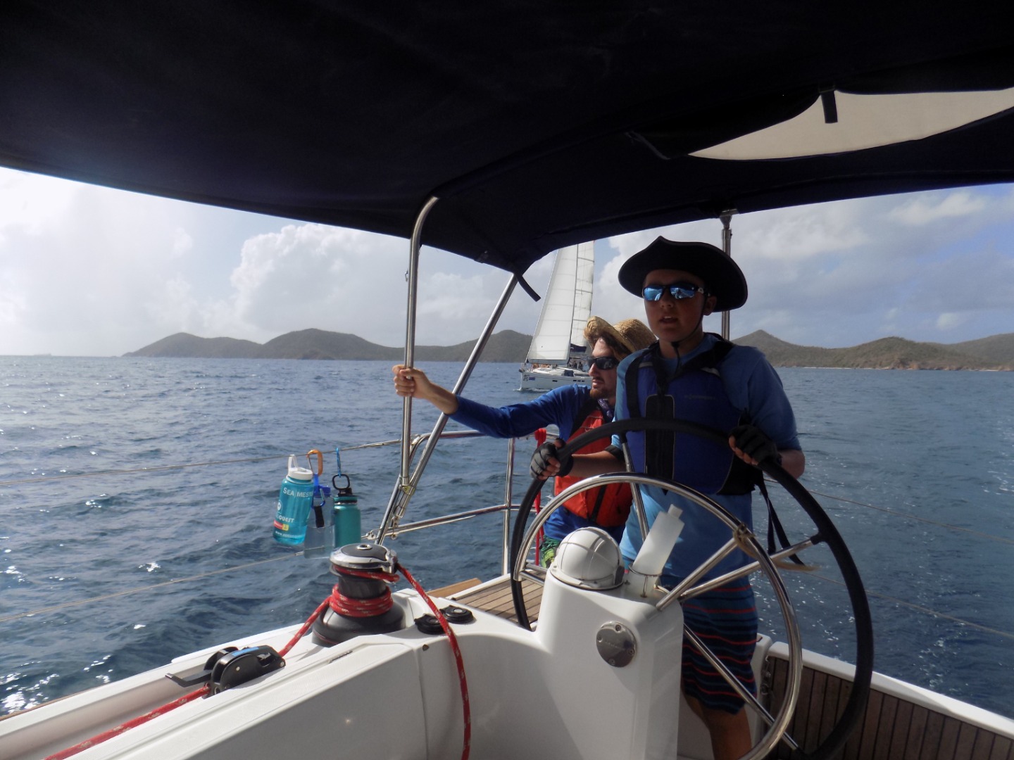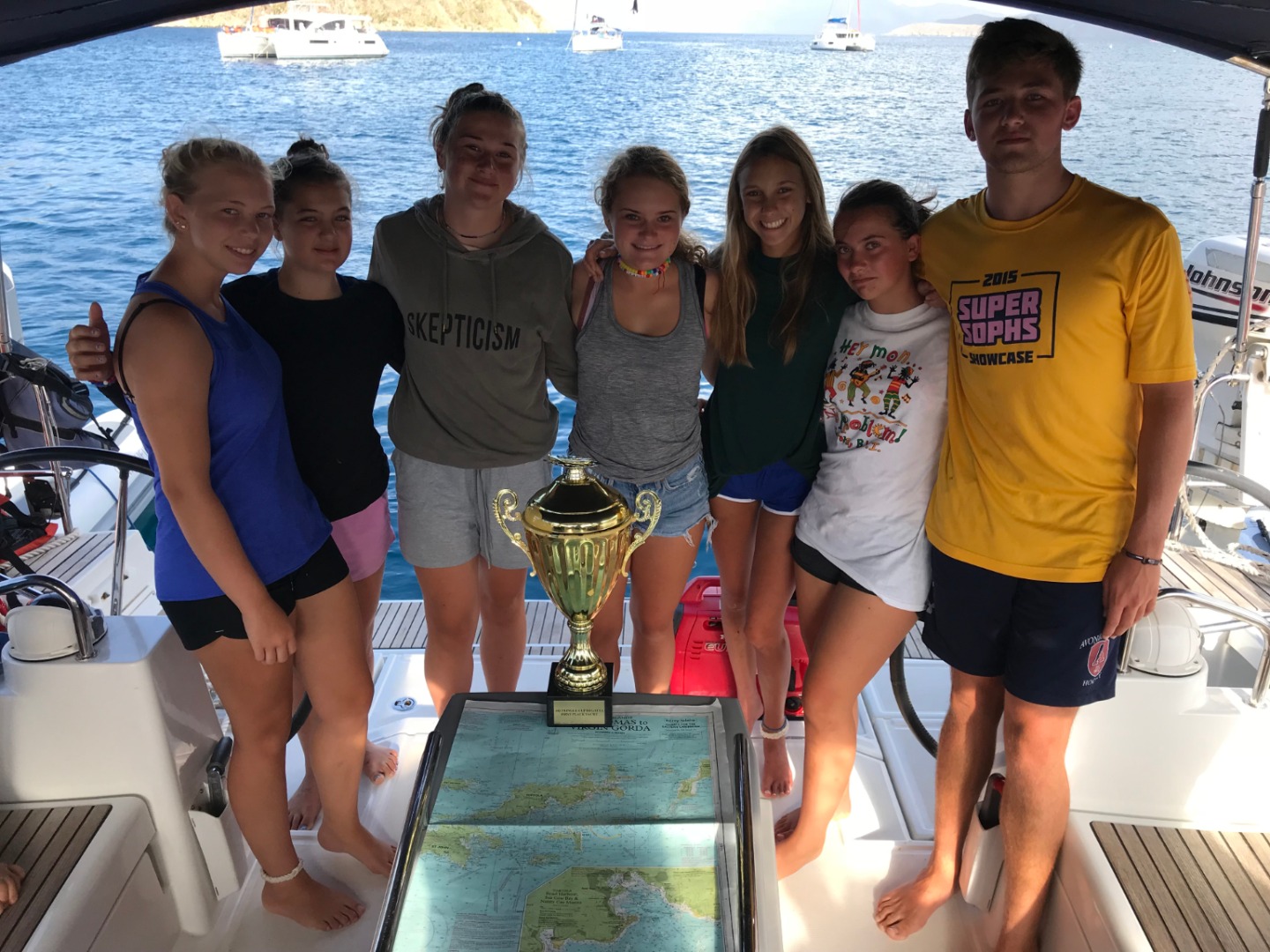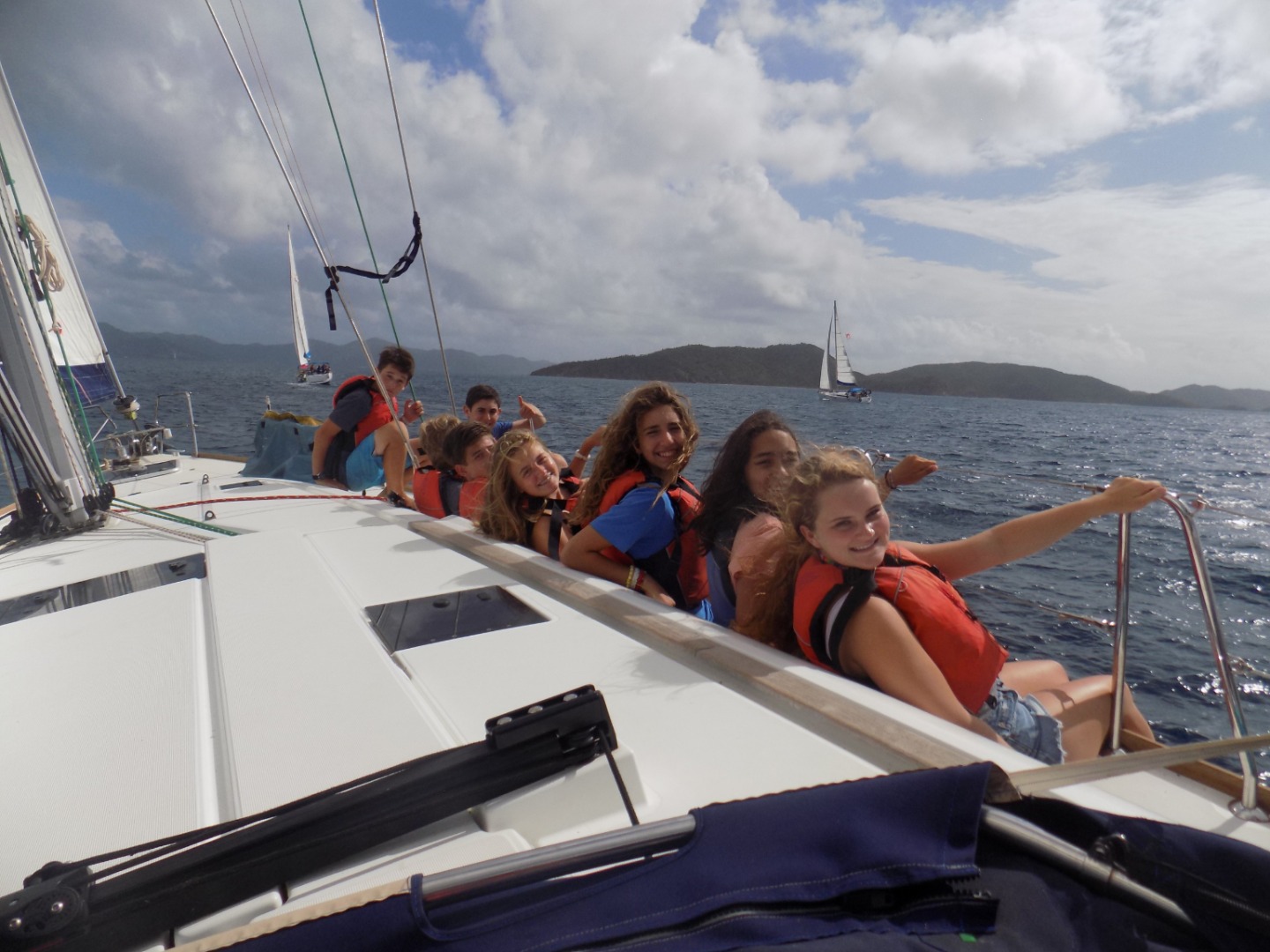 Today was a sweaty one! We woke up at 6:30 to a beautiful sky. We ate oatmeal for breakfast to get energized for our final race. After breakfast, the skippers from all the boats had a meeting on Mike’s boat to discuss the race. We got sixth place in the race but it was still a great time. From the finish line of the race near Peter Island to West End we have been cleaning the boat and working so hard. We had a mega-snack time to try and finish all of our food. After we finish every nook and cranny of Sans Souci, we will get shore time in West End before our final BBQ. We will be saying our final goodbyes and having one last great night. We are all very sad to be leaving and we had an amazing time.