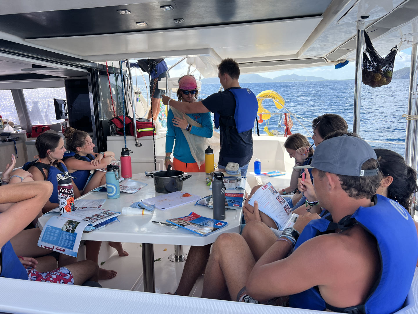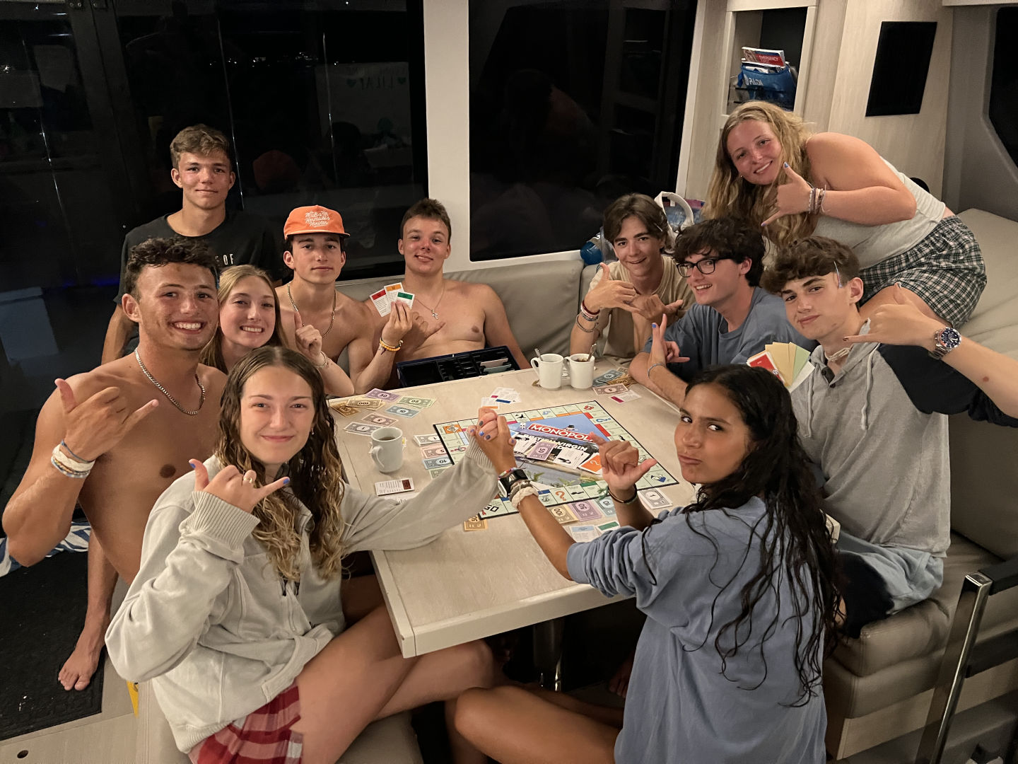 After that absolute blast of a dive, we headed out again. However, This time, we had our sails set toward Musk Melon, a super beautiful island with a reef right off its tiny rocky beach. Much to our excitement, once we had arrived, we were told that whoever wanted to go for a night dive had the option to do so after we finished our emergency o2 provider workbook and after we had all snorkeled what would be our dive site. After we had done both of those things, we had another banger meal which was the notably popular chili. After we all had pigged out, we went to the bow to watch the sunset and do the titanic pose before Grace, Daria, Daniel, Oliver, Player, and I got our dive gear on for the highly anticipated night dive. Right when we got down and swam over to the reef, we saw a ton of cool stuff. By the time we had finished the dive, we had seen an eel, a massive grouper, some tarpon, and a lionfish, and Player even pointed out an octopus. It was a super memorable dive to close out the day, and now as I write this, everyone is playing the BVI edition of Monopoly on the blue lagoon. Today was definitely the top 1 dive day of all time for me personally. I know we’re all hyped for what tomorrow will bring.