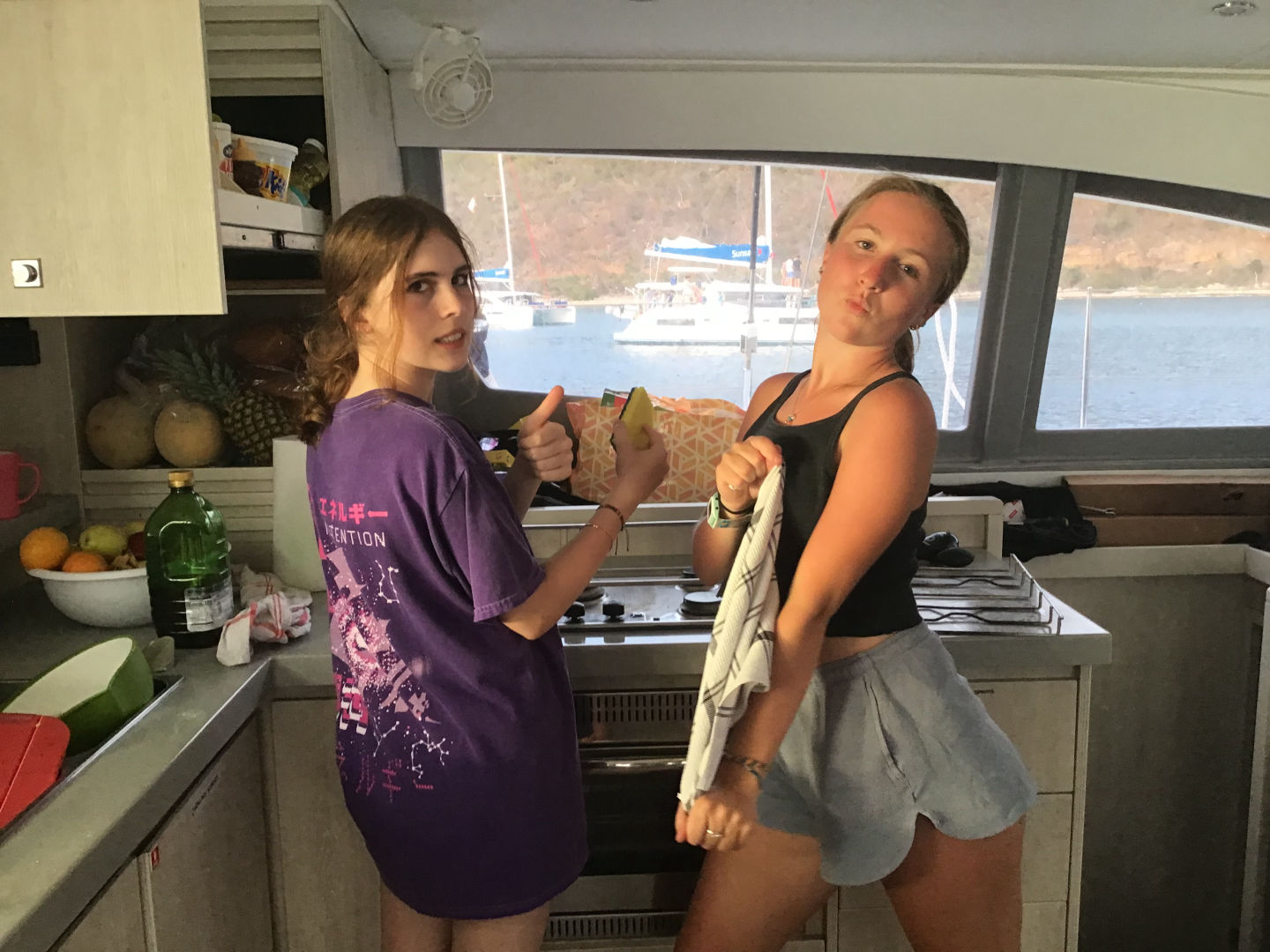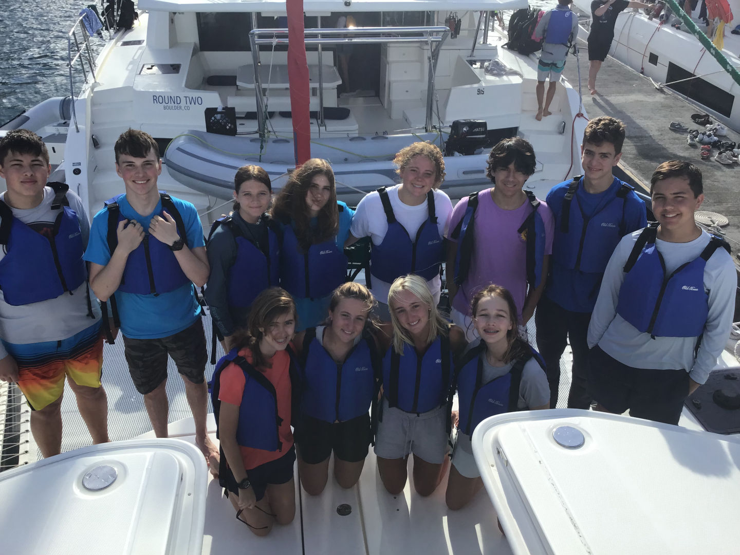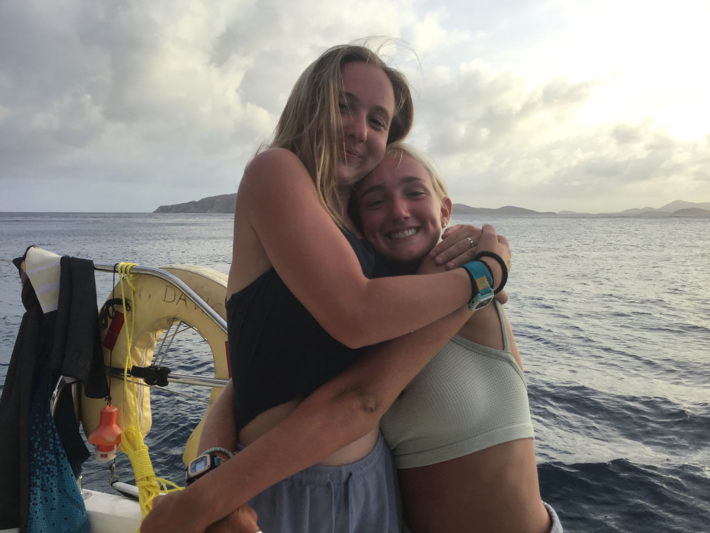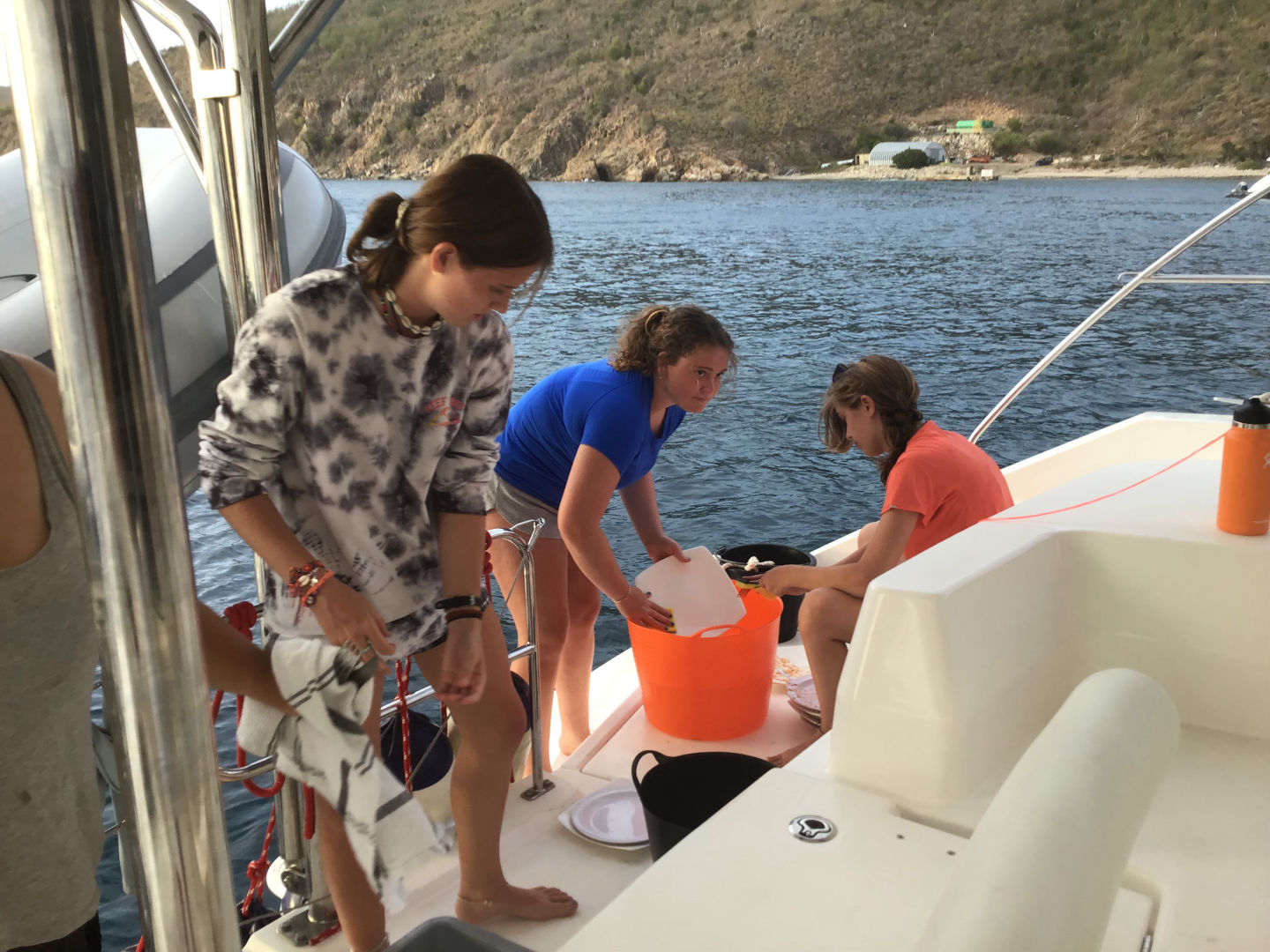 Day one started off with an early morning wake-up due to the roosters on the dock. We packed up the hammocks to prepare for our sail to Peter Island. The whole team sat on the trampoline at the front of the boat and got soaked by the waves. Later on, we arrived at Peter Island and refreshed our dive gear setup skills. We then performed a swim test which everyone passed. When we got out of the water, we put our dive gear on and hopped right back in. We refreshed our memories of what we learned in our previous course. Half our team saw a stingray, and Daisy and Sally had a play fight underwater. Then we took our first ocean shower, where some of us (Josh, Megan, and Alaina) even flipped off the boat. We then dried off for dinner. Dinner was sloppy Joe’s made by Martina and Sally with the help of Alaina. After dinner, our minds were put to solving the mystery of the black substance that’s made its way onto every surface of the boat. Its origin was never found. Stay tuned. The two deckies of the day (charged with cleaning the deck), Kai and Daisy, swept it all off the deck, providing us with a great end to the day.