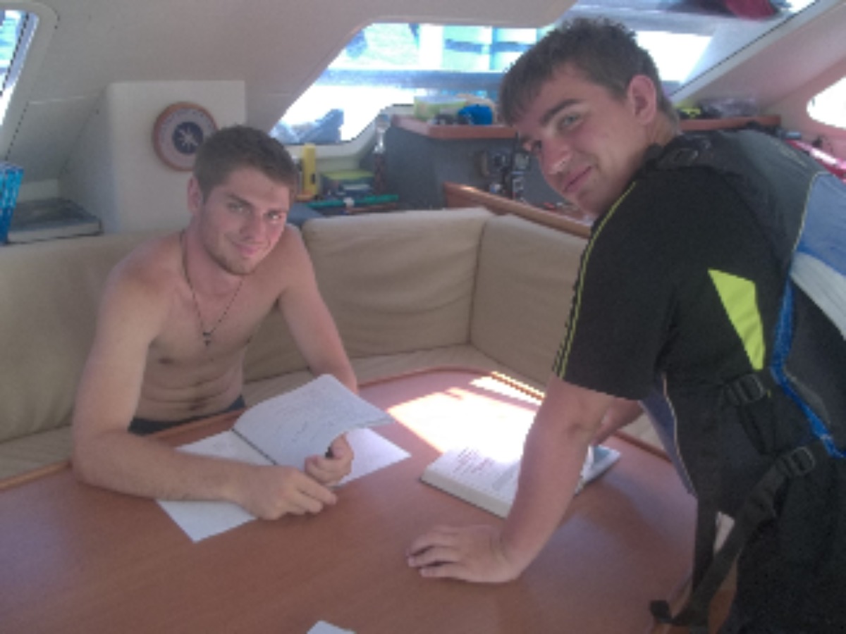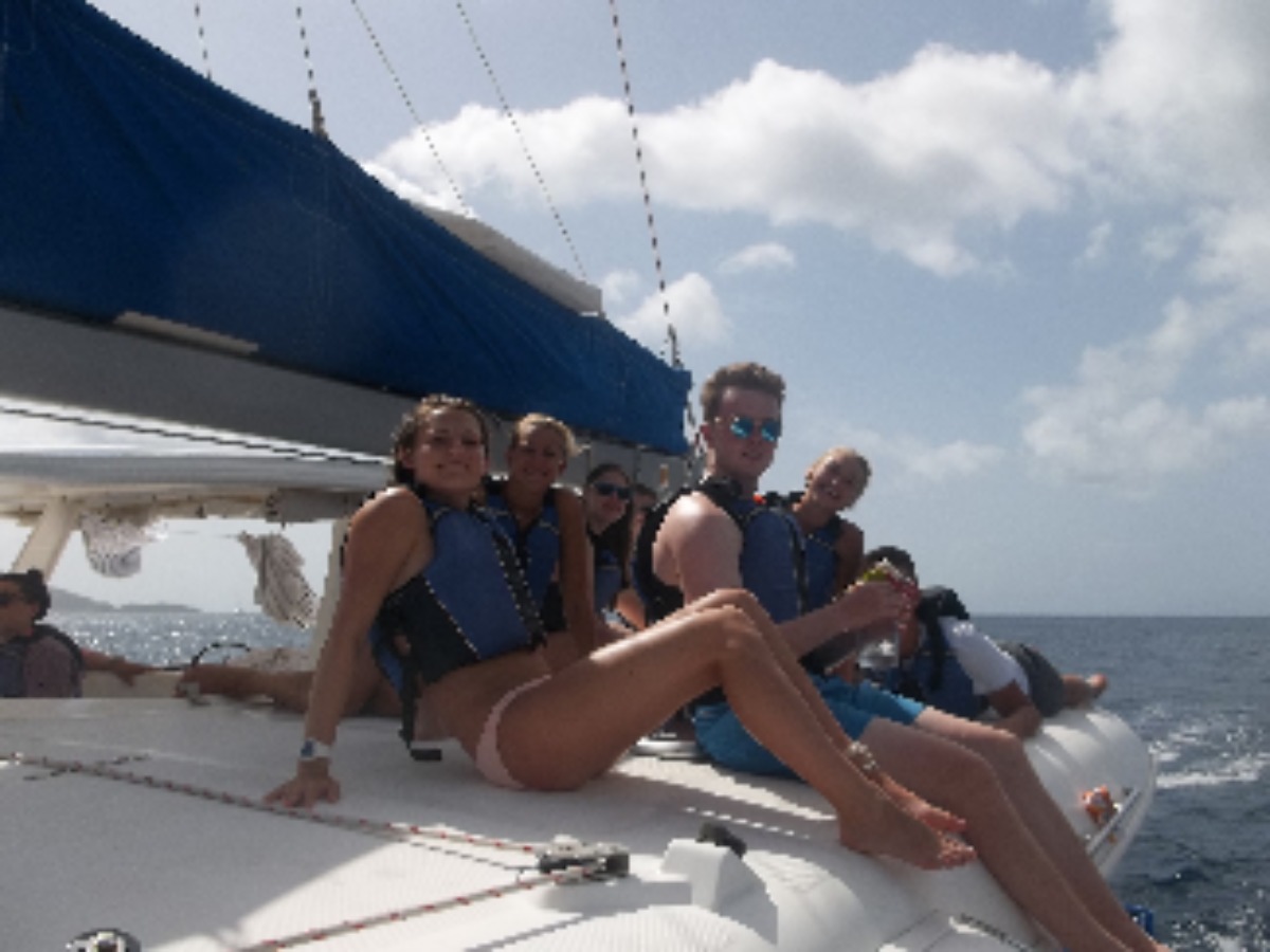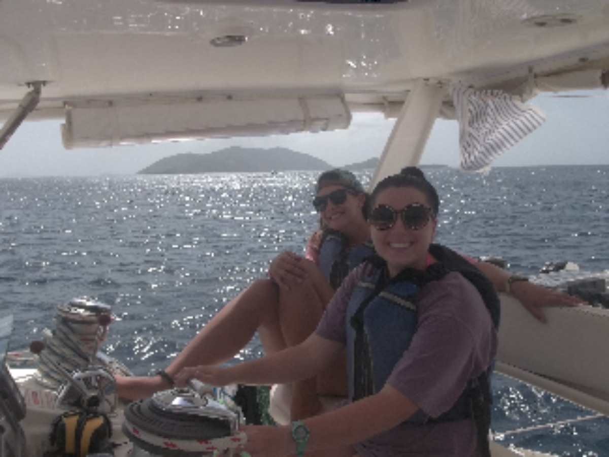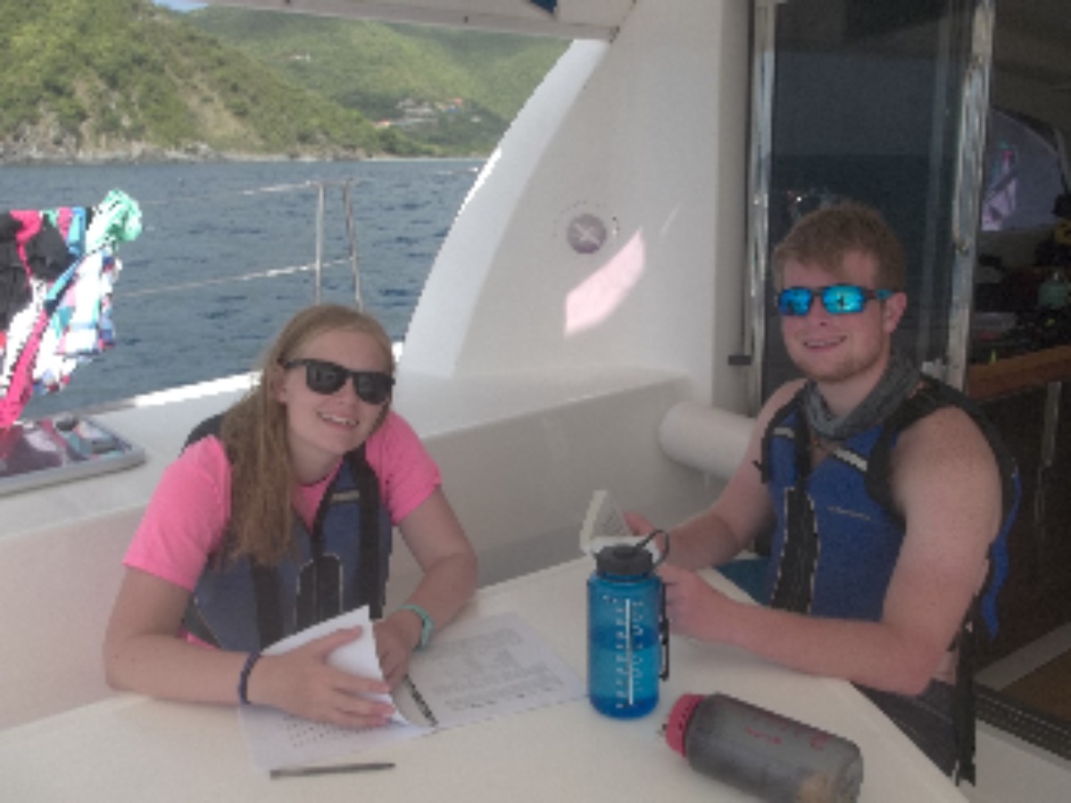 Another beautiful day has come and gone in the BVI’s and we are already 2/3 of the way through our trip! This morning we motored over to beautiful Brewer’s Bay while enjoying oatmeal and fresh fruit for breakfast. After cleanup, we dove the Pinnacles and Shark Point where the dolphin students collected more data for their research projects. These were some of the most amazing dives of the trip! We saw lionfish, porcupine fish, a gargantuan lobster and squid galore! Next, McKenna and Jackson made us all delicious quesadillas for lunch that we scarfed down. Then the dolphins continued working on their fish ID books and dolphin quizzes while the Neptunes took a much-deserved rest. After everyone’s siestas, study time, and turtle tagging, we motored over to Cane Garden Bay to refill our water tanks and have dinner – Thai peanut chicken – with our best bud Sam, who is so kind for fixing our beloved vessel all the time! The day is now winding down with a boat dance party to another “Tropics” and a movie. This trip is flying by and our boat is growing closer every day.