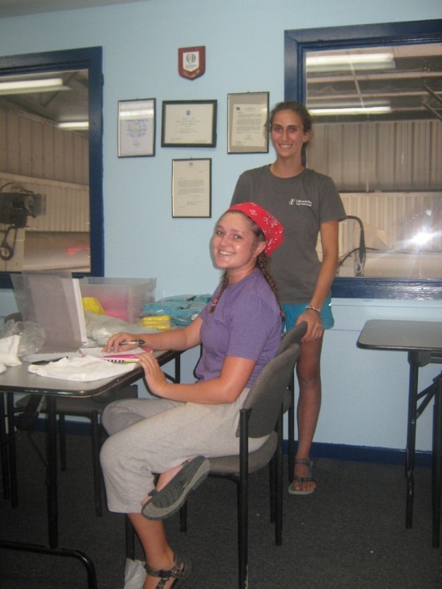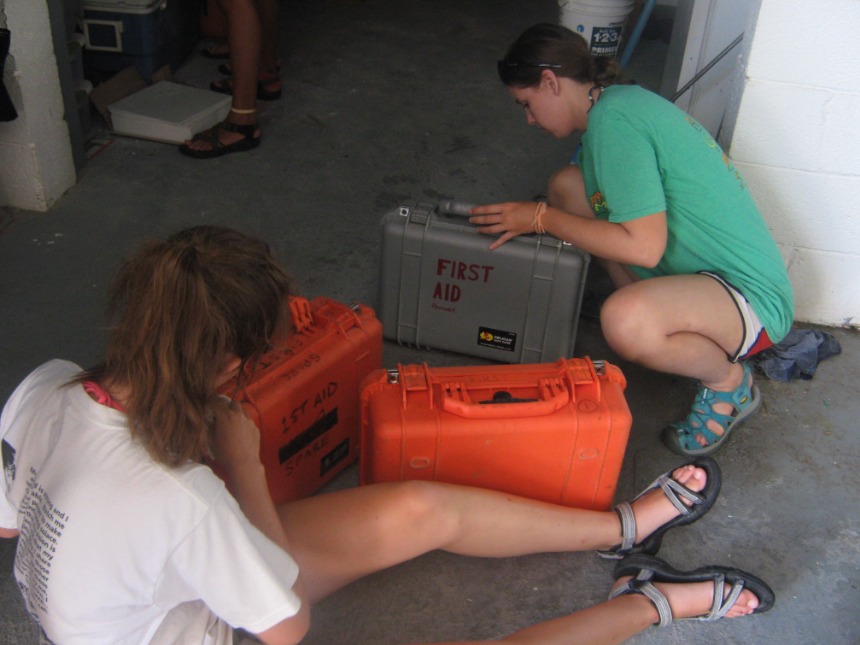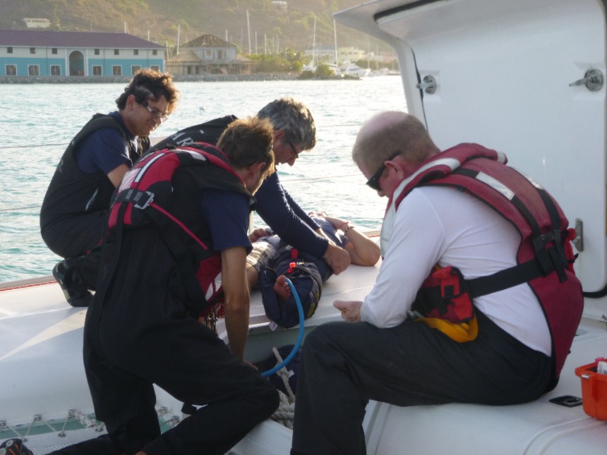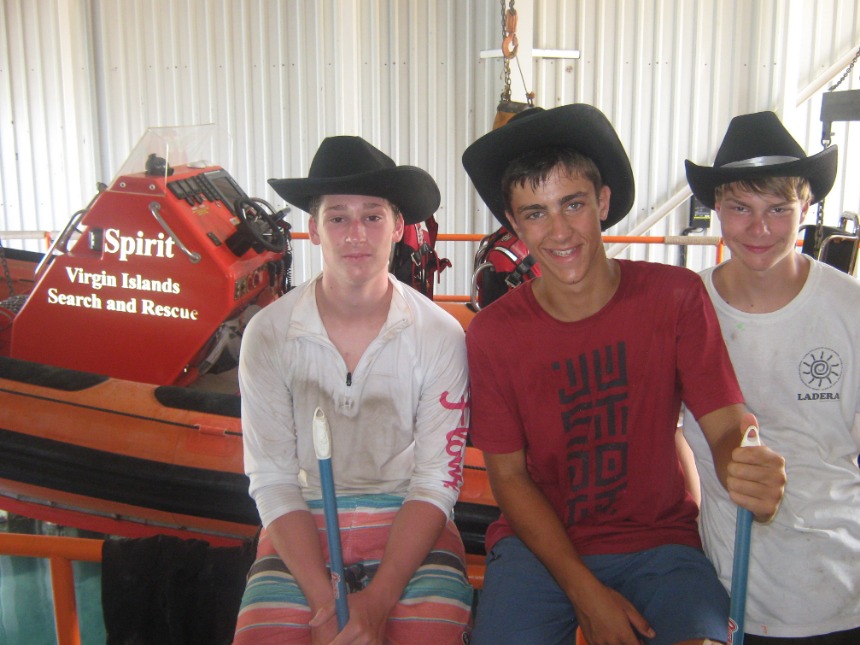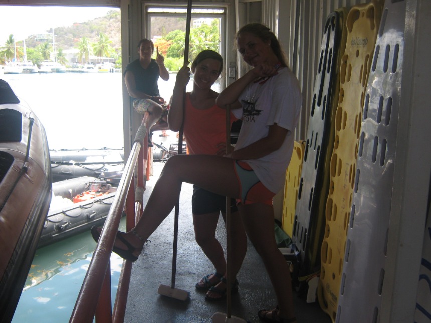 Today started at a relaxed pace with a french toast breakfast en route to Road Town. Once in Road Town, we headed over to the Virgin Islands Search and Rescue Headquarters. At the VISAR HQ, Nigel informed us about the various operations and jobs that VISAR does. We then spent the rest of the day working at the VISAR HQ, helping at the non-profit volunteer organization. We cleaned the boat garage and the boat, moved furniture and metal beams around, sorted merchandise, and dredged the boat launch. After a quick Ramen noodle lunch, everyone got back to work cleaning the place up, moving things around, organizing, and dredging. After working at VISAR for most of the day, we docked at the Moorings Charters headquarters and took a real shower for the first time in three weeks. After we showered, everyone from both boats gathered on Kes Kat, where Elliot announced that we were going to be a part of a VISAR training mission. Elliot chose Caroline to be the injured victim for VISAR. Jamie did an incredible job drawing bruises and scratches on Caroline’s leg that was “broken,” while Claire and I made a fake passport and threw together a day pack for the VISAR training. VISAR then took us out on their boat and drove us around at speeds up to 45 miles per hour, which was really fun. After the VISAR training, David and Elliot picked up pizza for dinner. We ate on the way to the anchorage on Peter Island and moored the boats in the dark.